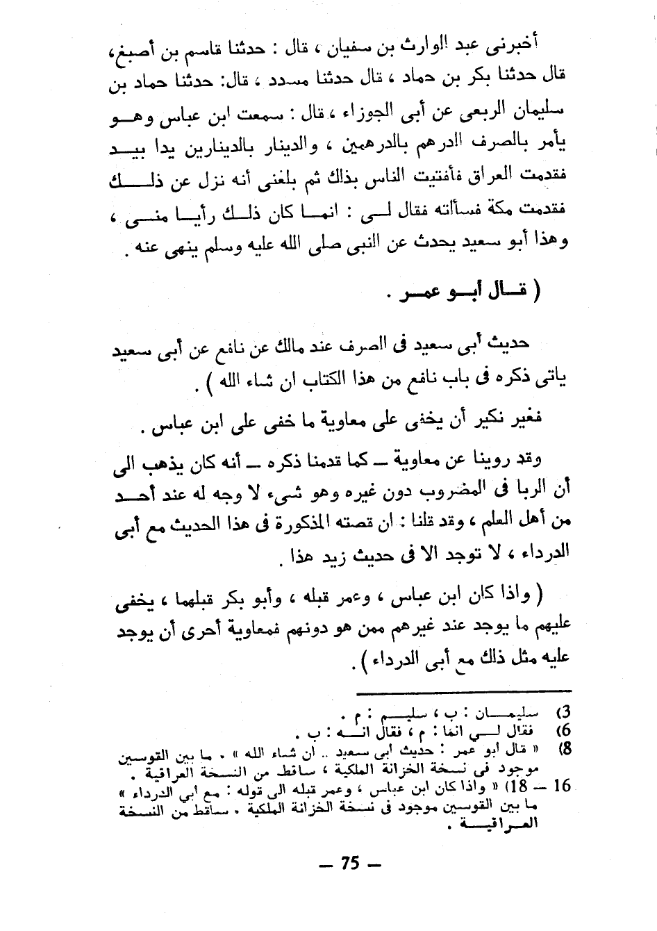أَخْبَرَنِي عَبْدُ الْوَارِثِ بْنُ سُفْيَانَ قَالَ حَدَّثَنَا قَاسِمُ بْنُ أَصْبَغَ قَالَ حَدَّثَنَا بَكْرُ بْنُ حَمَّادٍ قَالَ حَدَّثَنَا مُسَدَّدٌ قَالَ حَدَّثَنَا حَمَّادُ بْنُ سُلَيْمَانَ الرَّبَعِيُّ عَنْ أَبِي الْجَوْزَاءِ قَالَ سَمِعْتُ ابْنَ عَبَّاسٍ وَهُوَ يَأْمُرُ بِالصَّرْفِ الدِّرْهَمَ بِالدِّرْهَمَيْنِ وَالدِّينَارَ بِالدِّينَارَيْنِ يَدًا بِيَدٍ فَقَدِمْتُ الْعِرَاقَ فَأَفْتَيْتُ النَّاسَ بِذَلِكَ ثُمَّ بَلَغَنِي أَنَّهُ نَزَلَ عَنْ ذَلِكَ فَقَدِمْتُ مَكَّةَ فَسَأَلْتُهُ فَقَالَ لِي إِنَّمَا كَانَ ذَلِكَ رَأْيًا مِنِّي وَهَذَا أَبُو سَعِيدٍ يُحَدِّثُ عَنِ النَّبِيِّ صَلَّى اللَّهُ عَلَيْهِ وَسَلَّمَ يَنْهَى عَنْهُ (قَالَ أَبُو عُمَرَ حَدِيثُ أَبِي سَعِيدٍ فِي الصَّرْفِ عِنْدَ مَالِكٍ عَنْ نَافِعٍ عَنْ أَبِي سَعِيدٍ يَأْتِي ذِكْرُهُ فِي بَابِ نَافِعٍ مِنْ هَذَا الْكِتَابِ إِنْ شَاءَ اللَّهُ) فَغَيْرُ نَكِيرٍ أَنْ يَخْفَى عَلَى مُعَاوِيَةَ مَا خَفِيَ عَلَى ابْنِ عَبَّاسٍ وَقَدْ رُوِّينَا عَنْ مُعَاوِيَةَ كَمَا قَدَّمْنَا ذِكْرَهُ أَنَّهُ كَانَ يَذْهَبُ إِلَى أَنَّ الرِّبَا فِي الْمَضْرُوبِ دُونَ غَيْرِهِ وَهُوَ شَيْءٌ لَا وَجْهَ لَهُ عِنْدَ أَحَدٍ مِنْ أَهْلِ الْعِلْمِ وَقَدْ قُلْنَا إِنَّ قِصَّتَهُ الْمَذْكُورَةَ فِي هَذَا الْحَدِيثِ مَعَ أَبِي الدَّرْدَاءِ لَا تُوجَدُ إِلَّا فِي حَدِيثِ زَيْدٍ هَذَا (وَإِذَا كَانَ ابْنُ عَبَّاسٍ وَعُمَرُ قَبْلَهُ وَأَبُو بَكْرٍ قَبْلَهُمَا يَخْفَى عَلَيْهِمْ مَا يُوجَدُ عِنْدَ غَيْرِهِمْ مِمَّنْ هُوَ دُونَهُمْ فَمُعَاوِيَةُ أَحْرَى أَنْ يُوجَدَ عَلَيْهِ مِثْلُ ذَلِكَ مَعَ أَبِي الدرداء)
