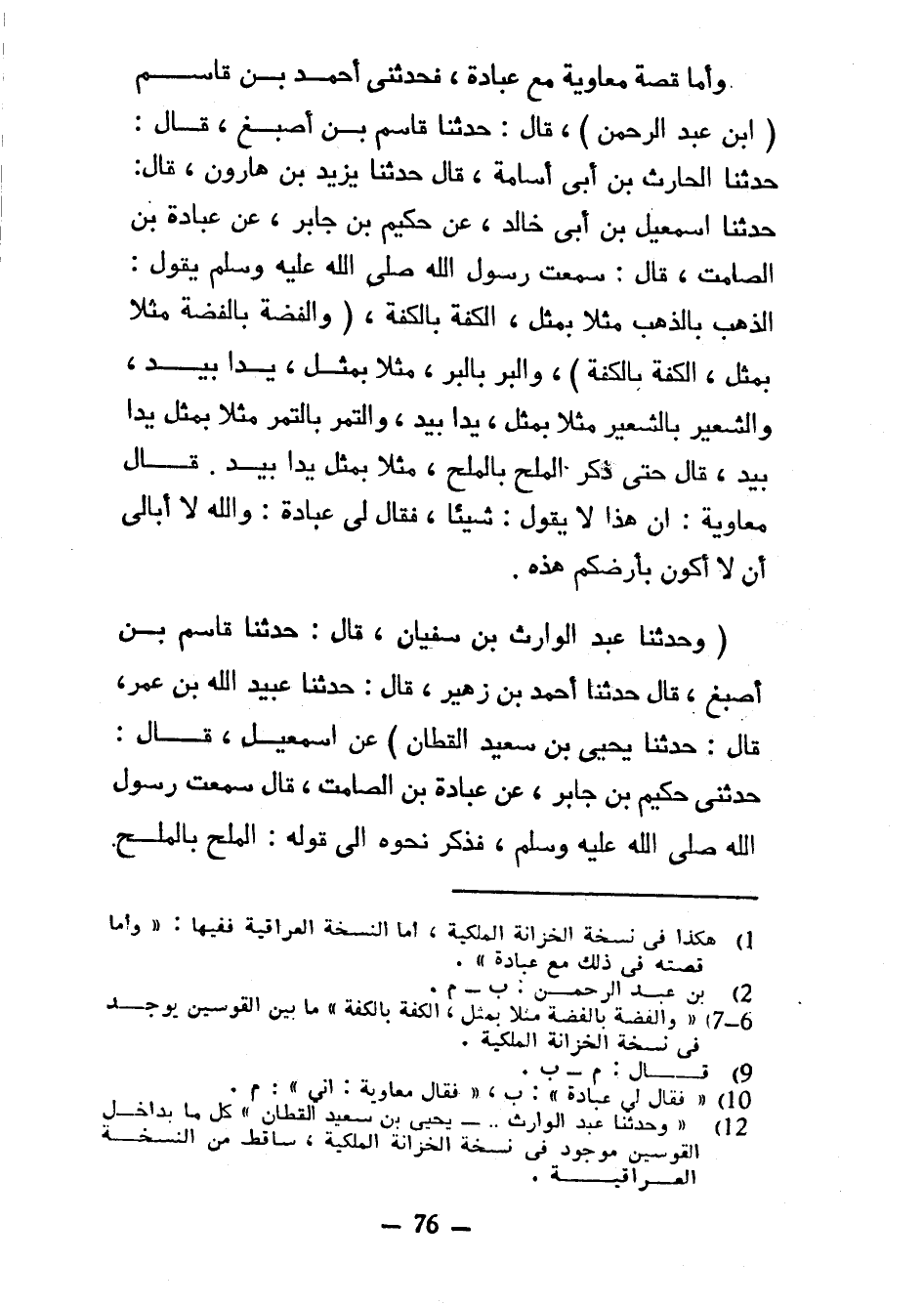 وَأَمَّا قِصَّةُ مُعَاوِيَةَ مَعَ عُبَادَةَ فَحَدَّثَنِي أَحْمَدُ بن قاسم (ابن عَبْدِ الرَّحْمَنِ) قَالَ حَدَّثَنَا قَاسِمُ بْنُ أَصْبَغَ قَالَ حَدَّثَنَا الْحَارِثُ بْنُ أَبِي أُسَامَةَ قَالَ حدثنا يزيد بن هارون قال حدثنا إسمعيل بْنُ أَبِي خَالِدٍ عَنْ حَكِيمِ بْنِ جَابِرِ عَنْ عُبَادَةَ بْنِ الصَّامِتِ قَالَ سَمِعْتُ رَسُولَ اللَّهِ صَلَّى اللَّهُ عَلَيْهِ وَسَلَّمَ يَقُولُ الذَّهَبُ بِالذَّهَبِ مِثْلًا بِمِثْلٍ الْكِفَّةُ بِالْكِفَّةِ (وَالْفِضَّةُ بِالْفِضَّةِ مِثْلًا بِمِثْلٍ الْكِفَّةُ بِالْكِفَّةِ) وَالْبُرُّ بِالْبِرِّ مِثْلًا بِمِثْلٍ يَدًا بِيَدٍ وَالشَّعِيرُ بِالشَّعِيرِ مِثْلًا بِمِثْلٍ يَدًا بِيَدٍ وَالتَّمْرُ بِالتَّمْرِ مِثْلًا بِمِثْلٍ يَدًا بِيَدٍ قَالَ حَتَّى ذَكَرَ الْمِلْحَ بِالْمِلْحِ مِثْلًا بِمِثْلٍ يَدًا بِيَدٍ قَالَ مُعَاوِيَةُ إِنَّ هَذَا لَا يَقُولُ شَيْئًا فَقَالَ لِي عُبَادَةُ وَاللَّهِ لَا أُبَالِي أَنْ لَا أَكُونَ بِأَرْضِكُمْ هَذِهِ (وَحَدَّثَنَا عَبْدُ الْوَارِثِ بْنُ سُفْيَانَ قَالَ حَدَّثَنَا قَاسِمُ بْنُ أَصْبَغَ قَالَ حَدَّثَنَا أَحْمَدُ بْنُ زُهَيْرٍ قَالَ حَدَّثَنَا عُبَيْدُ اللَّهِ بْنُ عُمَرَ قَالَ حَدَّثَنَا يَحْيَى بْنُ سَعِيدٍ الْقَطَّانُ) عَنْ إسمعيل قَالَ حَدَّثَنِي حَكِيمُ بْنُ جَابِرٍ عَنْ عُبَادَةَ بْنِ الصَّامِتِ قَالَ سَمِعْتُ رَسُولَ اللَّهِ صَلَّى اللَّهُ عَلَيْهِ وَسَلَّمَ فَذَكَرَ نَحْوَهُ إِلَى قَوْلِهِ الملح بالملح