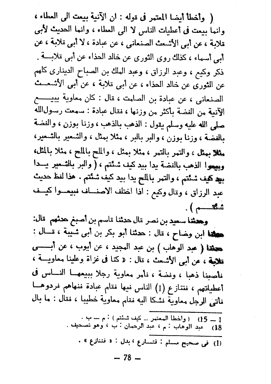 (واخطأ أيضا المعتمر فِي قَوْلِهِ إِنَّ الْآنِيَةَ بِيعَتْ إِلَى الْعَطَاءِ وَإِنَّمَا بِيعَتْ فِي أُعْطِيَّاتِ النَّاسِ لَا إِلَى الْعَطَاءِ وَإِنَّمَا الْحَدِيثُ لِأَبِي قِلَابَةَ عَنْ أَبِي الْأَشْعَثِ الصَّنْعَانِيِّ عَنْ عُبَادَةَ لَا أَبِي قِلَابَةَ عَنْ أَبِي أَسْمَاءَ كَذَلِكَ رَوَى الثَّوْرِيُّ عَنْ خَالِدٍ الْحَذَّاءِ عَنْ أَبِي قِلَابَةَ ذَكَرَ وَكِيعٌ وَعَبْدُ الرَّزَّاقِ وَعَبْدُ الْمَلِكِ بْنُ الصَّبَاحِ الدِّينَارِيُّ كُلُّهُمْ عَنِ الثَّوْرِيِّ عَنْ خَالِدٍ الْحَذَّاءِ عَنْ أَبِي قِلَابَةَ عَنْ أَبِي الْأَشْعَثِ الصَّنْعَانِيِّ عَنْ عُبَادَةَ بْنِ الصَّامِتِ قَالَ كَانَ مُعَاوِيَةُ يَبِيعُ الْآنِيَةَ مِنَ الْفِضَّةِ بِأَكْثَرِ مِنْ وَزْنِهَا فَقَالَ عُبَادَةُ سَمِعْتُ رَسُولَ اللَّهِ صَلَّى اللَّهُ عَلَيْهِ وَسَلَّمَ يَقُولُ الذَّهَبُ بِالذَّهَبِ وَزْنًا بِوَزْنٍ وَالْفِضَّةُ بِالْفِضَّةِ وَزْنًا بِوَزْنٍ وَالْبُرُّ بِالْبُرِّ مِثْلًا بِمِثْلٍ وَالشَّعِيرُ بِالشَّعِيرِ مِثْلًا بِمِثْلٍ والتمر بالتمر مثل بِمِثْلٍ وَالْمِلْحُ بِالْمِلْحِ مِثْلًا بِالْمِثْلِ وَبِيعُوا الذَّهَبَ بالفضة يدا بيد كيف شئتم (والبر بالشعير يدا بيد كيف شئتم والتمر بالملح يدا بِيَدٍ كَيْفَ شِئتُمْ هَذَا لَفْظُ حَدِيثِ عَبْدِ الرَّزَّاقِ وَقَالَ وَكِيعٌ إِذَا اخْتَلَفَ الْأَصْنَافُ فَبِيعُوا كيف شئتم) وَحَدَّثَنَا سَعِيدُ بْنُ نَصْرٍ قَالَ حَدَّثَنَا قَاسِمُ بْنَ أَصْبَغَ حَدَّثَهُمْ قَالَ حَدَّثَنَا ابْنُ وَضَّاحٍ قَالَ حَدَّثَنَا أَبُو بَكْرِ بْنُ أَبِي شَيْبَةَ قَالَ حَدَّثَنَا (عَبْدُ الْوَهَّابِ) بْنُ عَبْدِ الْمَجِيدِ عَنْ أَيُّوبَ عَنْ أَبِي قِلَابَةَ عَنْ أَبِي الْأَشْعَثِ قَالَ كُنَّا فِي غَزَاةٍ وَعَلَيْنَا مُعَاوِيَةُ فَأَصَبْنَا ذَهَبًا وَفِضَّةً فَأَمَرَ مُعَاوِيَةُ رَجُلًا بِبَيْعِهَا النَّاسَ فِي أُعْطِيَّاتِهِمْ فَتَنَازَعَ النَّاسُ فِيهَا فَقَامَ عُبَادَةُ فَنَهَاهُمْ فَرَدُّوهَا فَأْتَى الرَّجُلُ مُعَاوِيَةَ فَشَكَا إِلَيْهِ فَقَامَ مُعَاوِيَةُ خَطِيبًا فَقَالَ ما بال