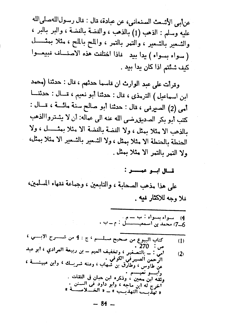 عَنْ أَبِي الْأَشْعَثِ الصَّنْعَانِيِّ عَنْ عُبَادَةَ قَالَ قَالَ رَسُولُ اللَّهِ صَلَّى اللَّهُ عَلَيْهِ وَسَلَّمَ الذَّهَبُ بِالذَّهَبِ وَالْفِضَّةُ بِالْفِضَّةِ وَالْبُرُّ بِالْبُرِّ وَالشَّعِيرُ بِالشَّعِيرِ وَالتَّمْرُ بِالتَّمْرِ وَالْمِلْحُ بِالْمِلْحِ مِثْلًا بِمِثْلٍ (سَوَاءٌ بِسَوَاءٍ) يَدًا بِيَدٍ فَإِذَا اخْتَلَفَتْ هَذِهِ الْأَصْنَافُ فَبِيعُوا كَيْفَ شِئْتُمْ إذا كان يدا بِيَدٍ وَقَرَأْتُ عَلَى عَبْدِ الْوَارِثِ أَنَّ قَاسِمًا حدثهم قال حدثنا (محمد ابن إِسْمَاعِيلَ) التِّرْمِذِيُّ قَالَ حَدَّثَنَا أَبُو نُعَيْمٍ قَالَ حَدَّثَنَا أُمَيٌّ الصَّيْرَفِيُّ قَالَ حَدَّثَنَا أَبُو صَالِحٍ سَنَةَ مِائَةٍ قَالَ كَتَبَ أَبُو بَكْرٍ الصِّدِّيقُ رَضِيَ اللَّهُ عَنْهُ إِلَى عُمَّالِهِ أَنْ لَا يَشْتَرُوا الذَّهَبَ بِالذَّهَبِ إِلَّا مِثْلًا بِمِثْلٍ وَلَا الْفِضَّةَ بِالْفِضَّةِ إِلَّا مِثْلًا بِمِثْلٍ وَلَا الْحِنْطَةَ بِالْحِنْطَةِ إِلَّا مِثْلًا بِمِثْلٍ وَلَا الشَّعِيرَ بِالشَّعِيرِ إِلَّا مِثْلًا بِمِثْلٍ وَلَا التَّمْرَ بِالتَّمْرِ إِلَّا مِثْلًا بِمِثْلٍ قَالَ أَبُو عُمَرَ عَلَى هَذَا مَذْهَبُ الصَّحَابَةِ وَالتَّابِعِينَ وَجَمَاعَةِ فُقَهَاءِ الْمُسْلِمِينَ فَلَا وَجْهَ لِلْإِكْثَارِ فِيهِ