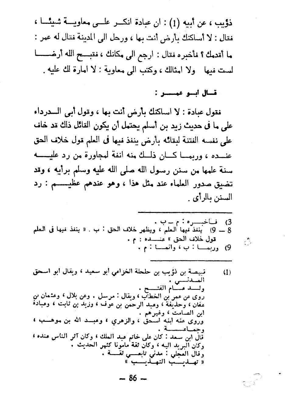 ذُؤَيْبٍ عَنْ أَبِيهِ أَنَّ عُبَادَةَ أَنْكَرَ عَلَى مُعَاوِيَةَ شَيْئًا فَقَالَ لَا أُسَاكِنُكَ بِأَرْضٍ أَنْتَ بِهَا وَرَحَلَ إِلَى الْمَدِينَةِ فَقَالَ لَهُ عُمَرُ مَا أَقْدَمَكَ فَأَخْبَرَهُ فَقَالَ ارْجِعْ إِلَى مَكَانِكَ فَقَبَّحَ اللَّهُ أَرْضًا لَسْتَ فِيهَا وَلَا أَمْثَالُكَ وَكَتَبَ إِلَى مُعَاوِيَةَ لَا إِمَارَةَ لَكَ عَلَيْهِ قَالَ أَبُو عُمَرَ فَقَوْلُ عُبَادَةَ لَا أُسَاكِنُكَ بِأَرْضٍ أَنْتَ بِهَا وَقَوْلُ أَبِي الدَّرْدَاءِ عَلَى ما في حديث زيد ابن أَسْلَمَ يُحْتَمَلُ أَنْ يَكُونَ الْقَائِلُ ذَلِكَ قَدْ خَافَ عَلَى نَفْسِهِ الْفِتْنَةَ لِبَقَائِهِ بِأَرْضٍ يُنَفَّذُ فِيهَا فِي الْعِلْمِ قَوْلٌ خِلَافَ الْحَقِّ عِنْدَهُ وَرُبَّمَا كَانَ ذَلِكَ مِنْهُ أَنَفَةً لِمُجَاوَرَةِ مَنْ رَدَّ عَلَيْهِ سُنَّةً عَلِمَهَا مِنْ سُنَنِ رَسُولِ اللَّهِ صَلَّى اللَّهُ عَلَيْهِ وَسَلَّمَ بِرَأْيهِ وَقَدْ تَضِيقُ صُدُورُ الْعُلَمَاءِ عِنْدَ مِثْلِ هَذَا وَهُوَ عندهم عظيم رد السنن بالرأي