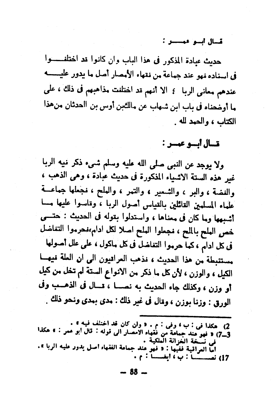 قَالَ أَبُو عُمَرَ حَدِيثُ عُبَادَةَ الْمَذْكُورُ فِي هَذَا الْبَابِ وَإِنْ كَانُوا قَدِ اخْتَلَفُوا فِي إِسْنَادِهِ فَهُوَ عِنْدَ جَمَاعَةٍ مِنْ فُقَهَاءِ الْأَمْصَارِ أَصْلُ مَا يَدُورُ عَلَيْهِ عِنْدَهُمْ مَعَانِي الرِّبَا إِلَّا أَنَّهُمْ قَدِ اخْتَلَفَتْ مَذَاهِبُهُمْ فِي ذَلِكَ عَلَى مَا أَوْضَحْنَاهُ فِي بَابِ ابْنِ شِهَابٍ عَنْ مَالِكِ بْنِ أَوْسِ بْنِ الْحَدَثَانِ مِنْ هَذَا الْكِتَابِ وَالْحَمْدُ لِلَّهِ قَالَ أَبُو عُمَرَ وَلَا يُوجَدُ عَنِ النَّبِيِّ صَلَّى اللَّهُ عَلَيْهِ وَسَلَّمَ شَيْءٌ ذُكِرَ فِيهِ الرِّبَا غَيْرَ هَذِهِ السِّتَّةِ الْأَشْيَاءِ الْمَذْكُورَةِ فِي حَدِيثِ عُبَادَةَ وَهِيَ الذَّهَبُ وَالْفِضَّةُ وَالْبُرُّ وَالشَّعِيرُ وَالتَّمْرُ وَالْمِلْحُ فَجَعَلَهَا جَمَاعَةُ عُلَمَاءِ الْمُسْلِمِينَ الْقَائِلِينَ بِالْقِيَاسِ أَصُولُ الرِّبَا وَقَاسُوا عَلَيْهَا مَا أَشْبَهَهَا وَمَا كَانَ فِي مَعْنَاهَا وَاسْتَدَلُّوا بِقَوْلِهِ فِي الْحَدِيثِ حَتَّى خَصَّ الْمِلْحَ بِالْمِلْحِ فَجَلَعُوا الْمِلْحَ أَصْلًا لِكُلِّ إِدَامٍ فَحَرَّمُوا التَّفَاضُلَ فِي كُلِّ إِدَامٍ كَمَا حَرَّمُوا التَّفَاضُلَ فِي كُلِّ مَأْكُولٍ عَلَى عِلَلِ أُصُولِهَا مُسْتَنْبَطَةً مِنْ هَذَا الْحَدِيثِ فَذَهَبَ الْعِرَاقِيُّونَ إِلَى أَنَّ الْعِلَّةَ فِيهَا الْكَيْلُ وَالْوَزْنُ لِأَنَّ كُلَّ مَا ذُكِرَ مِنَ الْأَنْوَاعِ السِّتَّةِ لَمْ تَخْلُ مِنْ كَيْلٍ أَوْ وَزْنِ وَكَذَلِكَ جَاءَ الْحَدِيثُ بِهِ نَصًّا قَالَ فِي الذَّهَبِ وَفِي الْوَرِقِ وزنا بوزن وقال في غير ذلك مدى بمدى ونحو ذلك
