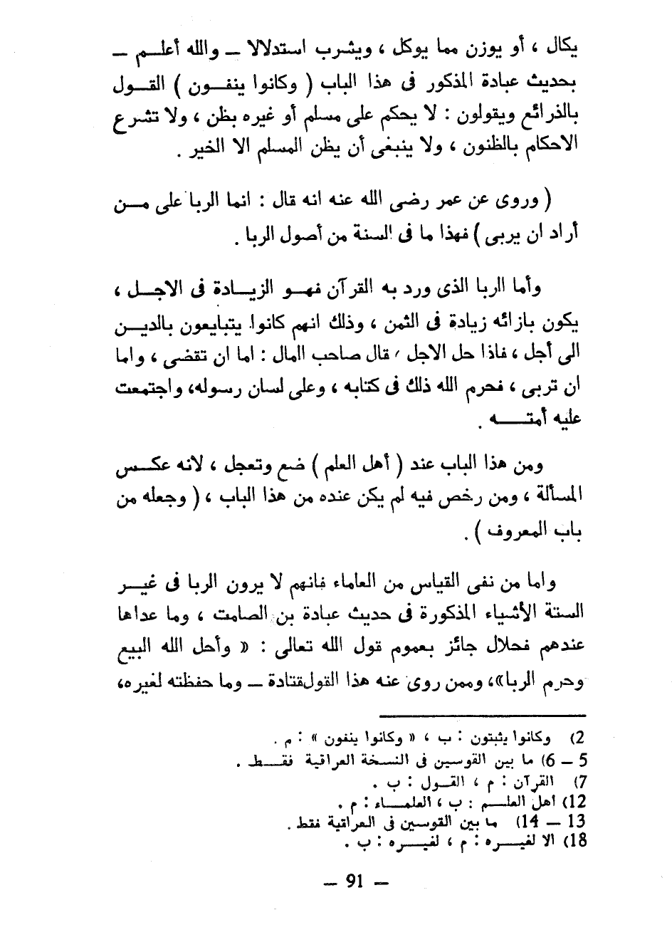 يكال أو يوزن مما يوكل وَيُشْرَبُ اسْتِدْلَالًا وَاللَّهُ أَعْلَمُ بِحَدِيثِ عُبَادَةَ الْمَذْكُورِ فِي هَذَا الْبَابِ (وَكَانُوا يَنْفُونَ) الْقَوْلَ بِالذَّرَائِعِ وَيَقُولُونَ لَا يُحْكَمُ عَلَى مُسْلِمٍ أَوْ غَيْرِهِ بِظَنٍّ وَلَا تُشْرَعُ الْأَحْكَامُ بِالظُّنُونِ وَلَا يَنْبَغِي أَنْ يَظُنَّ الْمُسْلِمُ إِلَّا الْخَيْرَ (وَرُوِيَ عَنْ عُمَرَ رَضِيَ اللَّهُ عَنْهُ أَنَّهُ قَالَ إِنَّمَا الرِّبَا عَلَى مَنْ أَرَادَ أَنْ يُرْبِي) فَهَذَا مَا فِي السُّنَّةِ مِنْ أُصُولِ الرِّبَا وَأَمَّا الرِّبَا الَّذِي وَرَدَ بِهِ الْقُرْآنُ فَهُوَ الزِّيَادَةُ فِي الْأَجَلِ يَكُونُ بِإِزَائِهِ زِيَادَةٌ فِي الثَّمَنِ وَذَلِكَ أَنَّهُمْ كَانُوا يَتَبَايَعُونَ بِالدَّيْنِ إِلَى أَجَلٍ فَإِذَا حَلَّ الْأَجَلُ قَالَ صَاحِبُ الْمَالِ إِمَّا أَنْ تَقْضِيَ وَإِمَّا أَنْ تُرْبِيَ فَحَرَّمَ اللَّهُ ذَلِكَ فِي كِتَابِهِ وَعَلَى لِسَانِ رَسُولِهِ وَاجْتَمَعَتْ عَلَيْهِ أُمَّتُهُ وَمِنْ هَذَا الْبَابِ عِنْدَ (أَهْلِ العلم) ضع وَتَعَجُّلٌ لِأَنَّهُ عَكْسُ الْمَسْأَلَةِ وَمَنْ رَخَّصَ فِيهِ لَمْ يَكُنْ عِنْدَهُ مِنْ هَذَا الْبَابِ (وَجَعَلَهُ مِنْ بَابِ الْمَعْرُوفِ) وَأَمَّا مَنْ نَفَى الْقِيَاسَ مِنَ الْعُلَمَاءِ فَإِنَّهُمْ لَا يَرَوْنَ الرِّبَا فِي غَيْرِ السِّتَّةِ الْأَشْيَاءِ الْمَذْكُورَةِ فِي حَدِيثِ عُبَادَةَ بْنِ الصَّامِتِ وَمَا عَدَاهَا عِنْدَهُمْ فَحَلَالٌ جَائِزٌ بِعُمُومِ قَوْلِ اللَّهِ تَعَالَى وَأَحَلَّ اللَّهُ الْبَيْعَ وَحَرَّمَ الرِّبَا وَمِمَّنْ رُوِيَ عَنْهُ هَذَا الْقَوْلُ قَتَادَةُ وَمَا حَفِظْتُهُ لِغَيْرِهِ