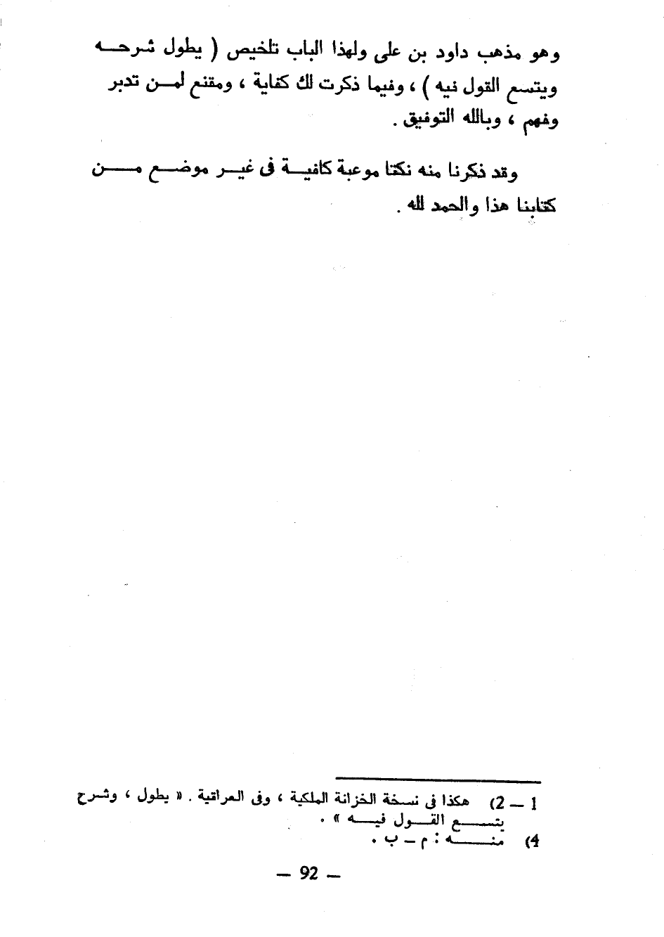 وَهُوَ مَذْهَبُ دَاوُدَ بْنِ عَلِيٍّ وَلِهَذَا الْبَابِ تَلْخِيصٌ (يَطُولُ شَرْحُهُ وَيَتَّسِعُ الْقَوْلُ فِيهِ) وَفِيمَا ذَكَرْتُ لَكَ كِفَايَةٌ وَمُقْنِعٌ لِمَنْ تَدَبَّرَ وَفَهِمَ وبالله التوفيق وقد ذكرنا منه نكتا موعبة كَافِيَةً فِي غَيْرِ مَوْضِعٍ مِنْ كِتَابِنَا هَذَا وَالْحَمْدُ لله