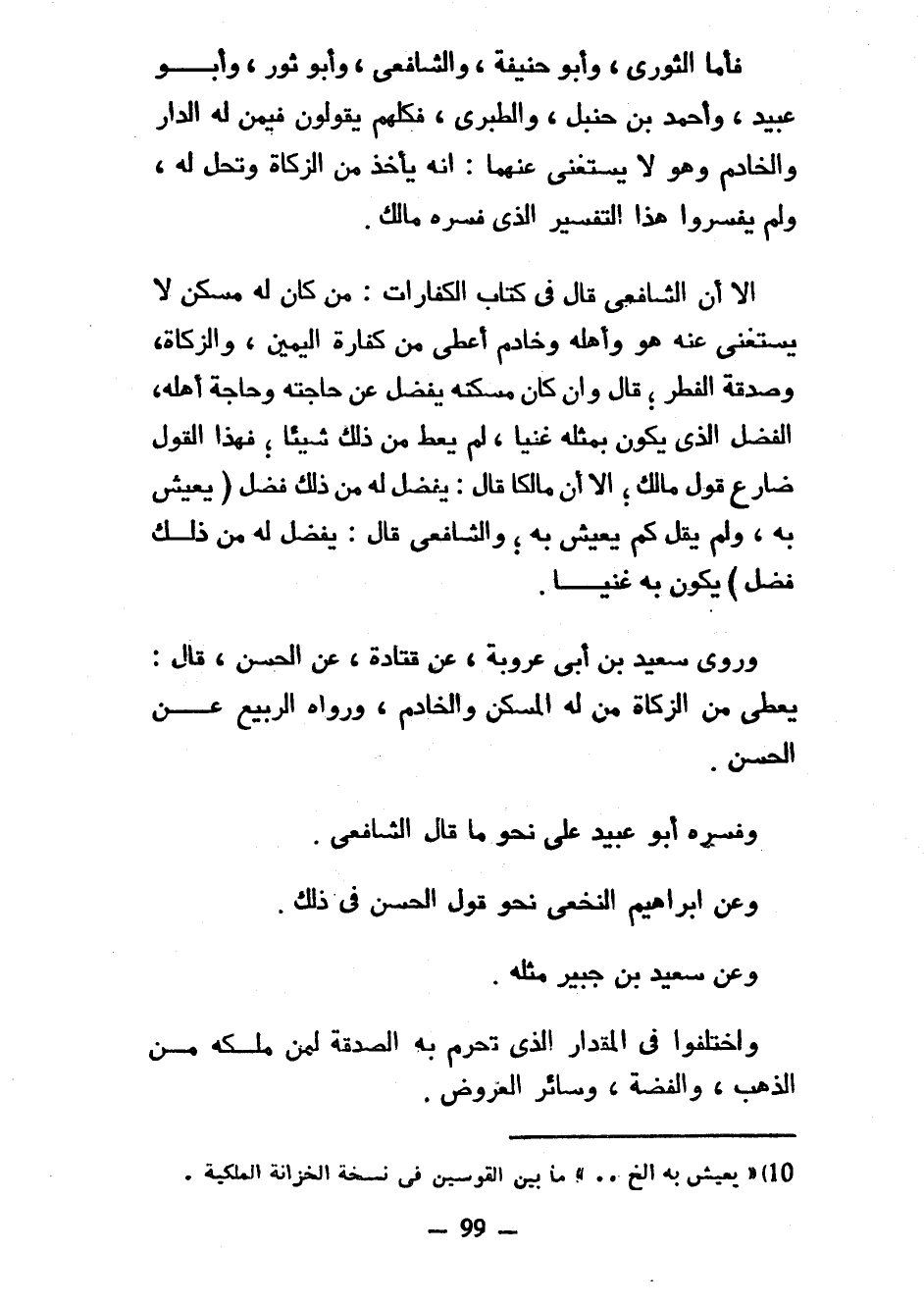 فَأَمَّا الثَّوْرِيُّ وَأَبُو حَنِيفَةَ وَالشَّافِعِيُّ وَأَبُو ثَوْرٍ وَأَبُو عُبَيْدٍ وَأَحْمَدُ بْنُ حَنْبَلٍ وَالطَّبَرِيُّ فَكُلُّهُمْ يَقُولُونَ فِيمَنْ لَهُ الدَّارُ وَالْخَادِمُ وَهُوَ لَا يَسْتَغْنِي عَنْهُمَا أَنَّهُ يَأْخُذُ مِنَ الزَّكَاةِ وَتَحِلُّ لَهُ وَلَمْ يُفَسِّرُوا هَذَا التَّفْسِيرَ الَّذِي فَسَّرَهُ مَالِكٌ إِلَّا أَنَّ الشَّافِعِيَّ قَالَ فِي كِتَابِ الْكَفَّارَاتِ مَنْ كَانَ لَهُ مَسْكَنٌ لَا يَسْتَغْنِي عَنْهُ هُوَ وَأَهْلُهُ وَخَادِمٌ أُعْطِيَ مِنْ كَفَّارَةِ الْيَمِينِ وَالزَّكَاةِ وَصَدَقَةِ الْفِطْرِ قَالَ وَإِنْ كَانَ مَسْكَنُهُ يَفْضُلُ عَنْ حَاجَتِهِ وَحَاجَةِ أَهْلِهِ الْفَضْلَ الَّذِي يَكُونُ بِمِثْلِهِ غَنِيًّا لَمْ يُعْطَ مِنْ ذَلِكَ شَيْئًا فَهَذَا الْقَوْلُ ضَارَعَ قَوْلَ مَالِكٍ إِلَّا أَنَّ مَالِكًا قَالَ يَفْضُلُ لَهُ مِنْ ذَلِكَ فَضْلٌ (يَعِيشُ بِهِ وَلَمْ يَقُلْ كَمْ يَعِيشُ بِهِ وَالشَّافِعِيُّ قَالَ يَفْضُلُ لَهُ مِنْ ذَلِكَ فَضْلٌ) يَكُونُ بِهِ غَنِيًّا وَرَوَى سَعِيدُ بْنُ أَبِي عَرُوبَةَ عَنْ قَتَادَةَ عَنِ الْحَسَنِ قَالَ يُعْطَى مِنَ الزَّكَاةِ مَنْ لَهُ الْمَسْكَنُ وَالْخَادِمُ وَرَوَاهُ الرَّبِيعُ عَنِ الْحَسَنِ وَفَسَّرَهُ أَبُو عُبَيْدٍ عَلَى نَحْوِ مَا قَالَ الشَّافِعِيُّ وَعَنْ إِبْرَاهِيمَ النَّخَعِيِّ نَحْوُ قَوْلِ الْحَسَنِ فِي ذَلِكَ وَعَنْ سَعِيدِ بْنِ جُبَيْرٍ مِثْلُهُ وَاخْتَلَفُوا فِي الْمِقْدَارَ الَّذِي تُحَرَّمُ بِهِ الصَّدَقَةُ لِمَنْ مَلَكَهُ مِنَ الذَّهَبِ وَالْفِضَّةِ وَسَائِرِ الْعُرُوضِ