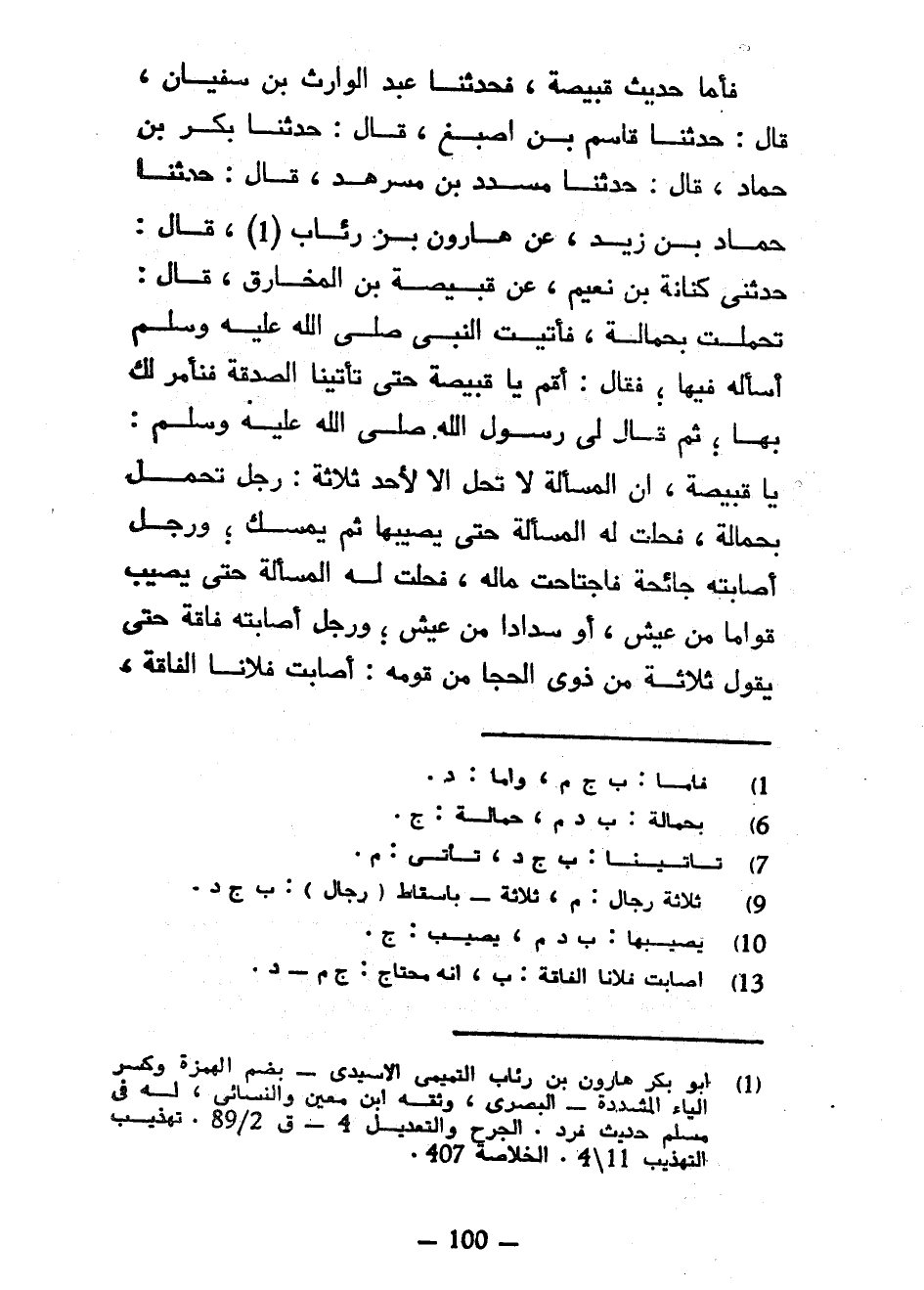 فَأَمَّا حَدِيثُ قَبِيصَةَ فَحَدَّثَنَا عَبْدُ الْوَارِثِ بْنُ سُفْيَانَ قَالَ حَدَّثَنَا قَاسِمُ بْنُ أَصْبَغَ قَالَ حَدَّثَنَا بَكْرُ بْنُ حَمَّادٍ قَالَ حَدَّثَنَا مُسَدَّدُ بْنُ مُسَرْهَدٍ قَالَ حَدَّثَنَا حَمَّادُ بْنُ زَيْدٍ عَنْ هَارُونَ بْنِ رِئَابٍ قَالَ حَدَّثَنِي كِنَانَةُ بْنُ نُعَيْمٍ عَنْ قَبِيصَةَ بْنِ الْمُخَارِقِ قَالَ تَحَمَّلْتُ بِحَمَالَةٍ فَأَتَيْتُ النَّبِيَّ صَلَّى اللَّهُ عَلَيْهِ وَسَلَّمَ أَسْأَلُهُ فِيهَا فَقَالَ أَقِمْ يَا قَبِيصَةُ حَتَّى تَأْتِيَنَا الصَّدَقَةُ فَنَأْمُرَ لَكَ بِهَا ثُمَّ قَالَ لِي رَسُولُ اللَّهِ صَلَّى اللَّهُ عَلَيْهِ وَسَلَّمَ يَا قَبِيصَةُ إِنَّ الْمَسْأَلَةَ لَا تَحِلُّ إِلَّا لِأَحَدِ ثَلَاثَةٍ رَجُلٍ تَحَمَّلَ بِحَمَالَةٍ فَحَلَّتِ لَهُ الْمَسْأَلَةُ حَتَّى يُصِيبَهَا ثُمَّ يُمْسِكُ وَرَجُلٍ أَصَابَتْهُ جَائِحَةٌ فَاجْتَاحَتْ مَالَهُ فَحَلَّتْ لَهُ الْمَسْأَلَةُ حَتَّى يُصِيبَ قِوَامًا مِنْ عَيْشٍ أَوْ سَدَادًا مِنْ عَيْشٍ وَرَجُلٌ أَصَابَتْهُ فَاقَةٌ حَتَّى يَقُولَ ثَلَاثَةٌ مِنْ ذَوِي الْحِجَا مِنْ قَوْمِهِ أَصَابَتْ فلانا الفاقة