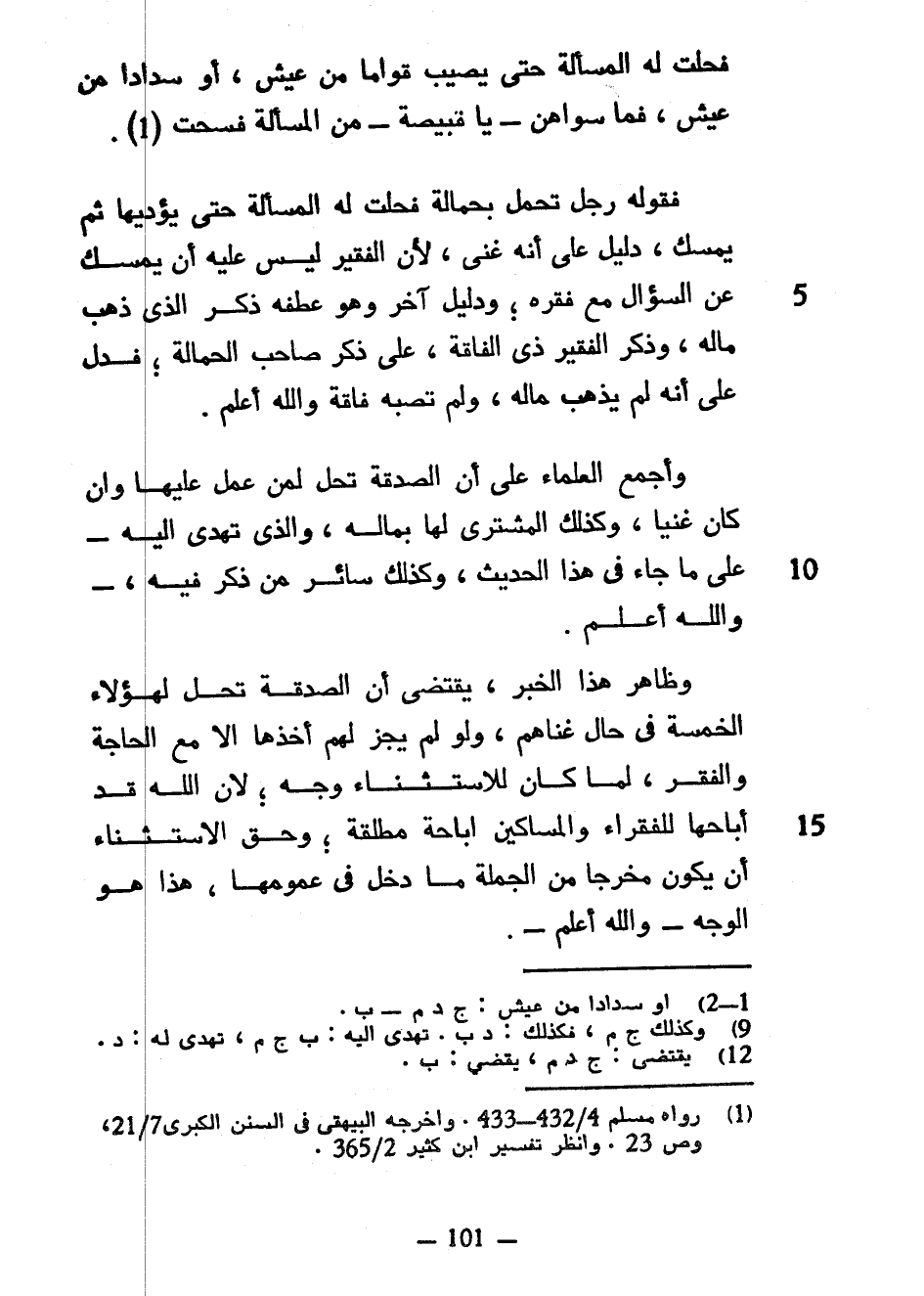 فَحَلَّتْ لَهُ الْمَسْأَلَةُ حَتَّى يُصِيبَ قِوَامًا مِنْ عَيْشٍ أَوْ سَدَادًا مِنْ عَيْشٍ فَمَا سِوَاهُنَّ يَا قَبِيصَةُ مِنَ الْمَسْأَلَةِ فَسُحْتٌ فَقَوْلُهُ رَجُلٍ تَحَمَّلَ بِحَمَالَةٍ فَحَلَّتْ لَهُ الْمَسْأَلَةُ حَتَّى يُؤَدِّيَهَا ثُمَّ يُمْسِكُ دَلِيلٌ عَلَى أَنَّهُ غَنِيٌّ لِأَنَّ الْفَقِيرَ لَيْسَ عَلَيْهِ أَنْ يُمْسِكَ عَنِ السُّؤَالِ مَعَ فَقْرِهِ وَدَلِيلٌ آخَرُ وَهُوَ عَطْفُهُ ذِكْرَ الَّذِي ذَهَبَ مَالُهُ وَذِكْرَ الْفَقِيرِ ذِي الْفَاقَةِ عَلَى ذِكْرِ صَاحِبِ الْحَمَالَةِ فَدَلَّ عَلَى أَنَّهُ لَمْ يَذْهَبْ مَالُهُ وَلَمْ تُصِبْهُ فَاقَةٌ وَاللَّهُ أَعْلَمُ وَأَجْمَعَ الْعُلَمَاءُ عَلَى أَنَّ الصَّدَقَةَ تَحِلُّ لِمَنْ عَمِلَ عَلَيْهَا وَإِنْ كَانَ غَنِيًّا وَكَذَلِكَ الْمُشْتَرِي لَهَا بِمَالِهِ وَالَّذِي تُهْدَى إِلَيْهِ عَلَى مَا جَاءَ فِي هَذَا الْحَدِيثِ وَكَذَلِكَ سَائِرُ من ذكر فيه والله أعلم وظاهر هذاالخبر يَقْتَضِي أَنَّ الصَّدَقَةَ تَحِلُّ لِهَؤُلَاءِ الْخَمْسَةِ فِي حَالِ غِنَاهُمْ وَلَوْ لَمْ يَجُزْ لَهُمْ أَخْذُهَا إِلَّا مَعَ الْحَاجَةِ وَالْفَقْرِ لَمَا كَانَ لِلِاسْتِثْنَاءِ وَجْهٌ لِأَنَّ اللَّهَ قَدْ أَبَاحَهَا لِلْفُقَرَاءِ وَالْمَسَاكِينِ إِبَاحَةً مُطْلَقَةً وَحَقُّ الِاسْتِثْنَاءِ أَنْ يَكُونَ مُخْرِجًا مِنَ الْجُمْلَةِ مَا دَخَلَ فِي عُمُومِهَا هَذَا هُوَ الْوَجْهُ وَاللَّهُ أَعْلَمُ