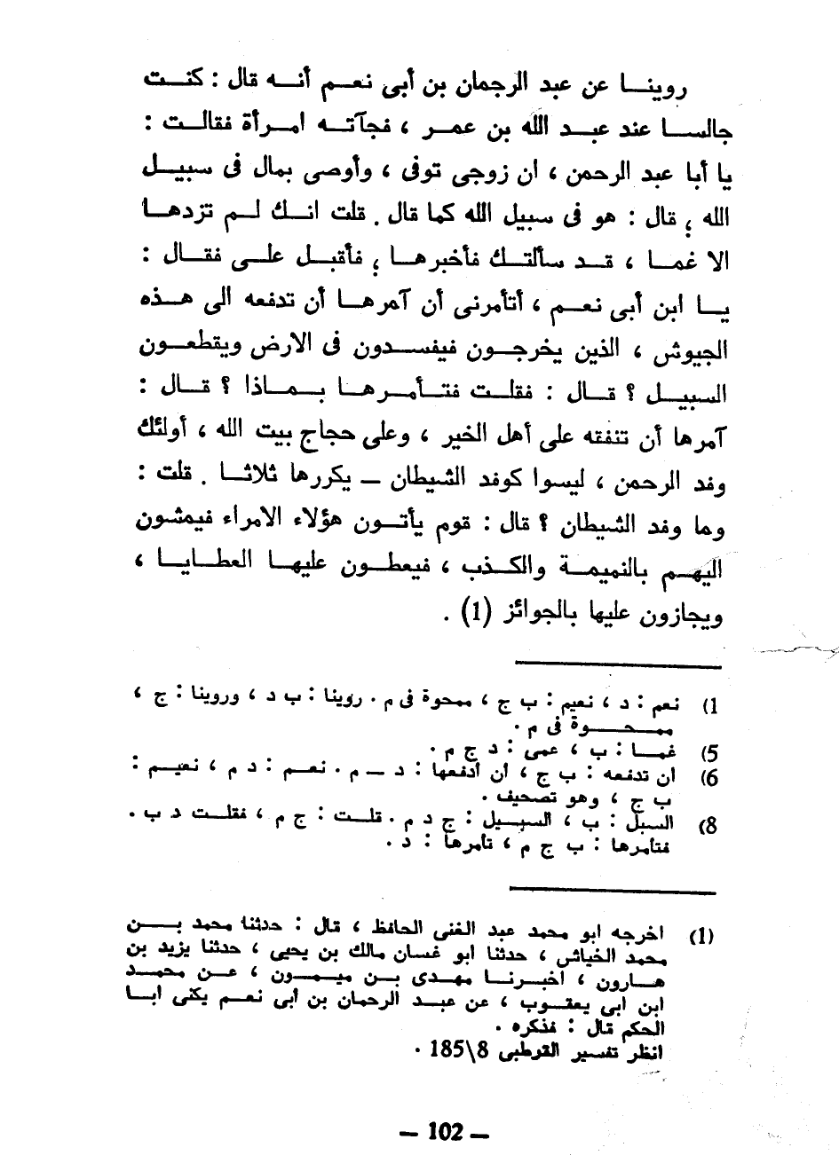 رُوِّينَا عَنْ عَبْدِ الرَّحْمَنِ بْنِ أَبِي نُعْمٍ أَنَّهُ قَالَ كُنْتُ جَالِسًا عِنْدَ عَبْدِ اللَّهِ بْنِ عُمَرَ فَجَاءَتْهُ امْرَأَةٌ فَقَالَتْ يَا أَبَا عَبْدِ الرَّحْمَنِ إِنَّ زَوْجِي تُوُفِّيَ وَأَوْصَى بِمَالٍ فِي سَبِيلِ اللَّهِ قَالَ هُوَ فِي سَبِيلِ اللَّهِ كَمَا قَالَ قُلْتُ إِنَّكَ لَمْ تَزِدْهَا إِلَّا غَمًّا قَدْ سَأَلَتْكَ فَأَخْبِرْهَا فَأَقْبَلَ عَلَيَّ فَقَالَ يَا ابْنَ أَبِي نُعْمٍ أَتَأْمُرُنِي أَنْ آمُرَهَا أَنْ تَدْفَعَهُ إِلَى هَذِهِ الْجُيُوشِ الَّذِينَ يَخْرُجُونَ فَيُفْسِدُونَ فِي الْأَرْضِ وَيَقْطَعُونَ السَّبِيلَ قَالَ فَقُلْتُ فَتَأْمُرُهَا بِمَاذَا قَالَ آمُرُهَا أَنْ تُنْفِقَهُ عَلَى أَهْلِ الْخَيْرِ وَعَلَى حُجَّاجِ بَيْتِ اللَّهِ أُولَئِكَ وَفْدُ الرَّحْمَنِ لَيْسُوا كَوَفْدِ الشَّيْطَانِ يُكَرِّرُهَا ثَلَاثًا قُلْتُ وَمَا وَفْدُ الشَّيْطَانِ قَالَ قَوْمٌ يَأْتُونَ هَؤُلَاءِ الْأُمَرَاءَ فَيَمْشُونَ إِلَيْهِمْ بِالنَّمِيمَةِ وَالْكَذِبِ فَيُعْطَوْنَ عَلَيْهَا الْعَطَايَا وَيُجَازَوْنَ عَلَيْهَا بِالْجَوَائِزِ