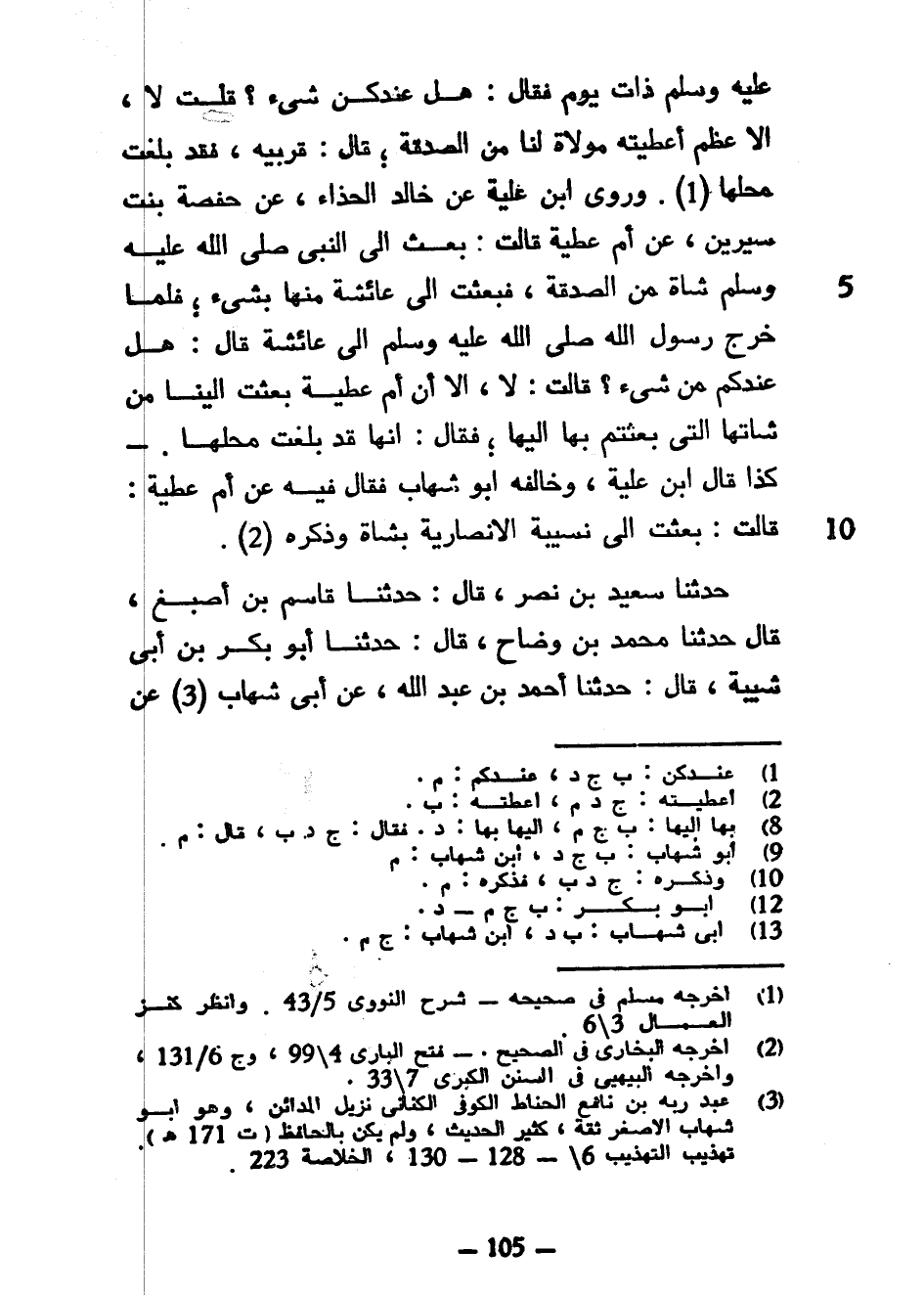 ذَاتَ يَوْمٍ فَقَالَ هَلْ عِنْدَكُنَّ شَيْءٌ قُلْتُ لَا إِلَّا عَظْمٌ أُعْطِيَتْهُ مَوْلَاةٌ لَنَا مِنَ الصَّدَقَةِ قَالَ قَرِّبِيهِ فَقَدْ بَلَغَتْ مَحِلَّهَا وَرَوَى ابْنُ عُلَيَّةَ عَنْ خَالِدٍ الْحَذَّاءِ عَنْ حَفْصَةَ بِنْتِ سِيرِينَ عَنْ أُمِّ عَطِيَّةَ قَالَتْ بَعَثَ إِلَيَّ النَّبِيُّ صَلَّى اللَّهُ عَلَيْهِ وَسَلَّمَ شَاةً مِنَ الصَّدَقَةِ فَبَعَثْتُ إِلَى عَائِشَةَ مِنْهَا بِشَيْءٍ فَلَمَّا خَرَجَ رَسُولُ اللَّهِ صَلَّى اللَّهُ عَلَيْهِ وَسَلَّمَ إِلَى عَائِشَةَ قَالَ هَلْ عِنْدَكُمْ مِنْ شَيْءٍ قَالَتْ لَا إِلَّا أَنَّ أُمَّ عَطِيَّةَ بَعَثَتْ إِلَيْنَا مِنْ شَاتِهَا الَّتِي بَعَثْتُمْ بِهَا إِلَيْهَا فَقَالَ إِنَّهَا قَدْ بَلَغَتْ مَحِلَّهَا كَذَا قَالَ ابْنُ عُلَيَّةَ وَخَالَفَهُ أَبُو شِهَابٍ فَقَالَ فِيهِ عَنْ أُمِّ عَطِيَّةَ قَالَتْ بَعَثْتُ إِلَى نُسَيْبَةَ الْأَنْصَارِيَّةِ بِشَاةٍ وَذَكَرَهُ حَدَّثَنَا سَعِيدُ بْنُ نَصْرٍ قَالَ حَدَّثَنَا قَاسِمُ بْنُ أَصْبَغَ قَالَ حَدَّثَنَا مُحَمَّدُ بْنُ وَضَّاحٍ قَالَ حَدَّثَنَا أَبُو بَكْرِ بْنُ أَبِي شَيْبَةَ قَالَ حَدَّثَنَا أَحْمَدُ بْنُ عَبْدِ اللَّهِ عَنْ أَبِي شِهَابٍ عَنْ