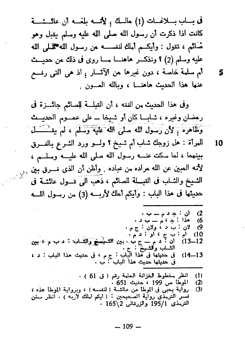 فِي بَابِ بَلَاغَاتِ مَالِكٍ لِأَنَّهُ بَلَغَهُ أَنَّ عائشةكانت إِذَا ذَكَرَتْ أَنَّ رَسُولَ اللَّهِ صَلَّى اللَّهُ عَلَيْهِ وَسَلَّمَ يُقَبِّلُ وَهُوَ صَائِمٌ تَقُولُ وَأَيُّكُمْ أَمْلَكُ لِنَفْسِهِ مِنْ رَسُولِ اللَّهِ صَلَّى اللَّهُ عَلَيْهِ وَسَلَّمَ ونذكر هاهنا مَا رُوِيَ فِي ذَلِكَ مِنْ حَدِيثِ أُمِّ سَلَمَةَ خَاصَّةً دُونَ غَيْرِهَا مِنَ الْآثَارِ إِذْ هي التي رفع عنها هذا الحديث هاهنا وَبِاللَّهِ الْعَوْنُ وَفِي هَذَا الْحَدِيثِ مِنَ الْفِقْهِ أَنَّ الْقُبْلَةَ لِلصَّائِمِ جَائِزَةٌ فِي رَمَضَانَ وَغَيْرِهِ شَابًّا كَانَ أَوْ شَيْخًا عَلَى عُمُومِ الْحَدِيثِ وَظَاهِرِهِ لِأَنَّ رَسُولَ اللَّهِ صَلَّى اللَّهُ عَلَيْهِ وَسَلَّمَ لَمْ يَقُلْ لِلْمَرْأَةِ هَلْ زُوْجُكِ شَابٌّ أَمْ شَيْخٌ وَلَوْ وَرَدَ الشَّرْعُ بِالْفَرْقِ بَيْنَهُمَا لَمَا سَكَتَ عَنْهُ رَسُولُ اللَّهِ صَلَّى اللَّهُ عَلَيْهِ وَسَلَّمَ لِأَنَّهُ الْمُبَيِّنُ عَنِ اللَّهِ مُرَادَهُ مِنْ عِبَادِهِ وَأَظُنُّ أَنَّ الَّذِي فَرَّقَ بَيْنَ الشَّيْخِ وَالشَّابِّ فِي الْقُبْلَةِ لِلصَّائِمِ ذَهَبَ إِلَى قَوْلِ عَائِشَةَ فِي حَدِيثِهَا فِي هَذَا الْبَابِ وَأَيُّكُمْ أَمْلَكُ لِأَرَبِهِ مِنْ رَسُولِ اللَّهِ