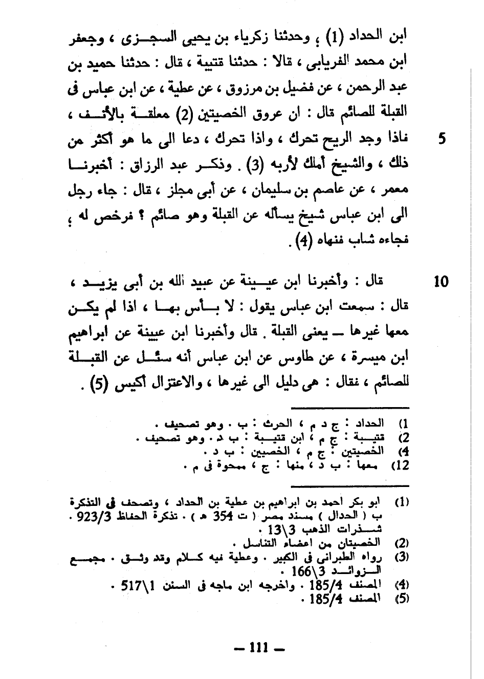 ابن الْحَدَّادِ وَحَدَّثَنَا زَكَرِيَّا بْنُ يَحْيَى السِّجْزِيُّ وَجَعْفَرُ بْنُ مُحَمَّدٍ الْفِرْيَابِيُّ قَالَا حَدَّثَنَا قُتَيْبَةُ قَالَ حَدَّثَنَا حُمَيْدُ بْنُ عَبْدِ الرَّحْمَنِ عَنْ فُضَيْلِ بْنِ مَرْزُوقٍ عَنْ عَطِيَّةَ عَنِ ابْنِ عَبَّاسٍ فِي الْقُبْلَةِ لِلصَّائِمِ قَالَ إِنَّ عُرُوقَ الْخِصْيَتَيْنِ مُعَلَّقَةٌ بِالْأَنْفِ فَإِذَا وَجَدَ الرِّيحَ تَحَرَّكَ وَإِذَا تَحَرَّكَ دَعَا إِلَى مَا هُوَ أَكْثَرَ مِنْ ذَلِكَ وَالشَّيْخُ أَمْلَكُ لِأَرَبِهِ وَذَكَرَ عَبْدُ الرَّزَّاقِ أَخْبَرَنَا مَعْمَرٌ عَنْ عَاصِمِ بْنِ سُلَيْمَانَ عَنْ أَبِي مِجْلَزٍ قَالَ جَاءَ رَجُلٌ إِلَى ابْنِ عَبَّاسٍ شَيْخٌ يَسْأَلُهُ عَنِ الْقُبْلَةِ وَهُوَ صَائِمٌ فَرَخَّصَ لَهُ فَجَاءَهُ شَابٌّ فَنَهَاهُ قَالَ وَأَخْبَرَنَا ابْنُ عُيَيْنَةَ عَنْ عُبَيْدِ اللَّهِ بْنِ أَبِي يَزِيدَ قَالَ سَمِعْتُ ابْنَ عَبَّاسٍ يَقُولُ لَا بَأْسَ بِهَا إِذَا لَمْ يَكُنْ مَعَهَا غَيْرُهَا يَعْنِي الْقُبْلَةَ قَالَ وَأَخْبَرَنَا ابْنُ عُيَيْنَةَ عَنْ إِبْرَاهِيمَ بْنِ مَيْسَرَةَ عَنْ طَاوُسٍ عَنِ ابْنِ عَبَّاسٍ أَنَّهُ سُئِلَ عَنِ الْقُبْلَةِ لِلصَّائِمِ فَقَالَ هِيَ دَلِيلٌ إِلَى غَيْرِهَا وَالِاعْتِزَالُ أَكْيَسُ
