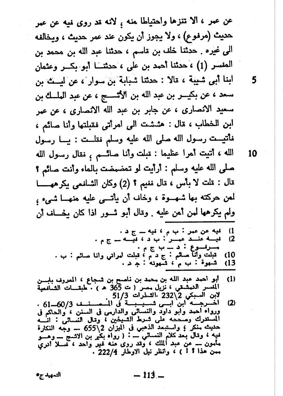 عَنْ عُمَرَ إِلَّا تَنَزُّهًا وَاحْتِيَاطًا مِنْهُ لِأَنَّهُ قَدْ رُوِيَ فِيهِ عَنْ عُمَرَ حَدِيثٌ (مَرْفُوعٌ) وَلَا يَجُوزُ أَنْ يَكُونَ عِنْدَ عُمَرَ حَدِيثٌ وَيُخَالِفُهُ إِلَى غَيْرِهِ حَدَّثَنَا خَلَفُ بْنُ قَاسِمٍ حَدَّثَنَا عَبْدُ اللَّهِ بْنُ مُحَمَّدٍ الْمُفَسِّرُ حَدَّثَنَا أَحْمَدُ بْنُ عَلِيٍّ حَدَّثَنَا أَبُو بَكْرٍ وَعُثْمَانُ ابْنَا أَبِي شَيْبَةَ قَالَا حَدَّثَنَا شَبَابَةُ بْنُ سَوَّارٍ عَنْ لَيْثِ بْنِ سَعْدٍ عَنْ بُكَيْرِ بْنِ عَبْدِ اللَّهِ بْنِ الْأَشَجِّ عَنْ عَبْدِ الْمَلِكِ بْنِ سَعِيدٍ الْأَنْصَارِيِّ عَنْ جَابِرِ بْنِ عَبْدِ اللَّهِ الْأَنْصَارِيِّ عَنْ عُمَرَ بْنِ الْخَطَّابِ قَالَ هَشَشْتُ إِلَى امْرَأَتِي فَقَبَّلْتُهَا وَأَنَا صَائِمٌ فَأَتَيْتُ رَسُولَ اللَّهِ صَلَّى اللَّهُ عَلَيْهِ وَسَلَّمَ فَقُلْتُ يَا رَسُولَ اللَّهِ أَتَيْتُ أَمْرًا عَظِيمًا قَبَّلْتُ وَأَنَا صَائِمٌ فَقَالَ رَسُولُ اللَّهِ صَلَّى اللَّهُ عَلَيْهِ وَسَلَّمَ أَرَأَيْتَ لَوْ تَمَضْمَضْتَ بِالْمَاءِ وَأَنْتَ صَائِمٌ قَالَ قُلْتُ لَا بَأْسَ قَالَ فَفِيمَ وَكَانَ الشَّافِعِيُّ يَكْرَهُهَا لِمَنْ حَرَّكَتْهُ بِهَا شَهْوَةٌ وَخَافَ أَنْ يَأْتِيَ عَلَيْهِ مِنْهَا شَيْءٌ وَلَمْ يَكْرَهْهَا لِمَنْ أُمِنَ عَلَيْهِ وَقَالَ أَبُو ثَوْرٍ إِذَا كَانَ يَخَافُ أَنْ