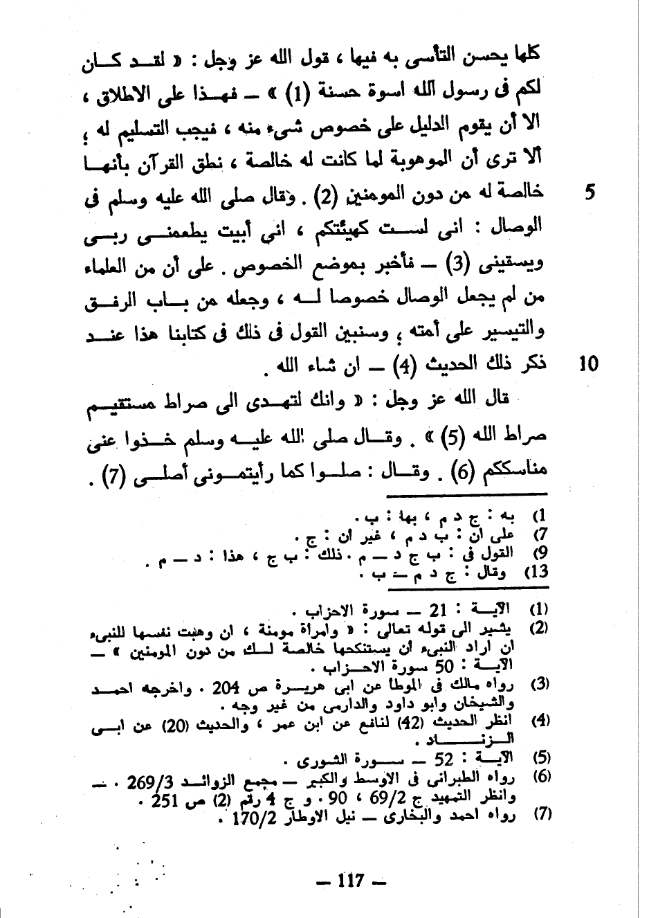 كلها يحسن التأسي به فيها قوله الله عز وجل لَقَدْ كَانَ لَكُمْ فِي رَسُولِ اللَّهِ أُسْوَةٌ حَسَنَةٌ فَهَذَا عَلَى الْإِطْلَاقِ إِلَّا أَنْ يَقُومَ الدَّلِيلُ عَلَى خُصُوصِ شَيْءٍ مِنْهُ فَيَجِبُ التَّسْلِيمُ لَهُ أَلَا تَرَى أَنَّ الْمَوْهُوبَةَ لَمَّا كَانَتْ لَهُ خَالِصَةً نَطَقَ الْقُرْآنُ بِأَنَّهَا خَالِصَةً لَهُ مِنْ دُونِ الْمُؤْمِنِينَ وَقَالَ صَلَّى اللَّهُ عَلَيْهِ وَسَلَّمَ فِي الْوِصَالِ إِنِّي لَسْتُ كَهَيْئَتِكُمْ إِنِّي أَبِيتُ يُطْعِمُنِي رَبِّي وَيَسْقِينِي فأخبر بِمَوْضِعِ الْخُصُوصِ عَلَى أَنَّ مِنَ الْعُلَمَاءِ مَنْ لَمْ يَجْعَلِ الْوِصَالَ خُصُوصًا لَهُ وَجَعَلَهُ مِنْ بَابِ الرِّفْقِ وَالتَيْسِيرِ عَلَى أُمَّتِهِ وَسَنُبَيِّنُ الْقَوْلَ فِي ذَلِكَ فِي كِتَابِنَا هَذَا عِنْدَ ذِكْرِ ذَلِكَ الْحَدِيثِ إِنْ شَاءَ اللَّهُ قَالَ اللَّهُ عَزَّ وَجَلَّ وَإِنَّكَ لَتَهْدِي إِلَى صِرَاطٍ مُسْتَقِيمٍ صِرَاطِ اللَّهِ وَقَالَ صَلَّى اللَّهُ عَلَيْهِ وَسَلَّمَ خُذُوا عَنِّي مَنَاسِكَكُمْ وَقَالَ صَلُّوا كَمَا رَأَيْتُمُونِي أصلي