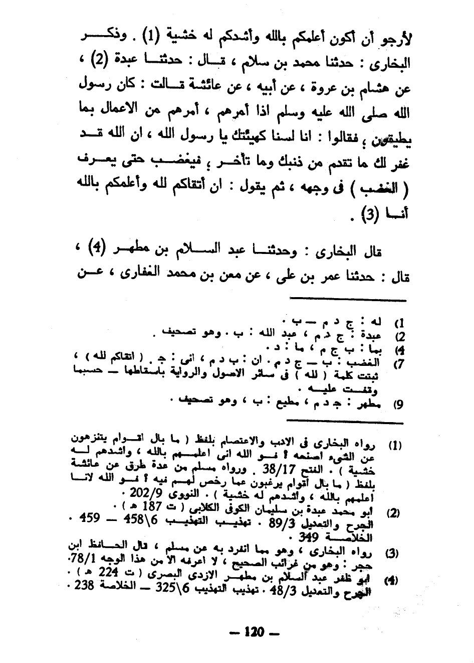 لَأَرْجُو أَنْ أَكُونَ أَعْلَمَكُمْ بِاللَّهِ وَأَشَدَّكُمْ لَهُ خَشْيَةً وَذَكَرَ الْبُخَارِيُّ حَدَّثَنَا مُحَمَّدُ بْنُ سَلَّامٍ قَالَ حَدَّثَنَا عَبْدَةُ عَنْ هِشَامِ بْنِ عُرْوَةَ عَنْ أَبِيهِ عَنْ عَائِشَةَ قَالَتْ كَانَ رَسُولُ اللَّهِ صَلَّى اللَّهُ عَلَيْهِ وَسَلَّمَ إِذَا أَمَرَهُمْ أَمَرَهُمْ مِنَ الْأَعْمَالِ بِمَا يُطِيقُونَ فَقَالُوا إِنَّا لَسْنَا كَهَيْئَتِكَ يَا رَسُولَ اللَّهِ إِنَّ اللَّهَ قَدْ غَفَرَ لَكَ مَا تَقَدَّمَ مِنْ ذَنْبِكَ وَمَا تَأَخَّرَ فَيَغْضَبُ حَتَّى يُعْرَفَ (الْغَضَبُ) فِي وَجْهِهِ ثُمَّ يَقُولُ إِنَّ أَتْقَاكُمْ لِلَّهِ وَأَعْلَمَكُمْ بِاللَّهِ أَنَا قَالَ الْبُخَارِيُّ وَحَدَّثَنَا عَبْدُ السَّلَامِ بْنُ مُطَهَّرٍ قَالَ حَدَّثَنَا عُمَرُ بْنُ عَلِيٍّ عَنْ مَعْنِ بْنِ مُحَمَّدٍ الْغِفَارِيِّ عَنْ
