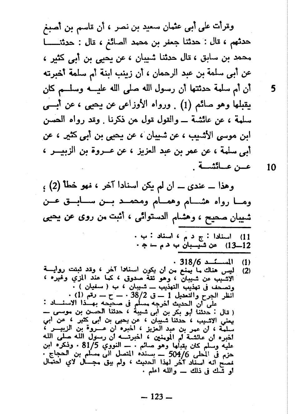 وَقَرَأْتُ عَلَى أَبِي عُثْمَانَ سَعِيدِ بْنِ نَصْرٍ أَنَّ قَاسِمَ بْنَ أَصْبَغَ حَدَّثَهُمْ قَالَ حَدَّثَنَا جَعْفَرُ بْنُ مُحَمَّدٍ الصَّائِغُ قَالَ حَدَّثَنَا مُحَمَّدُ بْنُ سَابِقٍ قَالَ حَدَّثَنَا شَيْبَانُ عَنْ يَحْيَى بْنِ أَبِي كَثِيرٍ عَنْ أَبِي سَلَمَةَ بْنِ عَبْدِ الرَّحْمَنِ أَنَّ زَيْنَبَ ابْنَةَ أُمِّ سَلَمَةَ أَخْبَرَتْهُ أَنَّ أُمَّ سَلَمَةَ حَدَّثَتْهَا أَنَّ رَسُولَ اللَّهِ صَلَّى اللَّهُ عَلَيْهِ وَسَلَّمَ كَانَ يُقَبِّلُهَا وَهُوَ صَائِمٌ وَرَوَاهُ الْأَوْزَاعِيُّ عَنْ يَحْيَى عَنْ أَبِي سَلَمَةَ عَنْ عَائِشَةَ وَالْقَوْلُ قَوْلُ مَنْ ذكرنا وقد رواه الحسن ابن مُوسَى الْأَشْيَبُ عَنْ شَيْبَانُ عَنْ يَحْيَى بْنِ أَبِي كَثِيرٍ عَنْ أَبِي سَلَمَةَ عَنْ عُمَرَ بْنِ عَبْدِ الْعَزِيزِ عَنْ عُرْوَةَ بْنِ الزُّبَيْرِ عَنْ عَائِشَةَ وَهَذَا عِنْدِي إِنْ لَمْ يَكُنْ إِسْنَادًا آخَرَ فَهُوَ خَطَأٌ وَمَا رَوَاهُ هِشَامٌ وَهَمَّامٌ وَمُحَمَّدُ بْنُ سَابِقٍ عَنْ شَيْبَانَ صَحِيحٌ وَهِشَامٌ الدَّسْتَوَائِيُّ أَثْبَتُ مَنْ رَوَى عَنْ يَحْيَى