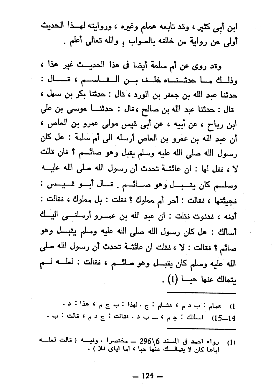 ابن أَبِي كَثِيرٍ وَقَدْ تَابَعَهُ هَمَّامٌ وَغَيْرُهُ وَرِوَايَتُهُ لِهَذَا الْحَدِيثِ أَوْلَى مِنْ رِوَايَةِ مَنْ خَالَفَهُ بِالصَّوَابِ وَاللَّهُ تَعَالَى أَعْلَمُ وَقَدْ رُوِيَ عَنْ أُمِّ سَلَمَةَ أَيْضًا فِي هَذَا الْحَدِيثِ غَيْرُ هَذَا وَذَلِكَ مَا حَدَّثَنَاهُ خَلَفُ بْنُ الْقَاسِمِ قَالَ حَدَّثَنَا عَبْدُ اللَّهِ بْنُ جَعْفَرِ بْنِ الْوَرْدِ قَالَ حَدَّثَنَا بَكْرُ بْنُ سَهْلٍ قَالَ حَدَّثَنَا عَبْدُ اللَّهِ بْنُ صَالِحٍ قَالَ حدثنا موسى بن علي ابن رَبَاحٍ عَنْ أَبِيهِ عَنْ أَبِي قَيْسٍ مَوْلَى عَمْرِو بْنِ الْعَاصِ أَنَّ عَبْدَ اللَّهِ بْنَ عَمْرِو بْنِ الْعَاصِ أَرْسَلَهُ إِلَى أُمِّ سَلَمَةَ هَلْ كَانَ رَسُولُ اللَّهِ صَلَّى اللَّهُ عَلَيْهِ وَسَلَّمَ يُقَبِّلُ وَهُوَ صَائِمٌ فَإِنْ قَالَتْ لَا فَقُلْ لَهَا إِنَّ عَائِشَةَ تُحَدِّثُ أَنَّ رَسُولَ اللَّهِ صَلَّى اللَّهُ عَلَيْهِ وَسَلَّمَ كَانَ يُقَبِّلُ وهو صائم قال أبو قيس فجيئتها فَقَالَتْ أَحُرٌّ أَمْ مَمْلُوكٌ فَقُلْتُ بَلْ مَمْلُوكٌ فَقَالَتْ أُدْنُهْ فَدَنَوْتُ فَقُلْتُ إِنَّ عَبْدَ اللَّهِ بْنَ عَمْرٍو أَرْسَلَنِي إِلَيْكِ أَسْأَلُكِ هَلْ كَانَ رَسُولُ اللَّهِ صَلَّى اللَّهُ عَلَيْهِ وَسَلَّمَ يقبل وَهُوَ صَائِمٌ فَقَالَتْ لَا فَقُلْتُ إِنَّ عَائِشَةَ تُحَدِّثُ أَنَّ رَسُولَ اللَّهِ صَلَّى اللَّهُ عَلَيْهِ وَسَلَّمَ كَانَ يُقَبِّلُ وَهُوَ صَائِمٌ فَقَالَتْ لَعَلَّهُ لَمْ يَتَمَالَكْ عَنْهَا حُبًّا