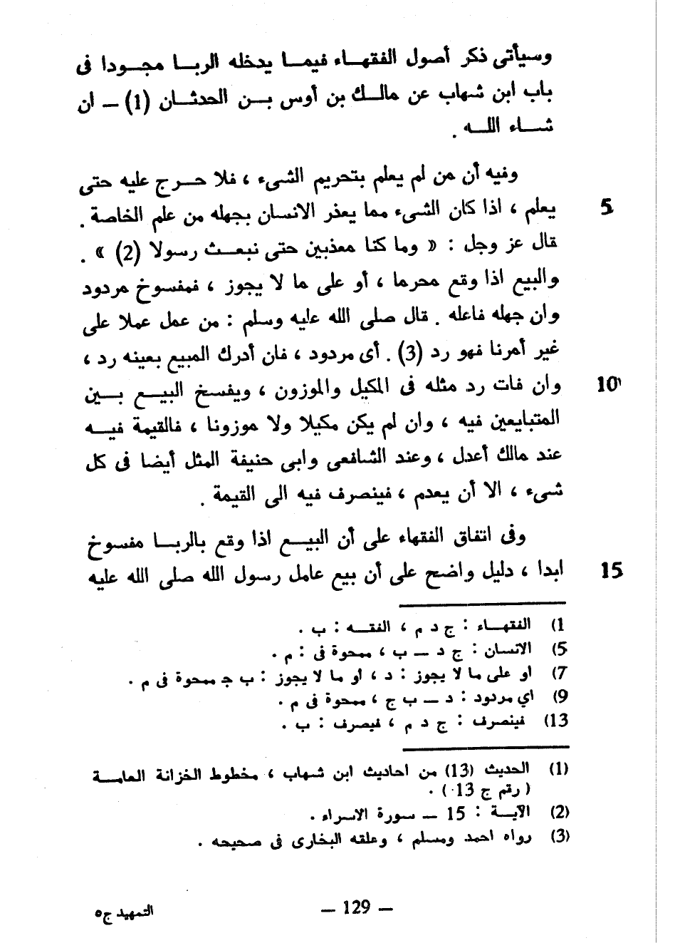وَسَيَأْتِي ذِكْرُ أُصُولِ الْفُقَهَاءِ فِيمَا يَدْخُلُهُ الرِّبَا مُجَوَّدًا فِي بَابِ ابْنِ شِهَابٍ عَنْ مَالِكِ بْنِ أَوْسِ بْنِ الْحَدَثَانِ إِنْ شَاءَ اللَّهُ وَفِيهِ أَنَّ مَنْ لَمْ يَعْلَمْ بِتَحْرِيمِ الشَّيْءِ فَلَا حَرَجَ عَلَيْهِ حَتَّى يَعْلَمَ إِذَا كَانَ الشَّيْءُ مِمَّا يُعْذَرُ الْإِنْسَانُ بِجَهْلِهِ مِنْ عِلْمِ الْخَاصَّةِ قَالَ عَزَّ وَجَلَّ وَمَا كُنَّا مُعَذِّبِينَ حَتَّى نَبْعَثَ رَسُولًا وَالْبَيْعُ إِذَا وَقَعَ مُحَرَّمًا أَوْ عَلَى مَا لَا يَجُوزُ فَمَفْسُوخٌ مَرْدُودٌ وَإِنْ جَهِلَهُ فَاعِلُهُ قَالَ صَلَّى اللَّهُ عَلَيْهِ وَسَلَّمَ مَنْ عَمِلَ عَمَلًا عَلَى غَيْرِ أَمْرِنَا فَهُوَ رَدٌّ أَيْ مَرْدُودٌ فَإِنْ أُدْرِكَ الْمَبِيعُ بِعَيْنِهِ رُدَّ وَإِنْ فَاتَ رُدَّ مِثْلُهُ فِي الْمَكِيلِ وَالْمَوْزُونِ وَيُفْسَخُ الْبَيْعُ بَيْنَ الْمُتَبَايِعِينَ فِيهِ وَإِنْ لَمْ يَكُنْ مَكِيلًا وَلَا مَوْزُونًا فَالْقِيمَةُ فِيهِ عِنْدَ مَالِكٍ أَعْدَلُ وَعِنْدَ الشَّافِعِيِّ وَأَبِي حَنِيفَةَ الْمِثْلُ أَيْضًا فِي كُلِّ شَيْءٍ إِلَّا أَنْ يُعْدَمَ فَيُنْصَرَفُ فِيهِ إِلَى الْقِيمَةِ وَفِي اتِّفَاقِ الْفُقَهَاءِ عَلَى أَنَّ الْبَيْعَ إِذَا وَقَعَ بِالرِّبَا مَفْسُوخٌ أَبَدًا دَلِيلٌ وَاضِحٌ عَلَى أَنَّ بَيْعَ عَامَلَ رَسُولُ اللَّهِ صَلَّى اللَّهُ عَلَيْهِ