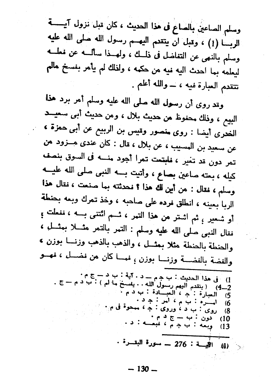 وَسَلَّمَ الصَّاعَيْنِ بِالصَّاعِ فِي هَذَا الْحَدِيثِ كَانَ قَبْلَ نُزُولِ آيَةِ الرِّبَا وَقَبْلَ أَنْ يَتَقَدَّمَ إِلَيْهِمْ رَسُولُ اللَّهِ صَلَّى اللَّهُ عَلَيْهِ وَسَلَّمَ بِالنَّهْيِّ عَنِ التَّفَاضُلِ فِي ذَلِكَ وَلِهَذَا سَأَلَهُ عَنْ فِعْلِهِ لِيُعْلِمَهُ بِمَا أَحْدَثَ إِلَيْهِ فِيهِ من حكمه ولذلك لم يأمر بفسخ مالم تَتَقَدَّمِ الْعِبَارَةُ فِيهِ وَاللَّهُ أَعْلَمُ وَقَدْ رُوِيَ أَنَّ رَسُولَ اللَّهِ صَلَّى اللَّهُ عَلَيْهِ وسلم أَمَرَ بِرَدِّ هَذَا الْبَيْعِ وَذَلِكَ مَحْفُوظٌ مِنْ حَدِيثِ بِلَالٍ وَمِنْ حَدِيثِ أَبِي سَعِيدٍ الْخُدْرِيِّ أَيْضًا رَوَى مَنْصُورٌ وَقَيْسُ بْنُ الرَّبِيعِ عَنْ أَبِي حَمْزَةَ عَنْ سَعِيدِ بْنِ الْمُسَيَّبِ عَنْ بِلَالٍ قَالَ كَانَ عِنْدِي مِزْوَدٌ مِنْ تَمْرٍ دُونٍ قَدْ تَغَيَّرَ فَابْتَعْتُ تَمْرًا أَجْوَدَ مِنْهُ فِي السُّوقِ بِنِصْفِ كَيْلِهِ بِعْتُهُ صَاعَيْنِ بِصَاعٍ وَأَتَيْتُ بِهِ النَّبِيُّ صَلَّى اللَّهُ عَلَيْهِ وَسَلَّمَ فَقَالَ مَنْ أَيْنَ لَكَ هَذَاَ فَحَدَّثْتُهُ بِمَا صَنَعْتُ فَقَالَ هَذَا الرِّبَا بِعَيْنِهِ انْطَلِقْ فَرُدَّهُ عَلَى صَاحِبِهِ وَخُذْ تَمْرَكَ وَبِعْهُ بِحِنْطَةٍ أَوْ شَعِيرٍ ثُمَّ اشْتَرِ مِنْ هَذَا التَّمْرِ ثُمَّ ائْتِنِي بِهِ فَفَعَلْتُ فَقَالَ النَّبِيُّ صَلَّى اللَّهُ عَلَيْهِ وَسَلَّمَ التَّمْرُ بِالتَّمْرِ مِثْلًا بِمِثْلٍ وَالْحِنْطَةُ بِالْحِنْطَةِ مِثْلًا بِمِثْلٍ وَالذَّهَبُ بِالذَّهَبِ وَزْنًا بِوَزْنٍ وَالْفِضَّةُ بِالْفِضَّةِ وَزْنًا بِوَزْنٍ فَمَا كَانَ مِنْ فضل فهو