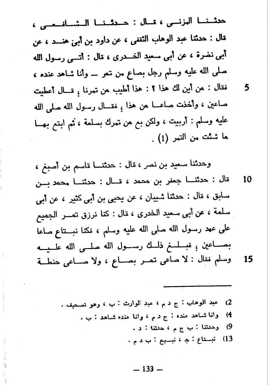 حَدَّثَنَا الْمُزَنِيُّ قَالَ حَدَّثَنَا الشَّافِعِيُّ قَالَ حَدَّثَنَا عَبْدُ الْوَهَّابِ الثَّقَفِيُّ عَنْ دَاوُدُ بْنُ أَبِي هِنْدَ عَنْ أَبِي نَضْرَةَ عَنْ أَبِي سَعِيدٍ الْخُدْرِيِّ قَالَ أَتَى رَسُولَ اللَّهِ صَلَّى اللَّهُ عَلَيْهِ وَسَلَّمَ رَجُلٌ بِصَاعٍ مِنْ تَمْرٍ وَأَنَا شَاهِدٌ عِنْدَهُ فَقَالَ مِنْ أَيْنَ لَكَ هَذَا هَذَا أَطْيَبُ مِنْ تَمْرِنَا قَالَ أَعْطَيْتُ صَاعَيْنِ وَأَخَذْتُ صَاعًا مِنْ هَذَا فَقَالَ رَسُولُ اللَّهِ صَلَّى اللَّهُ عَلَيْهِ وَسَلَّمَ أَرْبَيْتَ وَلَكِنْ بِعْ مِنْ تَمْرِكَ بِسِلْعَةٍ ثُمَّ ابْتَعْ بِهَا مَا شِئْتَ مِنَ التَّمْرِ وَحَدَّثَنَا سَعِيدُ بْنُ نَصْرٍ قَالَ حَدَّثَنَا قَاسِمُ بْنُ أَصْبَغَ قَالَ حَدَّثَنَا جَعْفَرُ بْنُ مُحَمَّدٍ قَالَ حَدَّثَنَا مُحَمَّدُ بْنُ سَابِقٍ قَالَ حَدَّثَنَا شَيْبَانُ عَنْ يَحْيَى بْنِ أَبِي كَثِيرٍ عَنْ أَبِي سَلَمَةَ عَنْ أَبِي سَعِيدٍ الْخُدْرِيِّ قَالَ كُنَّا نُرْزَقُ تَمْرَ الْجَمِيعِ عَلَى عَهْدِ رَسُولِ اللَّهِ صَلَّى اللَّهُ عَلَيْهِ وَسَلَّمَ فَكُنَّا نَبْتَاعُ صَاعًا بِصَاعَيْنِ فَبَلَغَ ذَلِكَ رَسُولَ اللَّهِ صَلَّى اللَّهُ عَلَيْهِ وَسَلَّمَ فقال لَا صَاعَيْ تَمْرٍ بِصَاعٍ وَلَا صَاعَيْ حِنْطَةٍ