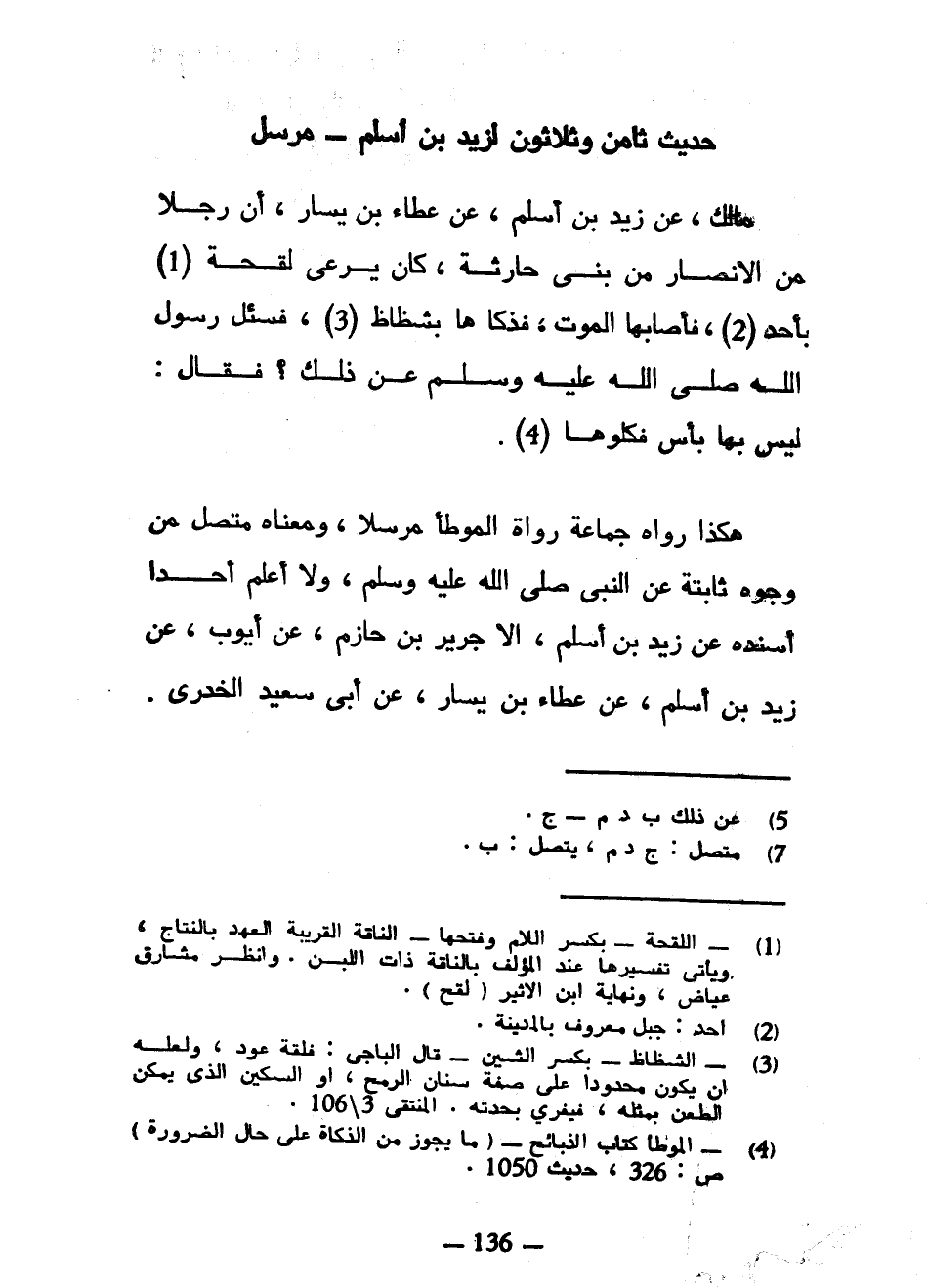 حَدِيثٌ ثَامِنٌ وَثَلَاثُونَ لِزَيْدِ بْنِ أَسْلَمَ مُرْسَلٌ مالك عَنْ زَيْدِ بْنِ أَسْلَمَ عَنْ عَطَاءِ بْنِ يَسَارٍ أَنَّ رَجُلًا مِنَ الْأَنْصَارِ مِنْ بَنِي حَارِثَةَ كَانَ يَرْعَى لَقْحَةً بِأُحُدٍ فَأَصَابَهَا الْمَوْتُ فَذَكَّاهَا بِشِظَاظٍ فَسُئِلَ رَسُولُ اللَّهِ صَلَّى اللَّهُ عَلَيْهِ وَسَلَّمَ عَنْ ذَلِكَ فَقَالَ لَيْسَ بِهَا بَأْسٌ فَكُلُوهَا هَكَذَا رَوَاهُ جَمَاعَةُ رُوَاةِ الْمُوَطَّإِ مُرْسَلًا وَمَعْنَاهُ مُتَّصِلٌ مِنْ وُجُوهٍ ثَابِتَةٍ عَنِ النَّبِيِّ صَلَّى اللَّهُ عَلَيْهِ وَسَلَّمَ وَلَا أَعْلَمُ أَحَدًا أَسْنَدَهُ عَنْ زَيْدِ بْنِ أَسْلَمَ إِلَّا جَرِيرُ بْنُ حَازِمٍ عَنْ أَيُّوبَ عَنْ زَيْدِ بْنِ أَسْلَمَ عَنْ عَطَاءِ بْنِ يَسَارٍ عَنْ أَبِي سَعِيدٍ الْخُدْرِيِّ