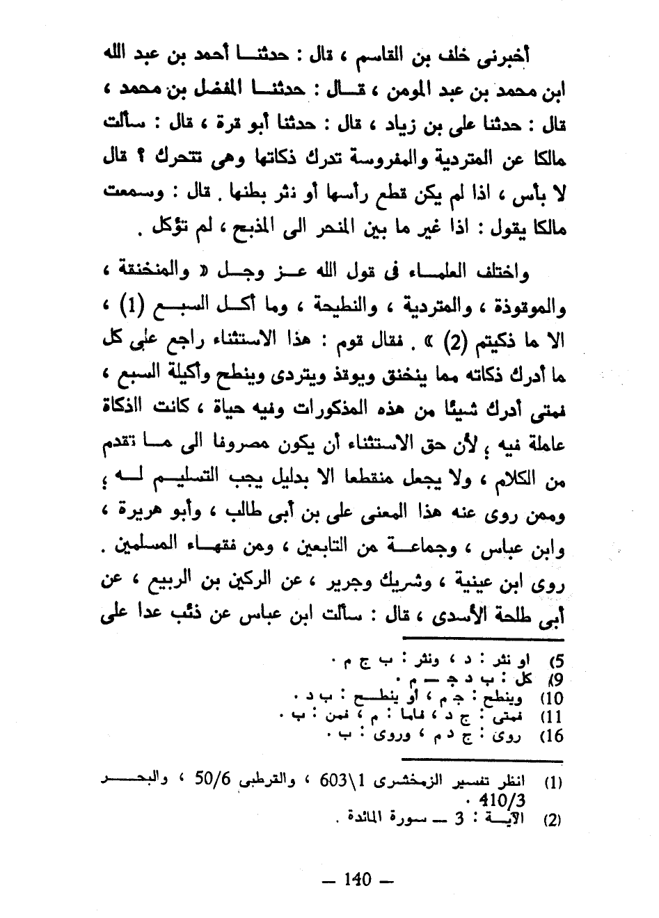 أَخْبَرَنِي خَلَفُ بْنُ الْقَاسِمِ قَالَ حَدَّثَنَا أَحْمَدُ بْنُ عَبْدِ اللَّهِ بْنِ مُحَمَّدِ بْنِ عَبْدِ الْمُؤْمِنِ قَالَ حَدَّثَنَا الْمُفَضَّلُ بْنُ مُحَمَّدٍ قَالَ حَدَّثَنَا عَلِيُّ بْنُ زِيَادٍ قَالَ حَدَّثَنَا أَبُو قُرَّةَ قَالَ سَأَلْتُ مَالِكًا عَنِ الْمُتَرَدِّيَةِ وَالْمَفْرُوسَةِ تُدْرَكُ ذَكَاتُهَا وَهِيَ تَتَحَرَّكُ قَالَ لَا بَأْسَ إِذَا لَمْ يَكُنْ قُطِعَ رَأْسُهَا أَوْ نُثِرَ بَطْنُهَا قَالَ وَسَمِعْتُ مَالِكًا يَقُولُ إِذَا غُيِّرَ مَا بَيْنَ الْمَنْحَرِ إِلَى الْمَذْبَحِ لَمْ تُؤْكَلْ واختلف العلماء في قوله اللَّهِ عَزَّ وَجَلَّ وَالْمُنْخَنِقَةُ وَالْمَوْقُوذَةُ وَالْمُتَرَدِّيَةُ وَالنَّطِيحَةُ وَمَا أَكَلَ السَّبُعُ إِلَّا مَا ذَكَّيْتُمْ فَقَالَ قَوْمٌ هَذَا الِاسْتِثْنَاءُ رَاجِعٌ عَلَى كُلِّ مَا أُدْرِكَ ذَكَاتُهُ مِمَّا يَنْخَنِقُ وَيُوقَذُ وَيَتَرَدَّى وَيُنْطَحُ وَأَكِيلَةُ السَّبُعِ فَمَتَى أَدْرَكَ شَيْئًا مِنْ هَذِهِ الْمَذْكُورَاتِ وَفِيهِ حَيَاةٌ كَانْتِ الذَّكَاةُ عَامِلَةٌ فِيهِ لِأَنَّ حَقَّ الِاسْتِثْنَاءِ أَنْ يَكُونَ مَصْرُوفًا إِلَى مَا تَقَدَّمَ مِنَ الْكَلَامِ وَلَا يُجْعَلُ مُنْقَطِعًا إِلَّا بِدَلِيلٍ يَجِبُ التَّسْلِيمُ لَهُ وَمِمَّنْ رُوِيَ عَنْهُ هَذَا الْمَعْنَى عَلِيُّ بْنُ أَبِي طَالِبٍ وَأَبُو هُرَيْرَةَ وَابْنُ عَبَّاسٍ وَجَمَاعَةٌ مِنَ التَّابِعِينَ وَمِنْ فُقَهَاءِ الْمُسْلِمِينَ رَوَى ابْنُ عُيَيْنَةَ وَشَرِيكٌ وَجَرِيرٌ عَنِ الرُّكَيْنِ بْنِ الرَّبِيعِ عَنْ أَبِي طَلْحَةَ الْأَسَدِيِّ قَالَ سَأَلْتُ ابْنَ عَبَّاسٍ عَنْ ذِئْبٍ عَدَا عَلَى