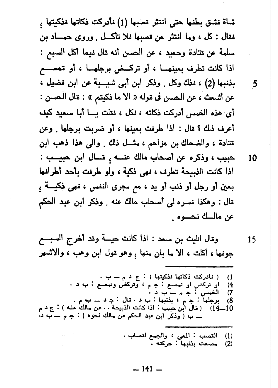 شَاةٍ فَشَقَّ بَطْنَهَا حَتَّى انْتَثَرَ قَصَبُهَا فَأَدْرَكْتُ ذَكَاتَهَا فَذَكَّيْتُهَا فَقَالَ كُلْ وَمَا انْتَثَرَ مِنْ قَصَبِهَا فَلَا تَأْكُلْ وَرَوَى حَمَّادُ بْنُ سَلَمَةَ عَنْ قَتَادَةَ وَحُمَيْدٍ عَنِ الْحَسَنِ أَنَّهُ قَالَ فِيمَا أَكَلَ السَّبُعُ إِذَا كَانَتْ تَطْرِفُ بِعَيْنِهَا أَوْ تَرْكُضُ بِرِجْلِهَا أَوْ تَمْصَعُ بِذَنَبِهَا فَذَكِّ وَكُلْ وَذَكَرَ ابْنُ أَبِي شَيْبَةَ عَنِ ابْنِ فُضَيْلٍ عَنْ أَشْعَثَ عَنِ الْحَسَنِ فِي قَوْلِهِ إِلَّا مَا ذَكَّيْتُمْ قَالَ الْحَسَنُ أَيُّ هَذِهِ الْخَمْسِ أَدْرَكْتَ ذَكَاتَهُ فَكُلْ فَقُلْتُ يَا أَبَا سَعِيدٍ كَيْفَ أَعْرِفُ ذَلِكَ قَالَ إِذَا طَرَفَتْ بِعَيْنِهَا أَوْ ضَرَبَتْ بِرِجْلِهَا وَعَنْ قَتَادَةَ وَالضَّحَّاكِ بْنِ مُزَاحِمٍ مِثْلَ ذَلِكَ وَإِلَى هَذَا ذَهَبَ ابْنُ حَبِيبٍ وَذَكَرَهُ عَنْ أَصْحَابِ مَالِكٍ عَنْهُ قَالَ ابْنُ حَبِيبٍ إِذَا كَانَتِ الذَّبِيحَةُ تَطْرِفُ فَهِيَ ذَكِيَّةٌ وَلَوْ طَرَفَتْ بِأَحَدِ أَطْرَافِهَا بِعَيْنٍ أو رجل أو ذئب أَوْ يَدٍ مَعَ مَجْرَى النَّفَسِ فَهِيَ ذَكِيَّةٌ قَالَ وَهَكَذَا فَسَّرَهُ لِي أَصْحَابُ مَالِكٍ عَنْهُ وَذَكَرَ ابْنُ عَبْدِ الْحَكَمِ عَنْ مَالِكٍ نَحْوَهُ وَقَالَ اللَّيْثُ بْنُ سَعْدٍ إِذَا كَانَتْ حَيَّةً وقد أخرج السبع جوفها أكلت إلا ما بان منها وهو قوله ابْنِ وَهْبٍ وَالْأَشْهَرُ