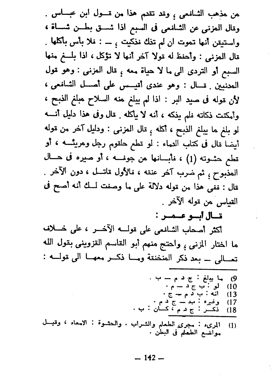 مِنْ مَذْهَبِ الشَّافِعِيِّ وَقَدْ تَقَدَّمَ هَذَا مِنْ قَوْلِ ابْنِ عَبَّاسٍ وَقَالَ الْمُزَنِيُّ عَنِ الشَّافِعِيِّ فِي السَّبُعِ إِذَا شَقَّ بَطْنَ شَاةٍ وَاسْتَيْقَنَ أَنَّهَا تَمُوتُ إِنْ لَمْ تُذْكَّ فَذُكِّيَتْ فَلَا بَأْسَ بِأَكْلِهَا قَالَ الْمُزَنِيُّ وَأَحْفَظُ لَهُ قَوْلًا آخَرَ أَنَّهَا لَا تُؤْكَلُ إِذَا بَلَغَ مِنْهَا السَّبُعُ أَوِ التَّرَدِّي إِلَى مَا لَا حَيَاةَ مَعَهُ قَالَ الْمُزَنِيُّ وَهُوَ قَوْلُ الْمَدَنِيِّينَ قَالَ وَهُوَ عِنْدِي أَقَيْسُ عَلَى أَصْلِ الشَّافِعِيِّ لِأَنَّ قوله في صيدالبر إِذَا لَمْ يَبْلُغْ مِنْهُ السِّلَاحُ مَبْلَغَ الذَّبْحِ وَأَمْكَنَتْ ذَكَاتُهُ فَلَمْ يُذَكِّهِ أَنَّهُ لَا يَأْكُلُهُ قَالَ وَفِي هَذَا دَلِيلٌ أَنَّهُ لَوْ بَلَغَ مَا يَبْلُغُ الذَّبْحُ أَكَلَهُ قَالَ الْمُزَنِيُّ وَدَلِيلٌ آخَرُ مِنْ قَوْلِهِ أَيْضًا قَالَ فِي كِتَابِ الدِّمَاءِ لَوْ قُطِعَ حُلْقُومُ رَجُلٍ وَمِرِّيئُهُ أَوْ قُطِعَ حَشْوَتُهُ فَأَبَانَهَا مِنْ جَوْفِهِ أَوْ صَيَّرَهُ فِي حَالِ الْمَذْبُوحِ ثُمَّ ضَرَبَ آخَرُ عُنُقَهُ فَالْأَوَّلُ قَاتِلٌ دُونَ الْآخَرِ قَالَ فَفِي هَذَا مِنْ قَوْلِهِ دَلَالَةٌ عَلَى مَا وَصَفْتُ لَكَ أَنَّهُ أَصَحُّ فِي الْقِيَاسِ مِنْ قَوْلِهِ الْآخَرِ قَالَ أَبُو عُمَرَ أَكْثَرُ أَصْحَابِ الشَّافِعِيِّ عَلَى قَوْلِهِ الْآخَرِ عَلَى خِلَافِ مَا اخْتَارَ الْمُزَنِيُّ وَاحْتَجَّ مِنْهُمْ أَبُو الْقَاسِمِ الْقَزْوِينِيُّ بِقَوْلِ اللَّهِ تَعَالَى بَعْدَ ذِكْرِ الْمُنْخَنِقَةِ وَمَا ذَكَرَ مَعَهَا إلى قوله