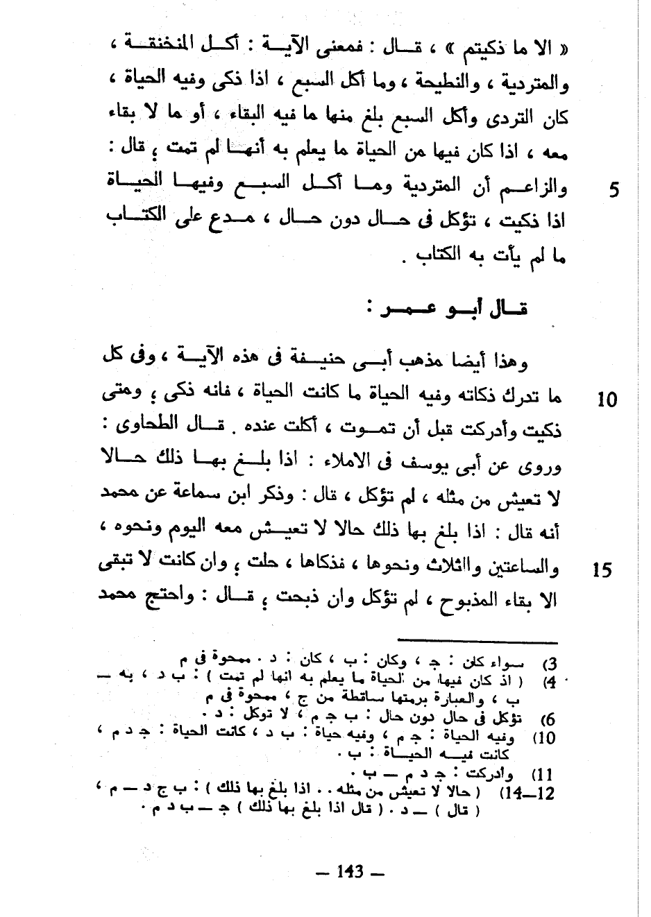 إِلَّا مَا ذَكَّيْتُمْ قَالَ فَمَعْنَى الْآيَةِ أَكْلُ الْمُنْخَنِقَةِ وَالْمُتَرَدِّيَةِ وَالنَّطِيحَةِ وَمَا أَكَلَ السَّبُعُ إِذَا ذُكِّيَ وَفِيهِ الْحَيَاةُ كَانَ التَّرَدِّي وَأَكْلُ السَّبُعِ بَلَغَ مِنْهَا مَا فِيهِ الْبَقَاءُ أَوْ مَا لَا بَقَاءَ مَعَهُ إِذَا كَانَ فِيهَا مِنَ الْحَيَاةِ مَا يُعْلَمُ بِهِ أَنَّهَا لَمْ تَمُتْ قَالَ وَالزَّاعِمُ أَنَّ الْمُتَرَدِّيَةَ وَمَا أَكَلَ السَّبُعُ وَفِيهَا الْحَيَاةُ إِذَا ذُكِّيَتْ تُؤْكَلُ فِي حَالٍ دُونَ حَالٍ مُدَّعٍ عَلَى الْكِتَابِ مَا لَمْ يَأْتِ بِهِ الْكِتَابُ قَالَ أَبُو عُمَرَ وَهَذَا أَيْضًا مَذْهَبُ أَبِي حَنِيفَةَ فِي هَذِهِ الْآيَةِ وَفِي كُلِّ مَا تُدْرَكُ ذَكَاتُهُ وَفِيهِ الْحَيَاةُ مَا كَانَتِ الْحَيَاةُ فَإِنَّهُ ذَكِيٌّ وَمَتَى ذُكِّيَتْ وَأُدْرِكَتْ قَبْلَ أَنْ تَمُوتَ أُكِلَتْ عِنْدَهُ قَالَ الطَّحَاوِيُّ وَرُوِيَ عَنْ أَبِي يُوسُفَ فِي الْإِمْلَاءِ إِذَا بَلَغَ بِهَا ذَلِكَ حَالًا لَا تَعِيشُ مِنْ مِثْلِهِ لَمْ تُؤْكَلْ قَالَ وَذَكَرَ ابْنُ سَمَاعَةَ عَنْ مُحَمَّدٍ أَنَّهُ قَالَ إِذَا بَلَغَ بِهَا ذَلِكَ حَالًا لَا تَعِيشُ مَعَهُ الْيَوْمَ وَنَحْوَهُ وَالسَّاعَتَيْنِ وَالثَّلَاثَ وَنَحْوَهَا فَذَكَّاهَا حَلَّتْ وَإِنْ كَانَتْ لَا تَبْقَى إِلَّا بَقَاءَ الْمَذْبُوحِ لَمْ تؤكل وإن ذبحت قال واحتج محمد