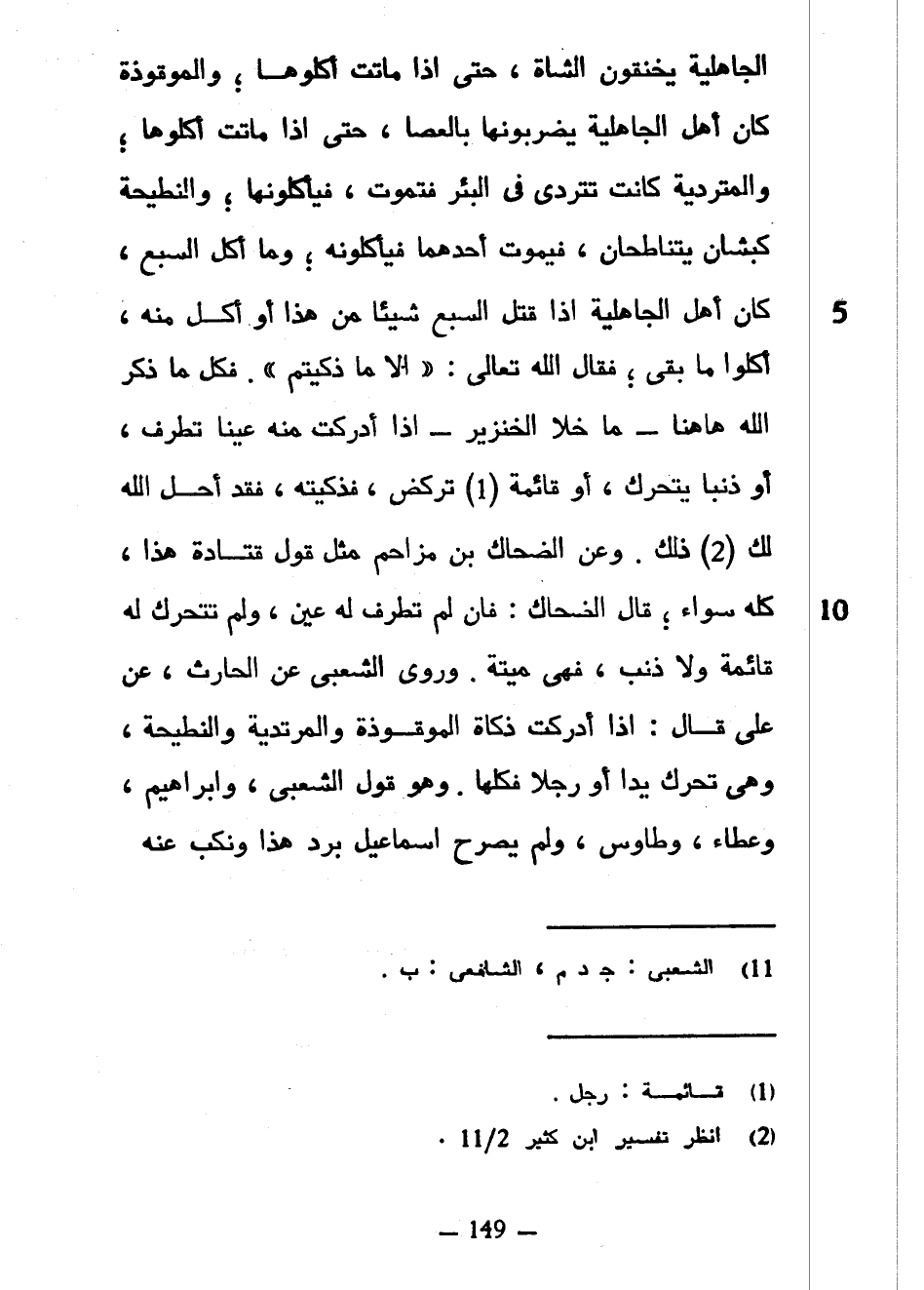 الْجَاهِلِيَّةِ يَخْنُقُونَ الشَّاةَ حَتَّى إِذَا مَاتَتْ أَكَلُوهَا وَالْمَوْقُوذَةُ كَانَ أَهْلُ الْجَاهِلِيَّةِ يَضْرِبُونَهَا بِالْعَصَا حَتَّى إِذَا مَاتَتْ أَكَلُوهَا وَالْمُتَرَدِّيَةُ كَانَتْ تَتَرَدَّى فِي الْبِئْرِ فَتَمُوتُ فَيَأْكُلُونَهَا وَالنَّطِيحَةُ كَبْشَانِ يَتَنَاطَحَانِ فَيَمُوتُ أَحَدُهُمَا فَيَأْكُلُونَهُ وَمَا أَكَلَ السَّبُعُ كَانَ أَهْلُ الْجَاهِلِيَّةِ إِذَا قَتَلَ السَّبُعُ شَيْئًا مِنْ هَذَا أَوْ أَكَلَ مِنْهُ أَكَلُوا مَا بَقِيَ فَقَالَ اللَّهُ تَعَالَى إِلَّا مَا ذَكَّيْتُمْ فَكُلُّ مَا ذكر الله هاهنا مَا خَلَا الْخِنْزِيرَ إِذَا أُدْرِكَتْ مِنْهُ عَيْنًا تَطْرِفُ أَوْ ذَنَبًا يَتَحَرَّكُ أَوْ قَائِمَةً تَرْكُضُ فَذَكَّيْتَهُ فَقَدْ أَحَلَّ اللَّهُ لَكَ ذَلِكَ وَعَنِ الضَّحَّاكِ بْنِ مُزَاحِمٍ مِثْلَ قَوْلِ قَتَادَةَ هَذَا كُلُّهُ سَوَاءٌ قَالَ الضَّحَّاكُ فَإِنْ لَمْ تَطْرِفْ لَهُ عَيْنٌ وَلَمْ تَتَحَرَّكْ لَهُ قَائِمَةٌ وَلَا ذَنَبٌ فَهِيَ مَيْتَةٌ وَرَوَى الشَّعْبِيُّ عَنِ الْحَارِثِ عَنْ عَلِيٍّ قَالَ إِذَا أَدْرَكْتَ ذَكَاةَ الْمَوْقُوذَةِ والمرتدية وَالنَّطِيحَةِ وَهِيَ تُحَرِّكُ يَدًا أَوْ رِجْلًا فَكُلْهَا وَهُوَ قَوْلُ الشَّعْبِيِّ وَإِبْرَاهِيمَ وَعَطَاءٍ وَطَاوُسٍ وَلَمْ يُصَرِّحْ إِسْمَاعِيلُ بِرَدِّ هَذَا وَنَكَبَ عَنْهُ