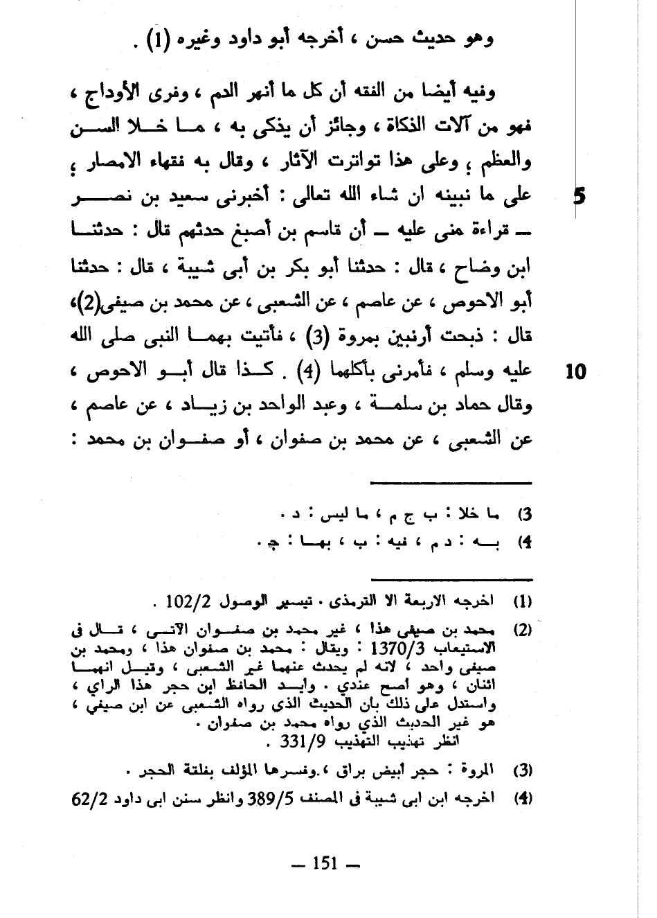وَهُوَ حَدِيثٌ حَسَنٌ أَخْرَجَهُ أَبُو دَاوُدَ وَغَيْرُهُ وَفِيهِ أَيْضًا مِنَ الْفِقْهِ أَنَّ كُلَّ مَا أَنْهَرَ الدَّمَ وَفَرَى الْأَوْدَاجَ فَهُوَ مِنْ آلَاتِ الذَّكَاةِ وَجَائِزٌ أَنْ يُذَكَّى بِهِ مَا خَلَا السِّنَّ وَالْعَظْمَ وَعَلَى هَذَا تَوَاتَرَتِ الْآثَارُ وَقَالَ بِهِ فُقَهَاءُ الْأَمْصَارِ عَلَى مَا نُبَيِّنُهُ إِنْ شَاءَ اللَّهُ تَعَالَى أَخْبَرَنِي سَعِيدُ بْنُ نَصْرٍ قِرَاءَةً مِنِّي عَلَيْهِ أَنَّ قَاسِمَ بْنَ أَصْبَغَ حَدَّثَهُمْ قَالَ حَدَّثَنَا ابْنُ وَضَّاحٍ قَالَ حَدَّثَنَا أَبُو بَكْرِ بْنُ أَبِي شَيْبَةَ قَالَ حَدَّثَنَا أَبُو الْأَحْوَصِ عَنْ عَاصِمٍ عَنِ الشَّعْبِيِّ عَنْ مُحَمَّدِ بْنِ صَيْفِيٍّ قَالَ ذَبَحْتُ أَرْنَبَيْنِ بِمَرْوَةَ فَأَتَيْتُ بِهِمَا النَّبِيَّ صَلَّى اللَّهُ عَلَيْهِ وَسَلَّمَ فَأَمَرَنِي بِأَكْلِهِمَا كَذَا قَالَ أَبُو الْأَحْوَصِ وَقَالَ حَمَّادُ بْنُ سَلَمَةَ وَعَبْدُ الْوَاحِدِ بْنُ زِيَادٍ عَنْ عَاصِمٍ عَنِ الشَّعْبِيِّ عَنْ مُحَمَّدِ بْنِ صَفْوَانَ أَوْ صَفْوَانَ بْنِ مُحَمَّدٍ