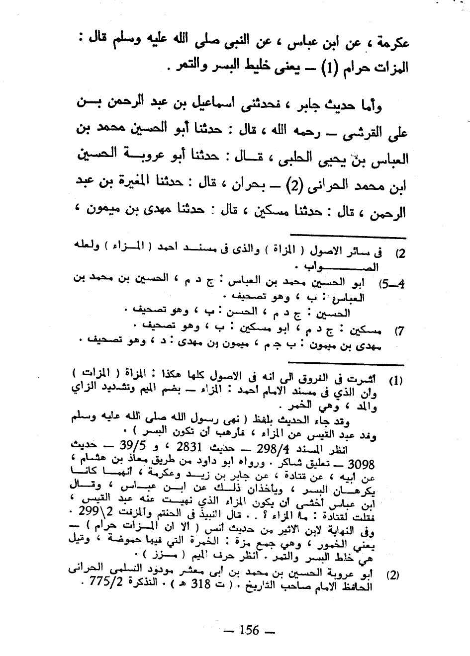 عِكْرِمَةَ عَنِ ابْنِ عَبَّاسٍ عَنِ النَّبِيِّ صَلَّى اللَّهُ عَلَيْهِ وَسَلَّمَ قَالَ الْمَزَّاتُ حَرَامٌ يَعْنِي خَلِيطَ الْبُسْرِ وَالتَّمْرِ وَأَمَّا حَدِيثُ جَابِرٍ فَحَدَّثَنِي إسماعيل بن عبد الرحمن بن على القرشي رَحِمَهُ اللَّهُ قَالَ حَدَّثَنَا أَبُو الْحُسَيْنِ مُحَمَّدُ بْنُ الْعَبَّاسِ بْنِ يَحْيَى الْحَلَبِيُّ قَالَ حَدَّثَنَا أَبُو عَرُوبَةَ الْحُسَيْنُ بْنُ مُحَمَّدٍ الْحَرَّانِيُّ بِحَرَّانَ قَالَ حَدَّثَنَا الْمُغِيرَةُ بْنُ عَبْدِ الرَّحْمَنِ قَالَ حَدَّثَنَا مِسْكِينٌ قَالَ حَدَّثَنَا مَهْدِيُّ بْنُ مَيْمُونٍ