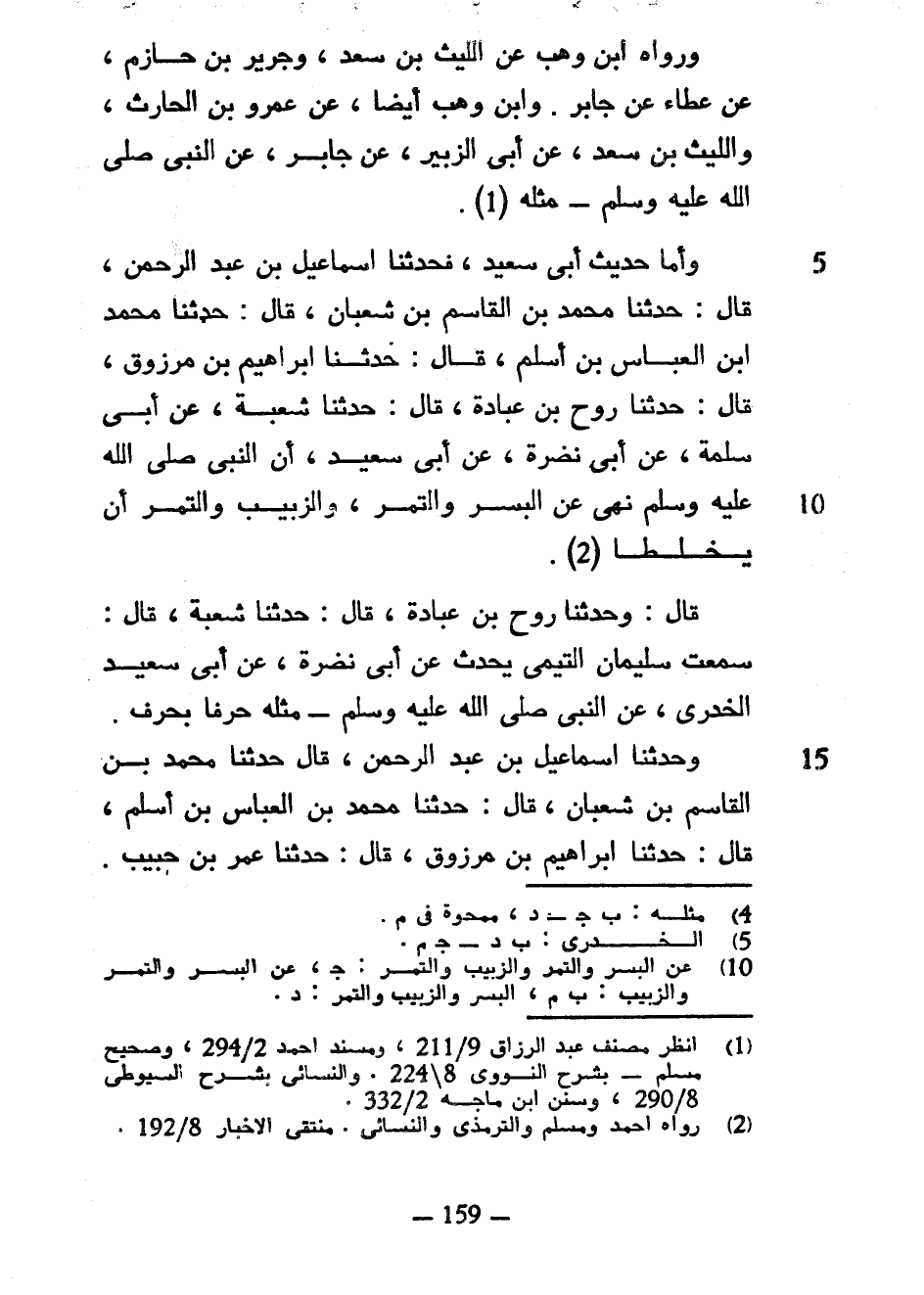 وَرَوَاهُ ابْنُ وَهْبٍ عَنِ اللَّيْثِ بْنِ سَعْدٍ وَجَرِيرِ بْنِ حَازِمٍ عَنْ عَطَاءٍ عَنْ جَابِرٍ وَابْنِ وَهْبٍ أَيْضًا عَنْ عَمْرِو بْنِ الْحَارِثِ وَاللَّيْثِ بْنِ سَعْدٍ عَنْ أَبِي الزُّبَيْرِ عَنْ جَابِرٍ عَنِ النَّبِيِّ صَلَّى اللَّهُ عَلَيْهِ وسلم مِثْلَهُ وَأَمَّا حَدِيثُ أَبِي سَعِيدٍ فَحَدَّثَنَا إِسْمَاعِيلُ بْنُ عَبْدِ الرَّحْمَنِ قَالَ حَدَّثَنَا مُحَمَّدُ بْنُ الْقَاسِمِ بْنِ شَعْبَانَ قَالَ حَدَّثَنَا مُحَمَّدُ بْنُ الْعَبَّاسِ بْنِ أَسْلَمَ قَالَ حَدَّثَنَا إِبْرَاهِيمُ بْنُ مَرْزُوقٍ قَالَ حَدَّثَنَا رَوْحُ بْنُ عُبَادَةَ قَالَ حَدَّثَنَا شُعْبَةُ عَنْ أَبِي سَلَمَةَ عَنْ أَبِي نَضْرَةَ عَنْ أَبِي سَعِيدٍ أَنَّ النَّبِيَّ صَلَّى اللَّهُ عَلَيْهِ وَسَلَّمَ نَهَى عَنِ الْبُسْرِ وَالتَّمْرِ وَالزَّبِيبِ وَالتَّمْرِ أَنْ يُخْلَطَا قَالَ وَحَدَّثَنَا رَوْحُ بْنُ عُبَادَةَ قَالَ حَدَّثَنَا شُعْبَةُ قَالَ سَمِعْتُ سُلَيْمَانَ التَّيْمِيَّ يُحَدِّثُ عَنْ أَبِي نَضْرَةَ عَنْ أَبِي سَعِيدٍ الْخُدْرِيِّ عَنِ النَّبِيِّ صَلَّى اللَّهُ عَلَيْهِ وَسَلَّمَ مِثْلَهُ حَرْفًا بِحَرْفٍ وَحَدَّثَنَا إِسْمَاعِيلُ بْنُ عَبْدِ الرَّحْمَنِ قَالَ حَدَّثَنَا مُحَمَّدُ بْنُ الْقَاسِمِ بْنِ شَعْبَانَ قَالَ حَدَّثَنَا مُحَمَّدُ بْنُ الْعَبَّاسِ بْنِ أَسْلَمَ قَالَ حَدَّثَنَا إِبْرَاهِيمُ بْنُ مَرْزُوقٍ قَالَ حَدَّثَنَا عُمَرُ بْنُ حَبِيبٍ