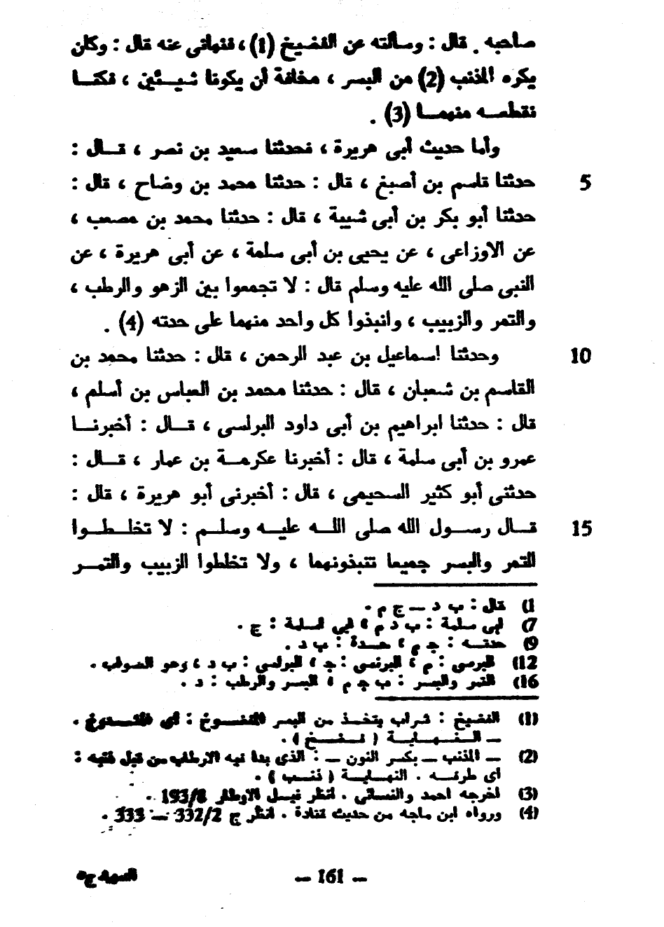 صاحبه قال وسأتله عَنِ الْفَضِيخِ فَنَهَانِي عَنْهُ قَالَ وَكَانَ يَكْرَهُ الْمُذَنَّبَ مِنَ الْبُسْرِ مَخَافَةَ أَنْ يَكُونَا شَيْئَيْنِ فَكُنَّا نَقْطَعُهُ مِنْهُمَا وَأَمَّا حَدِيثُ أَبِي هُرَيْرَةَ فَحَدَّثَنَا سَعِيدُ بْنُ نَصْرٍ قَالَ حَدَّثَنَا قَاسِمُ بْنُ أَصْبَغَ قَالَ حَدَّثَنَا مُحَمَّدُ بْنُ وَضَّاحٍ قَالَ حَدَّثَنَا أَبُو بَكْرِ بْنُ أَبِي شَيْبَةَ قَالَ حَدَّثَنَا مُحَمَّدُ بْنُ مُصْعَبٍ عَنِ الْأَوْزَاعِيِّ عَنْ يَحْيَى بْنِ أَبِي سَلَمَةَ عَنْ أَبِي هُرَيْرَةَ عَنِ النَّبِيِّ صَلَّى اللَّهُ عَلَيْهِ وَسَلَّمَ قال لا تجمعوا بن الزهو والرطب والتمر والزبيب وانبذواكل وَاحِدٍ مِنْهُمَا عَلَى حِدَتِهِ وَحَدَّثَنَا إِسْمَاعِيلُ بْنُ عَبْدِ الرَّحْمَنِ قَالَ حَدَّثَنَا مُحَمَّدُ بْنُ الْقَاسِمِ بْنِ شَعْبَانَ قَالَ حَدَّثَنَا مُحَمَّدُ بْنُ الْعَبَّاسِ بْنِ أَسْلَمَ قَالَ حَدَّثَنَا إِبْرَاهِيمُ بْنُ أَبِي دَاوُدَ الْبُرُلُّسِيُّ قَالَ أَخْبَرَنَا عَمْرُو بْنُ أَبِي سَلَمَةَ قَالَ أَخْبَرَنَا عِكْرِمَةُ بْنُ عَمَّارٍ قَالَ حَدَّثَنِي أَبُو كَثِيرٍ السُّحَيْمِيُّ قَالَ أَخْبَرَنِي أَبُو هُرَيْرَةَ قَالَ قَالَ رَسُولُ اللَّهِ صَلَّى اللَّهُ عَلَيْهِ وَسَلَّمَ لَا تَخْلِطُوا التَّمْرَ وَالْبُسْرَ جَمِيعًا تَنْبِذُونَهُمَا وَلَا تَخْلِطُوا الزَّبِيبَ وَالتَّمْرَ