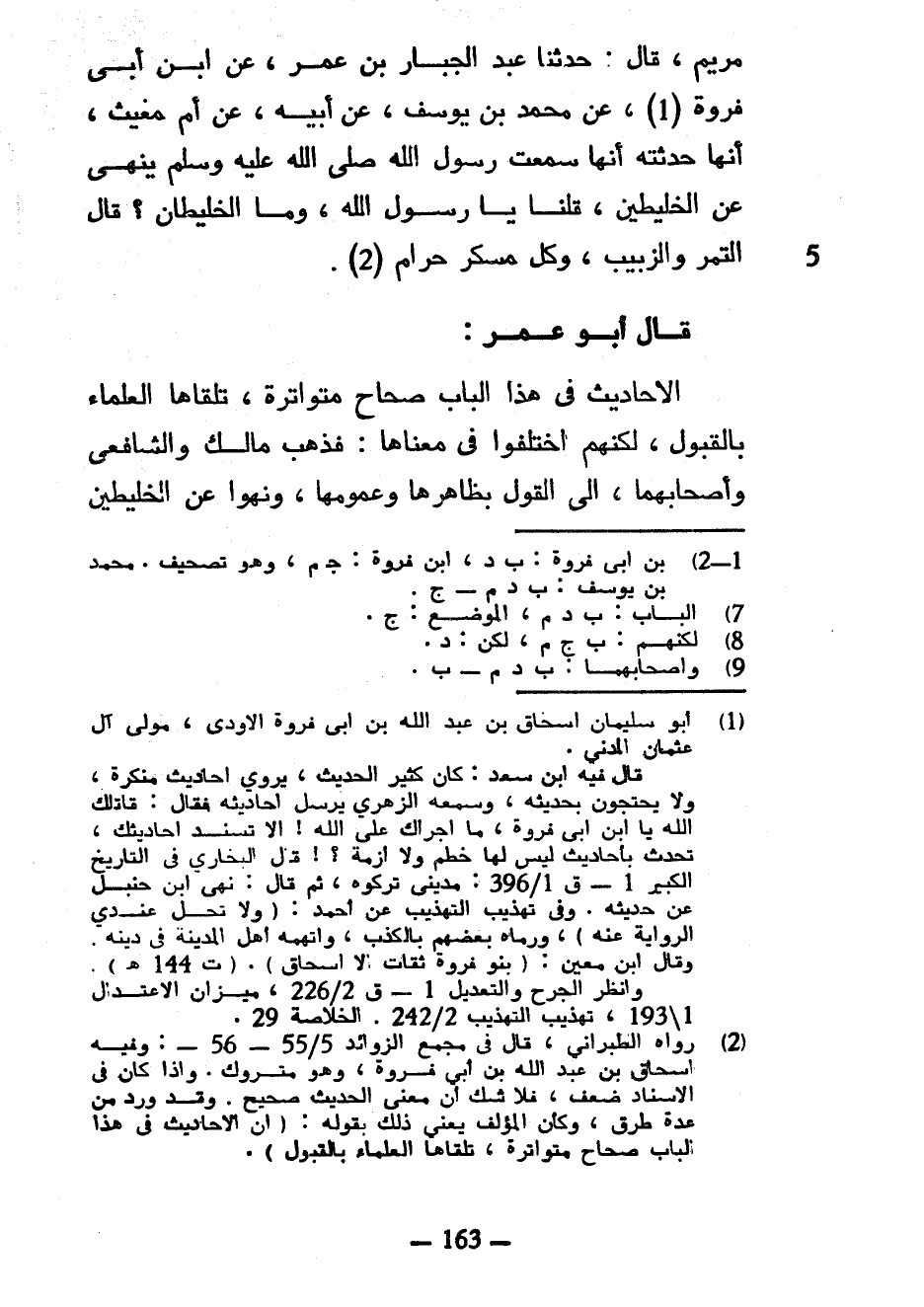 مَرْيَمَ قَالَ حَدَّثَنَا عَبْدُ الْجَبَّارِ بْنُ عُمَرَ عَنِ ابْنِ أَبِي فَرْوَةَ عَنْ مُحَمَّدِ بْنِ يُوسُفَ عَنْ أَبِيهِ عَنْ أُمِّ مُغِيثٍ أَنَّهَا حَدَّثَتْهُ أَنَّهَا سَمِعَتْ رَسُولَ اللَّهِ صَلَّى اللَّهُ عَلَيْهِ وَسَلَّمَ يَنْهَى عَنِ الْخَلِيطَيْنِ قُلْنَا يَا رَسُولَ اللَّهِ وَمَا الْخَلِيطَانِ قَالَ التَّمْرُ وَالزَّبِيبُ وَكُلُّ مُسْكِرٍ حَرَامٌ قَالَ أَبُو عُمَرَ الْأَحَادِيثُ فِي هَذَا الْبَابِ صِحَاحٌ مُتَوَاتِرَةٌ تَلَقَّاهَا الْعُلَمَاءُ بِالْقَبُولِ لَكِنَّهُمُ اخْتَلَفُوا فِي مَعْنَاهَا فَذَهَبَ مَالِكٌ وَالشَّافِعِيُّ وَأَصْحَابُهُمَا إِلَى الْقَوْلِ بِظَاهِرِهَا وَعُمُومِهَا وَنَهَوْا عن الخليطين