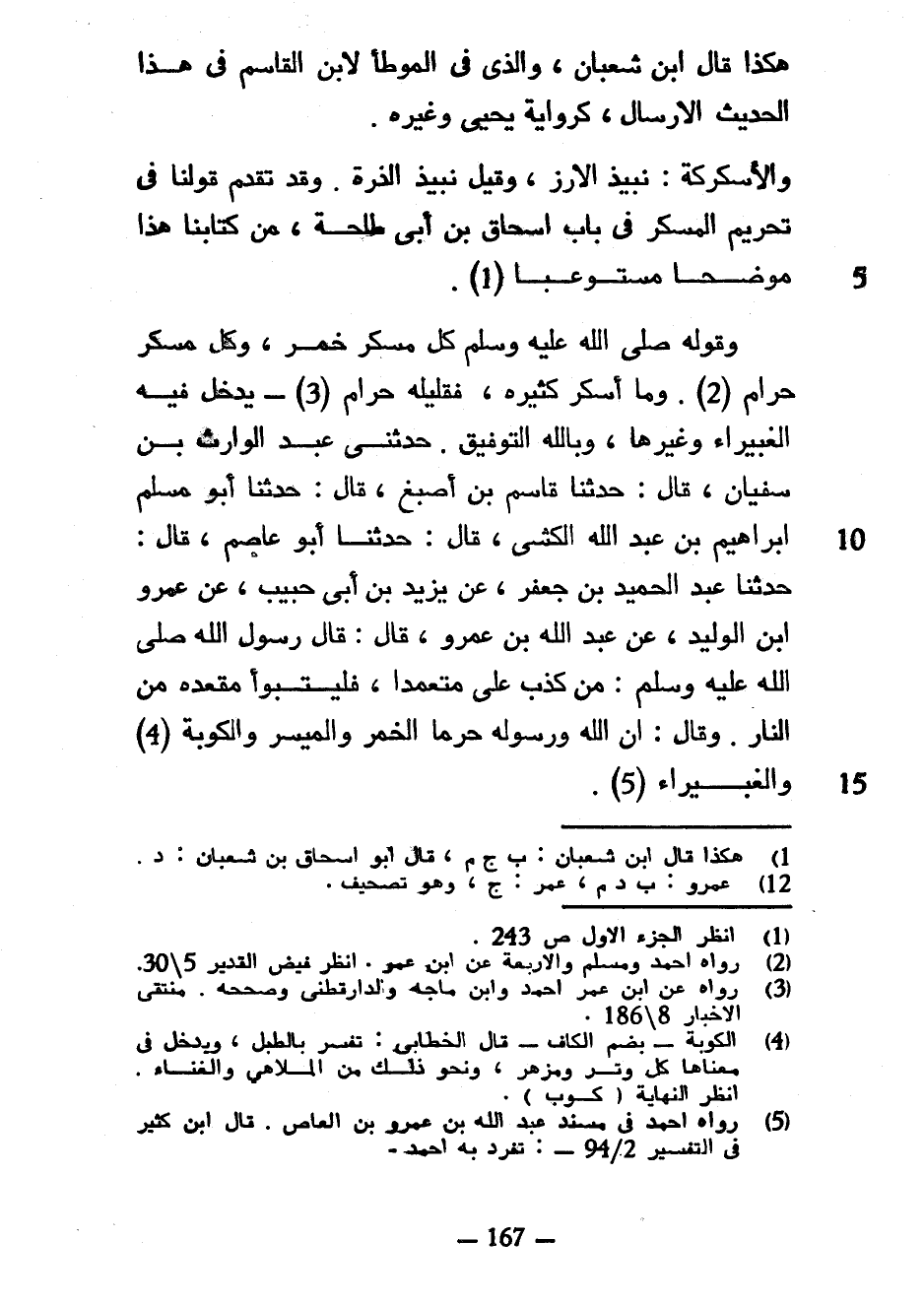 هَكَذَا قَالَ ابْنُ شَعْبَانَ وَالَّذِي فِي الْمُوَطَّإِ لِابْنِ الْقَاسِمِ فِي هَذَا الْحَدِيثِ الْإِرْسَالُ كَرِوَايَةِ يَحْيَى وَغَيْرِهِ وَالْأَسْكَرْكَةُ نَبِيذُ الْأُرْزِ وَقِيلَ نَبِيذُ الذُّرَةِ وَقَدْ تَقَدَّمَ قَوْلُنَا فِي تَحْرِيمِ الْمُسْكِرِ فِي بَابِ إِسْحَاقَ بْنِ أَبِي طَلْحَةَ مِنْ كِتَابِنَا هَذَا مُوَضَّحًا مُسْتَوْعَبًا وَقَوْلُهُ صَلَّى اللَّهُ عَلَيْهِ وَسَلَّمَ كُلُّ مُسْكِرٍ خَمْرٌ وَكُلُّ مُسْكِرٍ حَرَامٌ وَمَا أَسْكَرَ كَثِيرُهُ فَقَلِيلُهُ حَرَامٌ يَدْخُلُ فِيهِ الْغُبَيْرَاءُ وَغَيْرُهَا وَبِاللَّهِ التَّوْفِيقُ حَدَّثَنِي عَبْدُ الْوَارِثِ بْنُ سُفْيَانَ قَالَ حَدَّثَنَا قَاسِمُ بْنُ أَصْبَغَ قَالَ حَدَّثَنَا أَبُو مُسْلِمٍ إِبْرَاهِيمُ بْنُ عَبْدِ اللَّهِ الْكَشِّيُّ قَالَ حَدَّثَنَا أَبُو عَاصِمٍ قَالَ حَدَّثَنَا عَبْدِ الْحَمِيدِ بْنِ جَعْفَرٍ عَنْ يَزِيدَ بْنِ أَبِي حَبِيبٍ عَنْ عَمْرِو بْنِ الْوَلِيدِ عَنْ عَبْدِ اللَّهِ بْنِ عَمْرٍو قَالَ قَالَ رَسُولُ اللَّهِ صَلَّى اللَّهُ عَلَيْهِ وَسَلَّمَ مَنْ كَذَبَ عَلَيَّ مُتَعَمِّدًا فَلْيَتَبَوَّأْ مَقْعَدَهُ مِنَ النَّارِ وَقَالَ إِنَّ اللَّهَ وَرَسُولَهُ حَرَّمَا الْخَمْرَ وَالْمَيْسِرَ وَالْكُوبَةَ وَالْغُبَيْرَاءَ