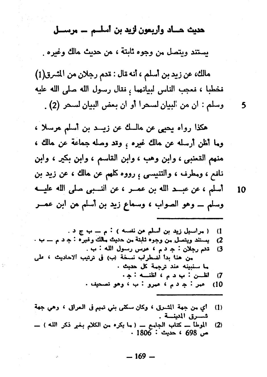 حَدِيثٌ حَادٍ وَأَرْبَعُونَ لِزَيْدِ بْنِ أَسْلَمَ مُرْسَلٌ يَسْتَنِدُ وَيَتَّصِلُ مِنْ وُجُوهٍ ثَابِتَةٍ مِنْ حَدِيثِ مَالِكٍ وَغَيْرِهِ مَالِكٌ عَنْ زَيْدِ بْنِ أَسْلَمَ أَنَّهُ قَالَ قَدِمَ رَجُلَانِ مِنَ الْمَشْرِقِ فَخَطَبَا فَعَجِبَ النَّاسُ لِبَيَانِهِمَا فَقَالَ رَسُولُ اللَّهِ صَلَّى اللَّهُ عَلَيْهِ وَسَلَّمَ إِنَّ مِنَ الْبَيَانِ لَسِحْرًا أَوْ إِنَّ بَعْضَ الْبَيَانِ لَسِحْرٌ هَكَذَا رَوَاهُ يَحْيَى عَنْ مَالِكٍ عَنْ زَيْدِ بْنِ أَسْلَمَ مُرْسَلًا وَمَا أَظُنُّ أَرْسَلَهُ عَنْ مَالِكٍ غَيْرُهُ وَقَدْ وَصَلَهُ جَمَاعَةٌ عَنْ مَالِكٍ مِنْهُمُ الْقَعْنَبِيُّ وَابْنُ وَهْبٍ وَابْنُ الْقَاسِمِ وَابْنُ بُكَيْرٍ وَابْنُ نَافِعٍ وَمُطَرِّفٌ وَالتِّنِّيسِيُّ رَوَوْهُ كُلُّهُمْ عَنْ مَالِكٍ عَنْ زَيْدِ بْنِ أَسْلَمَ عَنْ عَبْدِ اللَّهِ بْنِ عُمَرَ عَنِ النَّبِيِّ صَلَّى اللَّهُ عَلَيْهِ وَسَلَّمَ وَهُوَ الصَّوَابُ وَسَمَاعُ زَيْدِ بْنِ أَسْلَمَ مِنَ ابْنِ عُمَرَ