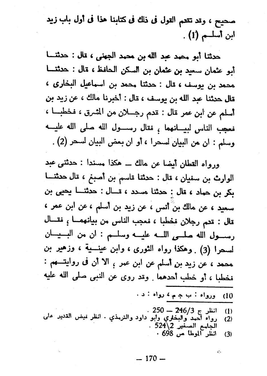 صَحِيحٌ وَقَدْ تَقَدَّمَ الْقَوْلُ فِي ذَلِكَ فِي كتابنا هذا في أول باب زيد ابن أَسْلَمَ حَدَّثَنَا أَبُو مُحَمَّدِ بْنُ عَبْدُ اللَّهِ بْنُ مُحَمَّدٍ الْجُهَنِيُّ قَالَ حَدَّثَنَا أَبُو عُثْمَانَ سَعِيدُ بْنُ عُثْمَانَ بْنِ السَّكَنِ الْحَافِظُ قَالَ حَدَّثَنَا مُحَمَّدُ بْنُ يُوسُفَ قَالَ حَدَّثَنَا مُحَمَّدُ بْنُ إِسْمَاعِيلَ الْبُخَارِيُّ قَالَ حَدَّثَنَا عَبْدُ اللَّهِ بْنُ يُوسُفَ قَالَ أَخْبَرَنَا مَالِكٍ عَنْ زَيْدِ بْنِ أَسْلَمَ عَنِ ابْنِ عُمَرَ قَالَ قَدِمَ رَجُلَانِ مِنَ الْمَشْرِقِ فَخَطَبَا فَعَجِبَ النَّاسُ لِبَيَانِهِمَا فَقَالَ رَسُولُ اللَّهِ صَلَّى اللَّهُ عَلَيْهِ وَسَلَّمَ إِنَّ مِنَ الْبَيَانِ لَسِحْرًا أَوْ إِنَّ بَعْضَ الْبَيَانِ لَسِحْرٌ وَرَوَاهُ الْقَطَّانُ أَيْضًا عَنْ مَالِكٍ هَكَذَا مُسْنَدًا حَدَّثَنِي عَبْدُ الْوَارِثِ بْنُ سُفْيَانَ قَالَ حَدَّثَنَا قَاسِمُ بْنُ أَصْبَغَ قَالَ حَدَّثَنَا بَكْرُ بْنُ حَمَّادٍ قَالَ حَدَّثَنَا مُسَدَّدٌ قَالَ حَدَّثَنَا يَحْيَى بْنُ سَعِيدٍ عَنْ مَالِكِ بْنِ أَنَسٍ عَنْ زَيْدِ بْنِ أَسْلَمَ عَنِ ابْنِ عُمَرَ قَالَ قَدِمَ رَجُلَانِ فَخَطَبَا فَعَجِبَ النَّاسُ مِنْ بَيَانِهِمَا فَقَالَ رَسُولُ اللَّهِ صَلَّى اللَّهُ عَلَيْهِ وَسَلَّمَ إِنَّ مِنَ الْبَيَانِ لَسِحْرًا وَهَكَذَا رواه الثوري وابن عينية! وَزُهَيْرُ بْنِ مُحَمَّدٍ عَنْ زَيْدِ بْنِ أَسْلَمَ عَنْ ابْنِ عُمَرَ إِلَّا أَنَّ فِي رِوَايَتِهِمْ فَخَطَبَا أَوْ خَطَبَ أَحَدُهُمَا وَقَدْ رُوِيَ عَنِ النَّبِيِّ صَلَّى اللَّهُ عَلَيْهِ