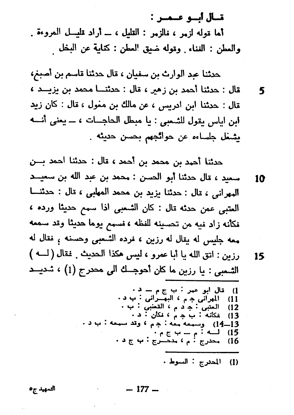 قَالَ أَبُو عُمَرَ أَمَّا قَوْلُهُ لِزَمِرُ فَالزَّمِرُ الْقَلِيلُ أَرَادَ قَلِيلَ الْمُرُوءَةِ وَالْعَطَنُ الْفِنَاءُ وَقَوْلُهُ ضَيَّقُ الْعَطَنِ كِنَايَةٌ عَنِ الْبُخْلِ حَدَّثَنَا عَبْدُ الْوَارِثِ بْنُ سُفْيَانَ قَالَ حَدَّثَنَا قَاسِمُ بْنُ أَصْبَغَ قَالَ حَدَّثَنَا أَحْمَدُ بْنُ زُهَيْرٍ قَالَ حَدَّثَنَا مُحَمَّدُ بْنُ يَزِيدَ قَالَ حَدَّثَنَا ابْنُ إِدْرِيسَ عَنْ مَالِكِ بْنِ مَغْوَلٍ قَالَ كَانَ زيد ابن إِيَاسٍ يَقُولُ لِلشَّعْبِيِّ يَا مُبْطِلَ الْحَاجَاتِ يَعْنِي أَنَّهُ يَشْغَلُ جُلَسَاءَهُ عَنْ حَوَائِجِهِمْ بِحُسْنِ حَدِيثِهِ حَدَّثَنَا أَحْمَدُ بْنُ مُحَمَّدِ بْنِ أَحْمَدَ قَالَ حَدَّثَنَا أَحْمَدُ بْنُ سَعِيدٍ قَالَ حَدَّثَنَا أَبُو الْحَسَنِ مُحَمَّدُ بْنُ عَبْدِ اللَّهِ بْنِ سَعِيدٍ الْمِهْرَانِيُّ قَالَ حَدَّثَنَا يَزِيدُ بْنُ مُحَمَّدٍ الْمُهَلَّبِيُّ قَالَ حَدَّثَنَا الْعُتْبِيُّ عَمَّنْ حَدَّثَهُ قَالَ كَانَ الشَّعْبِيُّ إِذَا سَمِعَ حَدِيثًا وَرَدَّهُ فَكَأَنَّهُ زَادَ فِيهِ مِنْ تَحْسِينِهِ لِلَفْظِهِ فَسَمِعَ يَوْمًا حَدِيثًا وَقَدْ سَمِعَهُ مَعَهُ جَلِيسٌ لَهُ يُقَالُ لَهُ رَزِينٌ فَرَدَّهُ الشَّعْبِيُّ وَحَسَّنُهُ فَقَالَ لَهُ رَزِينٌ اتَّقِ اللَّهَ يَا أَبَا عَمْرٍو لَيْسَ هَكَذَا الْحَدِيثُ فَقَالَ (لَهُ) الشَّعْبِيُّ يَا رَزِينُ مَا كَانَ أَحْوَجَكَ إِلَى مُحَدْرَجٍ شَدِيدِ