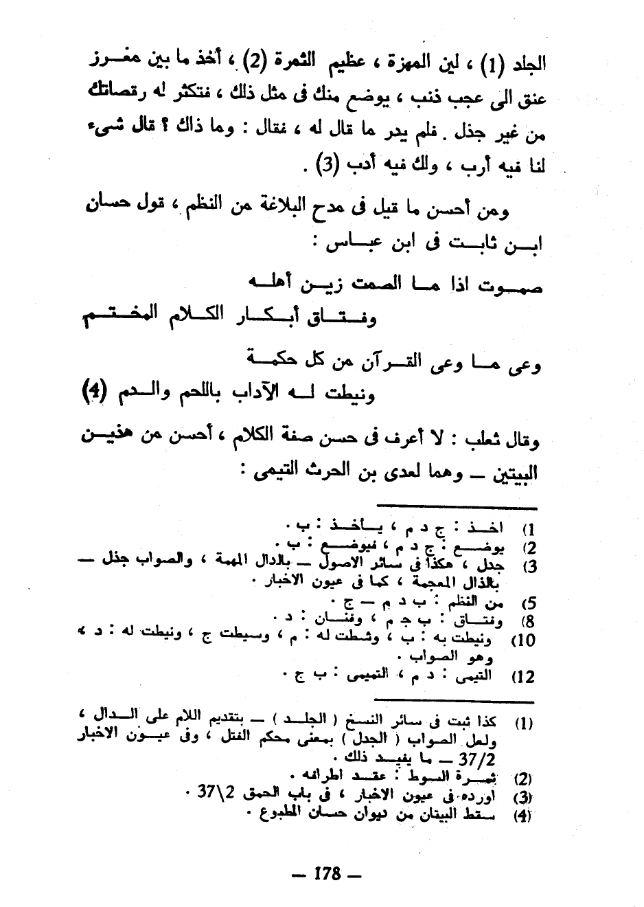 الْجِلْدِ لَيِّنِ المَهَزَّةِ عَظِيمِ الثَّمَرَةِ أَخَذَ مَا بَيْنَ مَغْرَزِ عُنُقٍ إِلَى عَجَبِ ذَنْبٍ يُوضَعُ مِنْكَ فِي مِثْلِ ذَلِكَ فَتَكْثُرُ لَهُ رَقَصَاتُكَ مِنْ غَيْرِ جَذْلٍ فَلَمْ يَدْرِ مَا قَالَ لَهُ فَقَالَ وَمَا ذَاكَ قَالَ شَيْءٌ لَنَا فِيهِ أَرَبٌ وَلَكَ فِيهِ أَدَبٌ وَمَنْ أَحْسَنِ مَا قِيلَ فِي مَدْحِ الْبَلَاغَةِ مِنَ النَّظْمِ قَوْلُ حَسَّانَ بْنِ ثَابِتٍ فِي ابْنِ عَبَّاسٍ ... صَمُوتٌ إِذَا مَا الصَّمْتُ زَيَّنَ أَهْلَهُ ... وَفَتَّاقُ أَبْكَارِ الْكَلَامِ الْمُخَتَّمِ ... ... وَعَى مَا وَعَى الْقُرْآنُ مِنْ كُلِّ حِكْمَةٍ ... وَنِيطَتْ لَهُ الْآدَابُ بِاللَّحْمِ وَالدَّمِ ... وَقَالَ ثَعْلَبٌ لَا أَعْرِفُ فِي حُسْنِ صِفَةِ الْكَلَامِ أَحْسَنَ مِنْ هَذَيْنِ الْبَيْتَيْنِ وَهُمَا لعدي بن الحرث التيمي