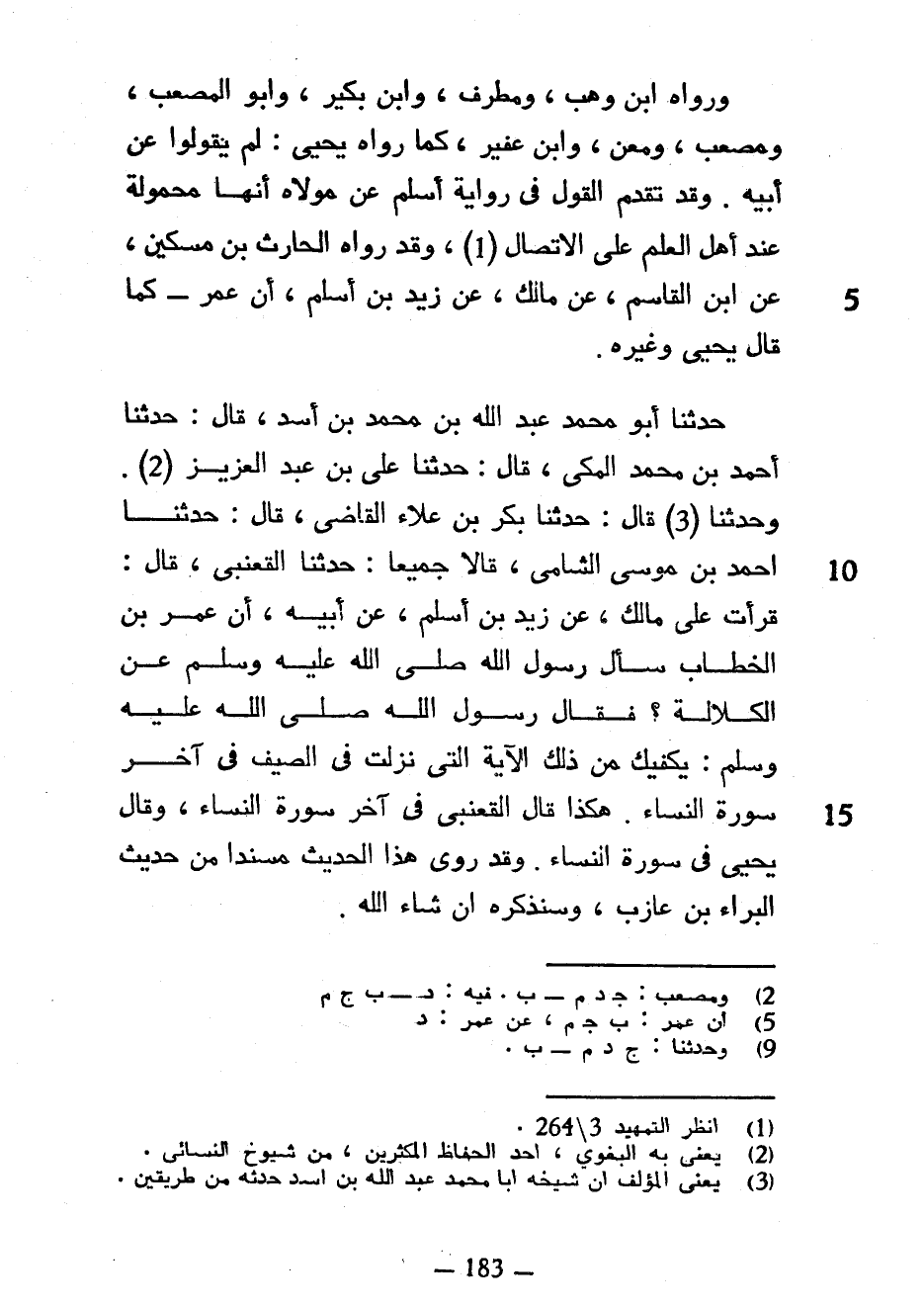 وَرَوَاهُ ابْنُ وَهْبٍ وَمُطَرِّفٌ وَابْنُ بُكَيْرٍ وَأَبُو الْمُصْعَبِ وَمُصْعَبٌ وَمَعْنٌ وَابْنُ عُفَيْرٍ كَمَا رَوَاهُ يَحْيَى لَمْ يَقُولُوا عَنْ أَبِيهِ وَقَدْ تَقَدَّمَ الْقَوْلُ فِي رِوَايَةِ أَسْلَمَ عَنْ مَوْلَاهُ أَنَّهَا مَحْمُولَةٌ عِنْدَ أَهْلِ الْعِلْمِ عَلَى الِاتِّصَالِ وَقَدْ رَوَاهُ الْحَارِثُ بْنُ مِسْكِينٍ عَنِ ابْنِ الْقَاسِمِ عَنْ مَالِكٍ عَنْ زَيْدِ بْنِ أَسْلَمَ أَنَّ عُمَرَ كَمَا قَالَ يَحْيَى وَغَيْرُهُ حَدَّثَنَا أَبُو مُحَمَّدٍ عَبْدُ اللَّهِ بْنُ مُحَمَّدِ بْنِ أَسَدٍ قَالَ حَدَّثَنَا أَحْمَدُ بْنُ مُحَمَّدِ الْمَكِّيُّ قَالَ حَدَّثَنَا عَلِيُّ بْنُ عَبْدِ الْعَزِيزِ وَحَدَّثَنَا قَالَ حَدَّثَنَا بَكْرُ بْنُ عَلَاءٍ الْقَاضِي قَالَ حَدَّثَنَا أَحْمَدُ بْنُ مُوسَى الشَّامِيُّ قَالَا جَمِيعًا حَدَّثَنَا الْقَعْنَبِيُّ قَالَ قَرَأْتُ عَلَى مَالِكٌ عَنْ زَيْدِ بْنِ أَسْلَمَ عَنْ أَبِيهِ أَنَّ عُمَرَ بْنَ الْخَطَّابِ سَأَلَ رَسُولَ اللَّهِ صَلَّى اللَّهُ عَلَيْهِ وَسَلَّمَ عَنِ الْكَلَالَةِ فَقَالَ رَسُولُ اللَّهِ صَلَّى اللَّهُ عَلَيْهِ وَسَلَّمَ يَكْفِيكَ مِنْ ذَلِكَ الْآيَةُ الَّتِي نَزَلَتْ فِي الصَّيْفِ فِي آخِرِ سُورَةِ النِّسَاءِ وَقَدْ رَوَى هَذَا الْحَدِيثَ مُسْنَدًا مِنْ حَدِيثِ الْبَرَاءِ بْنِ عَازِبٍ وَسَنَذْكُرُهُ إِنْ شَاءَ اللَّهُ