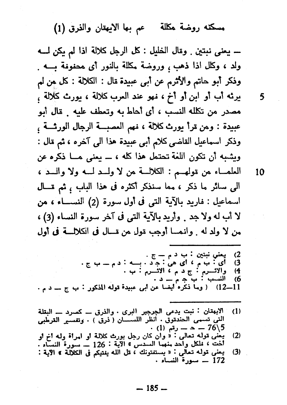مَسْكَنُهُ رَوْضَةٌ مُكَلَّلَةٌ ... عَمَّ بِهَا الْأَيْهُقَانُ وَالذُّرَقُ ... يَعْنِي نَبْتَيْنِ وَقَالَ الْخَلِيلُ كَلَّ الرَّجُلُ كَلَالَةً إِذَا لَمْ يَكُنْ لَهُ وَلَدٌ وَكَلَّلَ إِذَا ذَهَبَ وَرَوْضَةٌ مُكَلَّلَةٌ بِالنُّورِ أَيْ مَحْفُوفَةٌ بِهِ وَذَكَرَ أَبُو حَاتِمٍ وَالْأَثْرَمُ عَنْ أَبِي عُبَيْدَةَ قَالَ الْكَلَالَةُ كُلُّ مَنْ لَمْ يَرِثْهُ أَبٌ أَوِ ابْنٌ أَوْ أَخٌ فَهُوَ عِنْدَ الْعَرَبِ كَلَالَةٌ يُورَثُ كَلَالَةً مَصْدَرٌ مِنْ تَكَلَّلَهُ النَّسَبُ أَيْ أَحَاطَ بِهِ وَتَعَطَّفَ عَلَيْهِ قَالَ أَبُو عُبَيْدَةَ وَمَنْ قَرَأَ يُورَثُ كَلَالَةً فَهُمُ الْعَصَبَةُ الرِّجَالُ الْوَرَثَةُ وَذَكَرَ إِسْمَاعِيلُ الْقَاضِي كَلَامَ أَبِي عُبَيْدَةَ هَذَا إِلَى آخِرِهِ ثُمَّ قَالَ وَيُشْبِهُ أَنَّ تَكُونَ اللُّغَةُ تَحْتَمِلُ هَذَا كُلَّهُ يَعْنِي مَا ذَكَرَهُ عَنِ الْعُلَمَاءِ مِنْ قَوْلِهِمُ الْكَلَالَةُ مَنْ لَا وَلَدَ لَهُ وَلَا وَالِدَ إِلَى سَائِرِ مَا ذُكِرَ مِمَّا سَنَذْكُرُ أَكْثَرُهُ فِي هَذَا الْبَابِ ثُمَّ قَالَ إِسْمَاعِيلُ فَأُرِيدَ بِالْآيَةِ الَّتِي فِي أَوَّلِ سُورَةِ النِّسَاءِ مَنْ لَا أَبَ لَهُ وَلَا جَدَّ وَأُرِيدَ بِالْآيَةِ الَّتِي فِي آخِرِ سُورَةِ النِّسَاءِ مَنْ لَا وَلَدَ لَهُ وَإِنَّمَا أَوْجَبَ قَوْلُ مَنْ قَالَ فِي الْكَلَالَةِ فِي أَوَّلِ