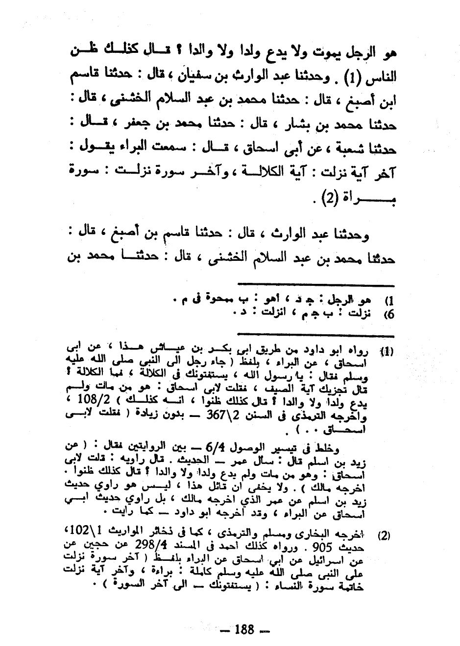 هُوَ الرَّجُلُ يَمُوتُ وَلَا يَدَعُ وَلَدًا وَلَا وَالِدًا قَالَ كَذَلِكَ ظَنَّ النَّاسُ وَحَدَّثَنَا عَبْدُ الْوَارِثِ بْنُ سُفْيَانَ قَالَ حَدَّثَنَا قَاسِمُ بْنُ أَصْبَغَ قَالَ حَدَّثَنَا مُحَمَّدُ بْنُ عَبْدِ السَّلَامِ الْخُشَنِيُّ قَالَ حَدَّثَنَا مُحَمَّدُ بْنُ بَشَّارٍ قَالَ حَدَّثَنَا مُحَمَّدُ بْنُ جَعْفَرٍ قَالَ حَدَّثَنَا شُعْبَةُ عَنْ أَبِي إِسْحَاقَ قَالَ سَمِعْتُ الْبَرَاءَ يَقُولُ آخِرُ آيَةٍ نَزَلَتْ آيَةُ الْكَلَالَةِ وَآخِرُ سُورَةٍ نزلت سورة براة! وَحَدَّثَنَا عَبْدُ الْوَارِثِ قَالَ حَدَّثَنَا قَاسِمُ بْنُ أَصْبَغَ قَالَ حَدَّثَنَا مُحَمَّدُ بْنُ عَبْدِ السَّلَامِ الْخُشَنِيُّ قَالَ حَدَّثَنَا مُحَمَّدُ بْنُ
