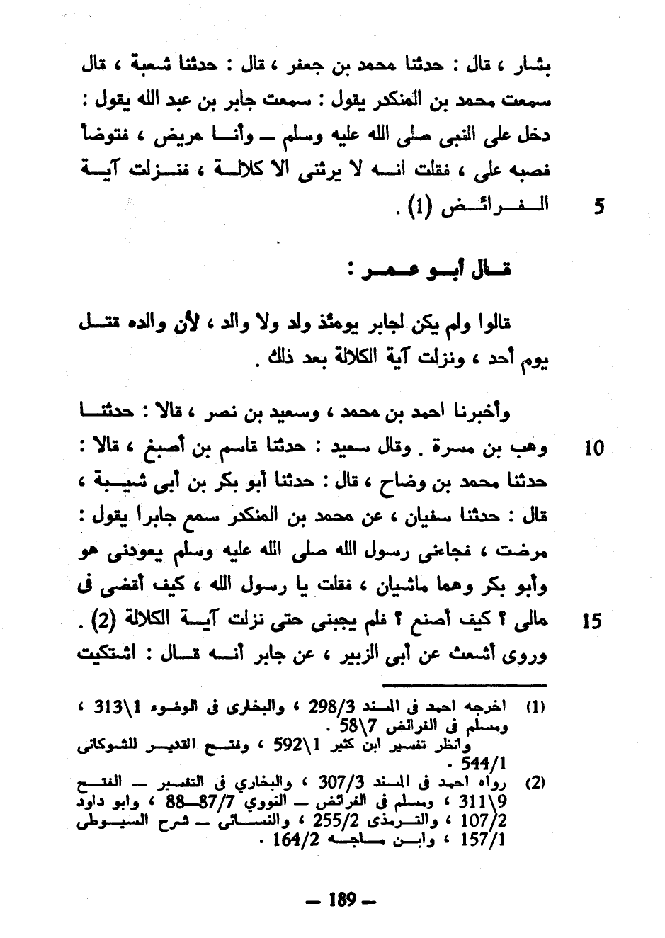 بَشَّارٍ قَالَ حَدَّثَنَا مُحَمَّدُ بْنُ جَعْفَرٍ قَالَ حَدَّثَنَا شُعْبَةُ قَالَ سَمِعْتُ مُحَمَّدَ بْنَ الْمُنْكَدِرِ يَقُولُ سَمِعْتُ جَابِرَ بْنَ عَبْدِ اللَّهِ يَقُولُ دَخَلَ عَلَيَّ النَّبِيُّ صَلَّى اللَّهُ عَلَيْهِ وَسَلَّمَ وَأَنَا مَرِيضٌ فَتَوَضَّأَ فَصَبَّهُ عَلَيَّ فَقُلْتُ إِنَّهُ لَا يَرِثُنِي إِلَّا كَلَالَةً فَنَزَلَتْ آيَةُ الْفَرَائِضِ قَالَ أَبُو عُمَرَ قَالُوا وَلَمْ يَكُنْ لِجَابِرٍ يَوْمَئِذٍ وَلَدٌ وَلَا وَالِدٌ لِأَنَّ وَالِدَهُ قُتِلَ يَوْمَ أُحُدٍ وَنَزَلَتْ آيَةُ الْكَلَالَةِ بَعْدَ ذَلِكَ وَأَخْبَرَنَا أَحْمَدُ بْنُ مُحَمَّدٍ وَسَعِيدُ بْنُ نَصْرٍ قَالَا حَدَّثَنَا وَهْبُ بْنُ مَسَرَّةَ وَقَالَ سَعِيدٌ حَدَّثَنَا قَاسِمُ بْنُ أَصْبَغَ قَالَا حَدَّثَنَا مُحَمَّدُ بْنُ وَضَّاحٍ قَالَ حَدَّثَنَا أَبُو بَكْرِ بْنُ أَبِي شَيْبَةَ قَالَ حَدَّثَنَا سُفْيَانُ عَنْ مُحَمَّدِ بْنِ الْمُنْكَدِرِ سَمِعَ جَابِرًا يَقُولُ مَرِضْتُ فَجَاءَنِي رَسُولُ اللَّهِ صَلَّى اللَّهُ عَلَيْهِ وَسَلَّمَ يَعُودُنِي هُوَ وَأَبُو بَكْرٍ وَهُمَا مَاشِيَانِ فَقُلْتُ يَا رَسُولَ اللَّهِ كَيْفَ أَقْضِي فِي مَالِي كَيْفَ أَصْنَعُ فَلَمْ يُجِبْنِي حَتَّى نَزَلَتْ آيَةُ الْكَلَالَةِ وروى أشعث عَنْ أَبِي الزُّبَيْرِ عَنْ جَابِرٍ أَنَّهُ قَالَ اشتكيت