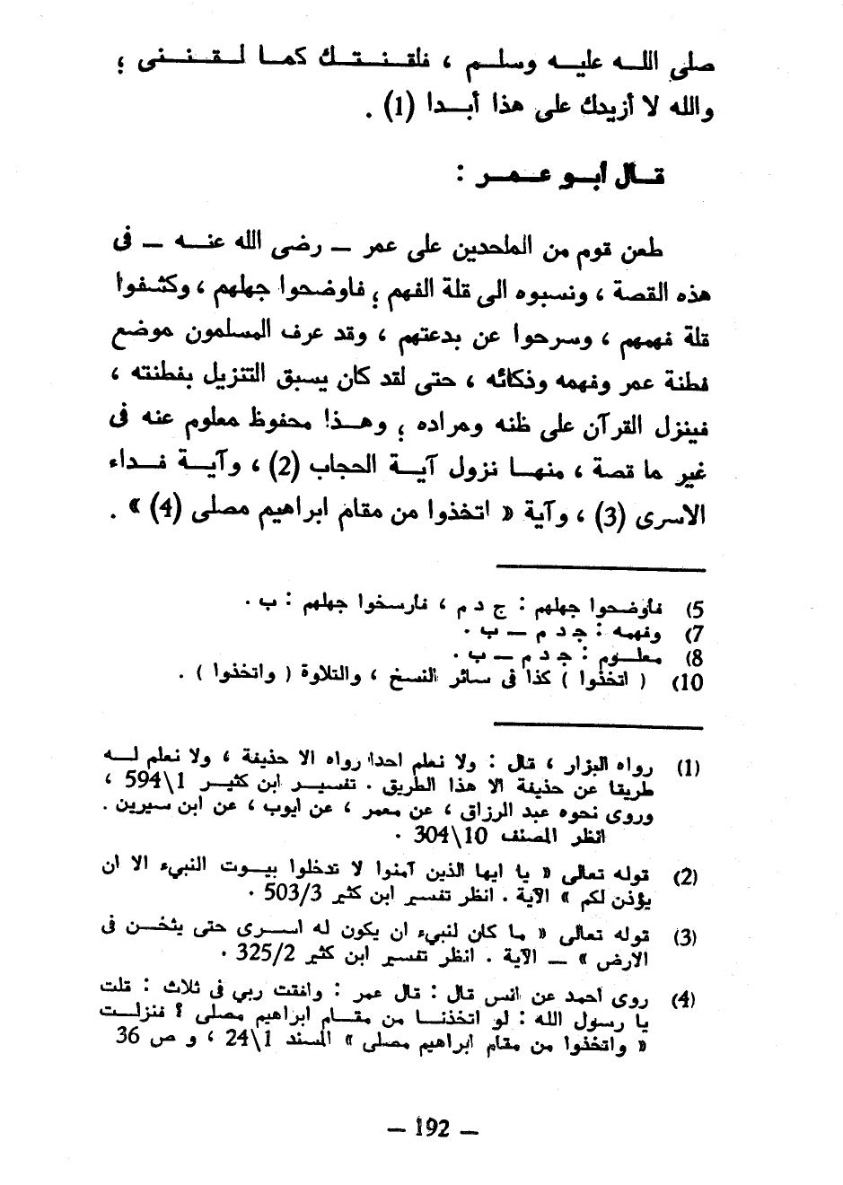 صَلَّى اللَّهُ عَلَيْهِ وَسَلَّمَ فَلَقَّنْتُكَ كَمَا لَقَّنَنِي وَاللَّهِ لَا أَزِيدُكَ عَلَى هَذَا أَبَدًا قَالَ أَبُو عُمَرَ طَعَنَ قَوْمٌ مِنَ الْمُلْحِدِينَ عَلَى عُمَرَ رَضِيَ اللَّهُ عَنْهُ فِي هَذِهِ الْقِصَّةِ وَنَسَبُوهُ إِلَى قِلَّةِ الْفَهْمِ فَأَوْضَحُوا جَهْلَهُمْ وَكَشَفُوا قِلَّةَ فَهْمِهِمْ وَسَرَحُوا عَنْ بِدْعَتِهِمْ وَقَدْ عَرَفَ الْمُسْلِمُونَ مَوْضِعَ فَطِنَةِ عُمَرَ وَفَهْمِهِ وَذَكَائِهِ حَتَّى لَقَدْ كَانَ يَسْبِقُ التَّنْزِيلَ بِفِطْنَتِهِ فَيَنْزِلُ الْقُرْآنُ عَلَى ظَنِّهِ وَمُرَادِهِ وَهَذَا مَحْفُوظٌ مَعْلُومٌ عَنْهُ فِي غَيْرِ مَا قِصَّةٍ مِنْهَا نُزُولُ آيَةِ الْحِجَابِ وَآيَةِ فِدَاءِ الْأَسْرَى وَآيَةِ وَاتَّخِذُوا مِنْ مَقَامِ إِبْرَاهِيمَ مُصَلًّى