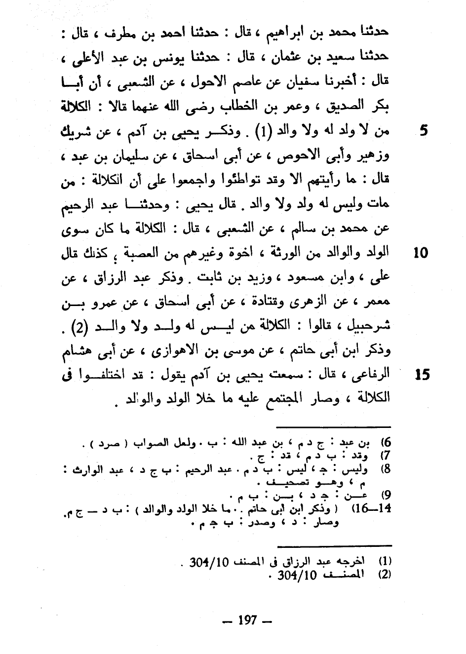 حَدَّثَنَا مُحَمَّدُ بْنُ إِبْرَاهِيمَ قَالَ حَدَّثَنَا أَحْمَدُ بْنُ مُطَرِّفٍ قَالَ حَدَّثَنَا سَعِيدُ بْنُ عُثْمَانَ قَالَ حَدَّثَنَا يُونُسُ بْنُ عَبْدِ الْأَعْلَى قَالَ أَخْبَرَنَا سُفْيَانُ عَنْ عَاصِمٍ الْأَحْوَلِ عَنِ الشَّعْبِيِّ أَنَّ أَبَا بَكْرٍ الصِّدِّيقَ وَعُمَرَ بْنَ الْخَطَّابِ رَضِيَ اللَّهُ عَنْهُمَا قَالَا الْكَلَالَةُ مَنْ لَا وَلَدَ لَهُ وَلَا وَالِدَ وَذَكَرَ يَحْيَى بْنُ آدَمَ عَنْ شَرِيكٍ وَزُهَيْرٍ وَأَبِي الْأَحْوَصِ عَنْ أَبِي إِسْحَاقَ عَنْ سُلَيْمَانَ بْنِ عَبْدٍ قَالَ مَا رَأَيْتُهُمْ إِلَّا وَقَدْ تَوَاطَئُوا وَأَجْمَعُوا عَلَى أَنَّ الْكَلَالَةَ مَنْ مَاتَ وَلَيْسَ لَهُ وَلَدٌ وَلَا وَالِدٌ قَالَ يَحْيَى وَحَدَّثَنَا عَبْدُ الرَّحِيمِ عَنْ مُحَمَّدِ بْنِ سَالِمٍ عَنِ الشَّعْبِيِّ قَالَ الْكَلَالَةُ مَا كَانَ سِوَى الْوَلَدِ وَالْوَالِدِ مِنَ الْوَرَثَةِ إِخْوَةٌ وَغَيْرُهُمْ مِنَ الْعَصَبَةِ كَذَلِكَ قَالَ عَلِيٌّ وَابْنُ مَسْعُودٍ وَزَيْدُ بْنُ ثَابِتٍ وَذَكَرَ عَبْدُ الرَّزَّاقِ عَنْ مَعْمَرٍ عَنِ الزُّهْرِيِّ وَقَتَادَةَ عَنْ أَبِي إِسْحَاقَ عَنْ عَمْرِو بْنِ شُرَحْبِيلَ قَالُوا الْكَلَالَةُ مَنْ لَيْسَ لَهُ وَلَدٌ وَلَا وَالِدٌ وَذَكَرَ ابْنُ أَبِي حَاتِمٍ عَنْ مُوسَى بْنِ الْأَهْوَازِيِّ عَنْ أَبِي هِشَامٍ الرِّفَاعِيِّ قَالَ سَمِعْتُ يَحْيَى بْنَ آدَمَ يَقُولُ قَدِ اخْتَلَفُوا فِي الْكَلَالَةِ وَصَارَ الْمُجْتَمَعُ عَلَيْهِ مَا خَلَا الْوَلَدَ وَالْوَالِدَ