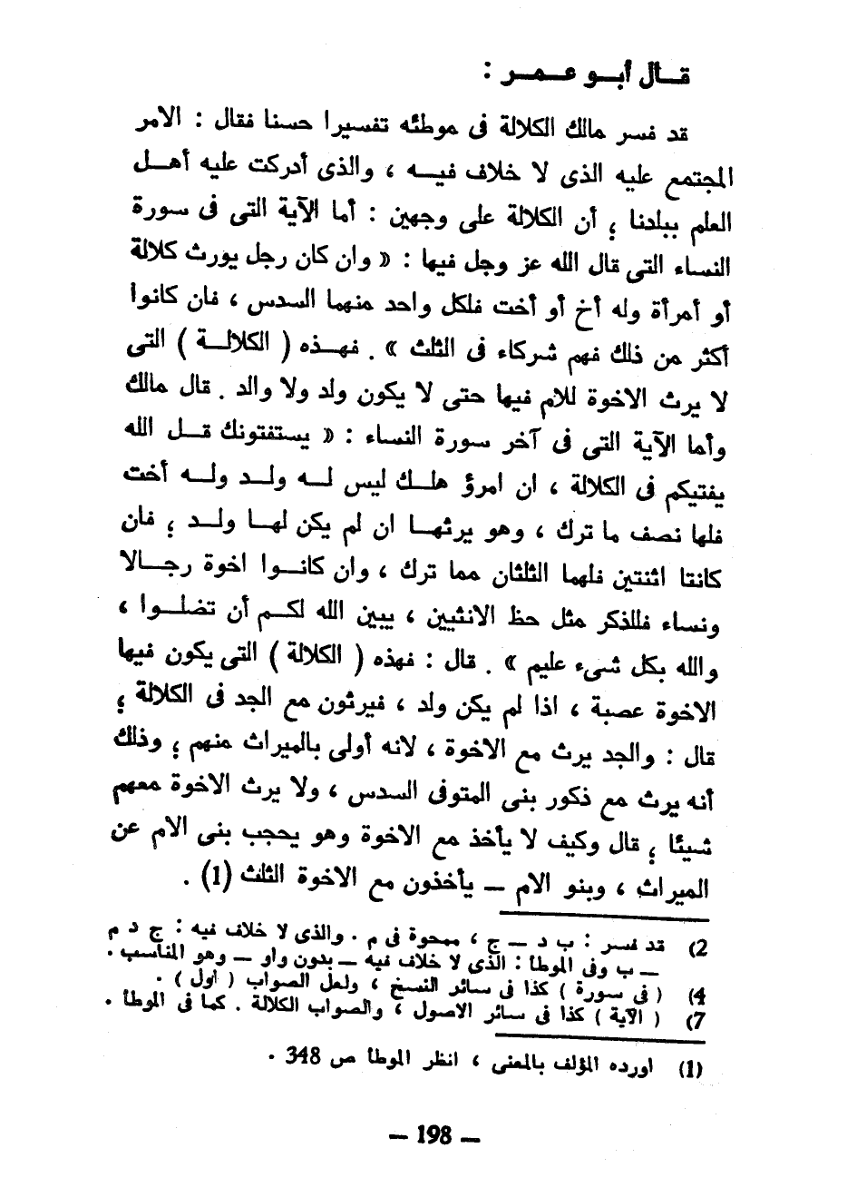 قَالَ أَبُو عُمَرَ قَدْ فَسَّرَ مَالِكٌ الْكَلَالَةَ في موطئه تفسيرا حسنا فَقَالَ الْأَمْرُ الْمُجْتَمَعُ عَلَيْهِ الَّذِي لَا خِلَافَ فِيهِ وَالَّذِي أَدْرَكْتُ عَلَيْهِ أَهْلَ الْعِلْمِ بِبَلَدِنَا أَنَّ الْكَلَالَةَ عَلَى وَجْهَيْنِ أَمَّا الْآيَةُ الَّتِي فِي سُورَةِ النِّسَاءِ الَّتِي قَالَ اللَّهُ عَزَّ وَجَلَّ فِيهَا وَإِنْ كَانَ رَجُلٌ يُورَثُ كَلَالَةً أَوِ امْرَأَةٌ وَلَهُ أَخٌ أَوْ أُخْتٌ فَلِكُلِّ وَاحِدٍ مِنْهُمَا السُّدُسُ فَإِنْ كَانُوا أَكْثَرَ مِنْ ذَلِكَ فَهُمْ شُرَكَاءُ فِي الثُّلُثِ فَهَذِهِ (الْكَلَالَةُ) الَّتِي لَا يَرِثُ الْإِخْوَةُ لِلْأُمِّ فِيهَا حَتَّى لَا يَكُونَ وَلَدٌ وَلَا وَالِدٌ قَالَ مَالِكٌ وَأَمَّا الْآيَةُ الَّتِي فِي آخِرِ سُورَةِ النِّسَاءِ يَسْتَفْتُونَكَ قُلِ اللَّهُ يُفْتِيكُمْ فِي الْكَلَالَةِ إِنِ امْرُؤٌ هَلَكَ لَيْسَ لَهُ وَلَدٌ وَلَهُ أُخْتٌ فَلَهَا نِصْفُ مَا تَرَكَ وَهُوَ يَرِثُهَا إِنْ لَمْ يَكُنْ لَهَا وَلَدٌ فَإِنْ كَانَتَا اثْنَتَيْنِ فَلَهُمَا الثُّلُثَانِ مِمَّا تَرَكَ وَإِنْ كَانُوا إِخْوَةً رِجَالًا وَنِسَاءً فَلِلذَّكَرِ مِثْلُ حَظِّ الْأُنْثَيَيْنِ يُبَيِّنُ اللَّهُ لَكُمْ أَنْ تَضِلُّوا وَاللَّهُ بِكُلِّ شَيْءٍ عَلِيمٌ قَالَ فَهَذِهِ (الْكَلَالَةُ) الَّتِي يَكُونُ فِيهَا الْإِخْوَةُ عَصَبَةً إِذَا لَمْ يَكُنْ وَلَدٌ فَيَرِثُونَ مَعَ الْجَدِّ فِي الْكَلَالَةِ قَالَ وَالْجَدُّ يَرِثُ مَعَ الْإِخْوَةِ لِأَنَّهُ أَوْلَى بِالْمِيرَاثِ مِنْهُمْ وَذَلِكَ أَنَّهُ يَرِثُ مَعَ ذُكُورِ بَنِي الْمُتَوَفَّى السُّدُسَ وَلَا يَرِثُ الْإِخْوَةُ مَعَهُمْ شَيْئًا قَالَ وَكَيْفَ لَا يَأْخُذُ مَعَ الْإِخْوَةِ وَهُوَ يَحْجِبُ بَنَى الْأُمِّ عَنِ الْمِيرَاثِ وَبَنُو الْأُمِّ يَأْخُذُونَ مَعَ الأخوة الثلث