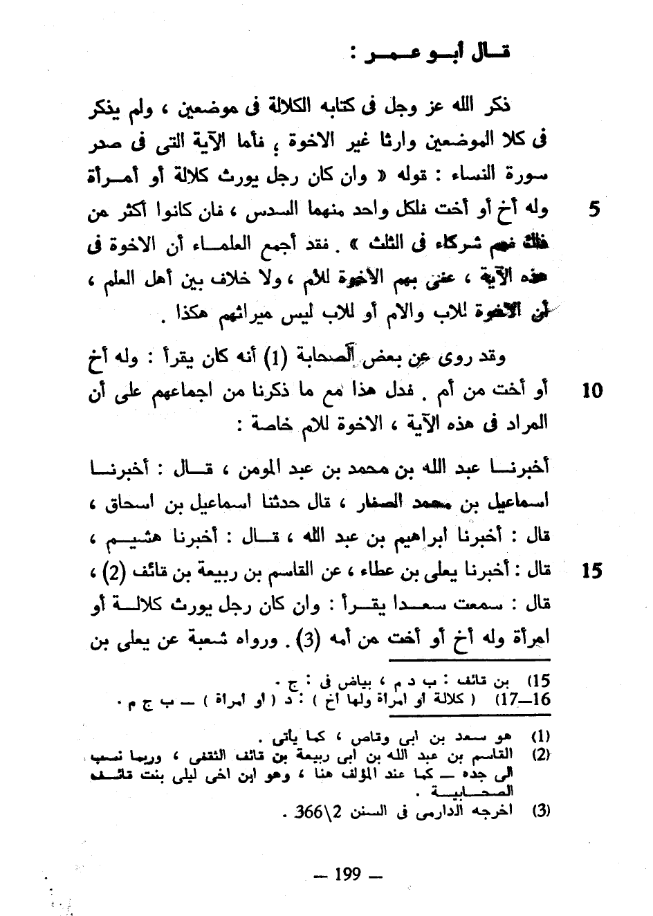 قَالَ أَبُو عُمَرَ ذَكَرَ اللَّهُ عَزَّ وَجَلَّ فِي كِتَابِهِ الْكَلَالَةَ فِي مَوْضِعَيْنِ وَلَمْ يَذْكُرْ فِي كِلَا الْمَوْضِعَيْنِ وَارِثًا غَيْرَ الْإِخْوَةِ فَأَمَّا الْآيَةُ الَّتِي فِي صَدْرِ سُورَةِ النِّسَاءِ قَوْلُهُ وَإِنْ كَانَ رَجُلٌ يُورَثُ كَلَالَةً أَوِ امْرَأَةٌ وَلَهُ أَخٌ أَوْ أُخْتٌ فَلِكُلِّ وَاحِدٍ مِنْهُمَا السُّدُسُ فَإِنْ كَانُوا أَكْثَرَ مِنْ ذَلِكَ فَهُمْ شُرَكَاءُ فِي الثُّلُثِ فَقَدْ أَجْمَعَ الْعُلَمَاءُ أَنَّ الْإِخْوَةَ فِي هَذِهِ الْآيَةِ عُنِيَ بِهِمُ الْإِخْوَةُ لِلْأُمِّ وَلَا خِلَافَ بَيْنِ أَهْلِ الْعِلْمِ أَنَّ الْإِخْوَةَ لِلْأَبِ وَالْأُمِّ أَوْ لِلْأَبِ لَيْسَ مِيرَاثُهُمْ هَكَذَا وَقَدْ رُوِيَ عَنْ بَعْضِ الصَّحَابَةِ أَنَّهُ كَانَ يَقْرَأُ وَلَهُ أَخٌ أَوْ أُخْتٌ مِنْ أُمٍّ فَدَلَّ هَذَا مَعَ مَا ذَكَرْنَا مِنْ إِجْمَاعِهِمْ عَلَى أَنَّ الْمُرَادَ فِي هَذِهِ الْآيَةِ الْإِخْوَةُ لِلْأُمِّ خَاصَّةً أَخْبَرَنَا عَبْدُ اللَّهِ بْنُ مُحَمَّدِ بْنِ عَبْدِ الْمُؤْمِنِ قَالَ أَخْبَرَنَا إِسْمَاعِيلُ بْنُ مُحَمَّدٍ الصَّفَارُ قَالَ حَدَّثَنَا إِسْمَاعِيلُ بْنُ إِسْحَاقَ قَالَ أَخْبَرَنَا إِبْرَاهِيمُ بْنُ عَبْدِ اللَّهِ قَالَ أَخْبَرَنَا هُشَيْمٌ قَالَ أَخْبَرَنَا يَعْلَى بْنُ عَطَاءٍ عَنِ الْقَاسِمِ بْنِ رَبِيعَةَ بْنِ قَائِفٍ قَالَ سَمِعْتُ سَعْدًا يَقْرَأُ وَإِنْ كَانَ رَجُلٌ يُورَثُ كَلَالَةً أَوِ امْرَأَةٌ وَلَهُ أَخٌ أَوْ أُخْتٌ مِنْ أُمِّهِ وَرَوَاهُ شُعْبَةُ عَنْ يَعْلَى بن