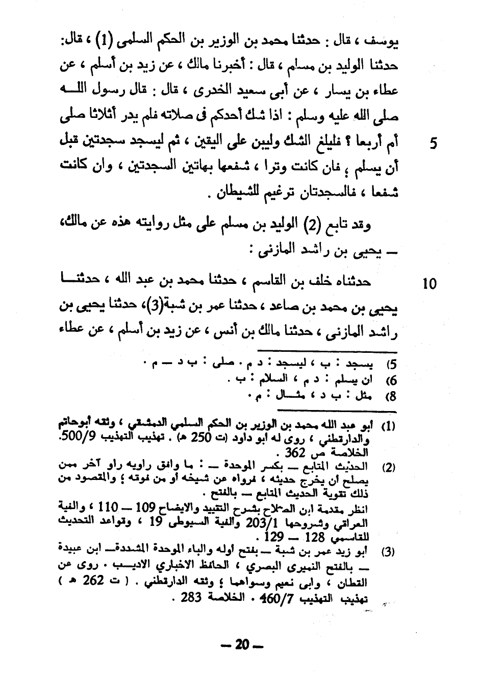 يُوسُفَ قَالَ حَدَّثَنَا مُحَمَّدُ بْنُ الْوَزِيرِ بْنِ الْحَكَمِ السُّلَمِيُّ قَالَ حَدَّثَنَا الْوَلِيدُ بْنُ مُسْلِمٍ قَالَ أَخْبَرَنَا مَالِكٌ عَنْ زَيْدِ بْنِ أَسْلَمَ عَنْ عَطَاءِ بْنِ يَسَارٍ عَنْ أَبِي سَعِيدٍ الْخُدْرِيِّ قَالَ قَالَ رَسُولُ اللَّهِ صَلَّى اللَّهُ عَلَيْهِ وَسَلَّمَ إِذَا شَكَّ أَحَدُكُمْ فِي صَلَاتِهِ فَلَمْ يَدْرِ أَثَلَاثًا صَلَّى أَمْ أَرْبَعًا فَلْيُلْغِ الشَّكَّ وَلْيَبْنِ عَلَى الْيَقِينِ ثُمَّ لِيَسْجُدْ سَجْدَتَيْنِ قَبْلَ أَنْ يُسَلِّمَ فَإِنْ كَانَتْ وِتْرًا شَفَعَهَا بِهَاتَيْنِ السَّجْدَتَيْنِ وَإِنْ كَانَتْ شَفْعًا فَالسَّجْدَتَانِ تَرْغِيمٌ لِلشَّيْطَانِ وَقَدْ تَابَعَ الْوَلِيدَ بْنَ مُسْلِمٍ عَلَى مِثْلِ رِوَايَتِهِ هَذِهِ عَنْ مَالِكٍ يَحْيَى بْنُ رَاشِدٍ الْمَازِنِيُّ حَدَّثَنَاهُ خَلَفُ بْنُ الْقَاسِمِ حَدَّثَنَا مُحَمَّدُ بْنُ عَبْدِ اللَّهِ حَدَّثَنَا يَحْيَى بْنُ مُحَمَّدِ بْنِ صَاعِدٍ حَدَّثَنَا عُمَرُ بْنُ شَبَّةَ حَدَّثَنَا يَحْيَى بْنُ رَاشِدٍ الْمَازِنِيُّ حَدَّثَنَا مَالِكِ بْنِ أَنَسٍ عَنْ زَيْدِ بْنِ أَسْلَمَ عن عطاء