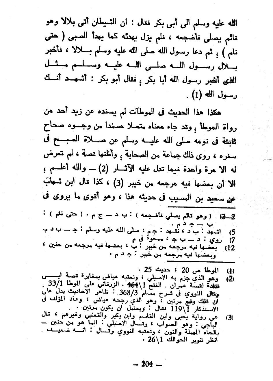 اللَّهُ عَلَيْهِ وَسَلَّمَ إِلَى أَبِي بَكْرٍ فَقَالَ إِنَّ الشَّيْطَانَ أَتَى بِلَالًا وَهُوَ قَائِمٌ يُصَلِّي فَأَضْجَعَهُ فَلَمْ يَزَلْ يُهَدِّئُهُ كَمَا يُهَدَّأُ الصَّبِيُّ (حَتَّى نَامَ) ثُمَّ دَعَا رَسُولَ اللَّهِ صَلَّى اللَّهُ عَلَيْهِ وَسَلَّمَ بِلَالًا فَأَخْبَرَ بِلَالٌ رَسُولِ اللَّهِ صَلَّى اللَّهُ عَلَيْهِ وَسَلَّمَ مِثْلَ الَّذِي أَخْبَرَ رَسُولُ اللَّهِ أَبَا بَكْرٍ فَقَالَ أَبُو بَكْرٍ أَشْهَدُ أَنَّكَ رَسُولُ اللَّهِ هَكَذَا هَذَا الْحَدِيثُ فِي الْمُوطَآتِ لَمْ يُسْنِدْهُ عَنْ زَيْدٍ أَحَدٌ مِنْ رُوَاةِ الْمُوَطَّأِ وَقَدْ جَاءَ مَعْنَاهُ مُتَّصِلًا مُسْنَدًا مِنْ وُجُوهٍ صِحَاحٍ ثَابِتَةٍ فِي نَوْمِهِ صَلَّى اللَّهُ عَلَيْهِ وَسَلَّمَ عَنْ صَلَاةِ الصُّبْحِ فِي سَفَرِهِ رَوَى ذَلِكَ جَمَاعَةٌ مِنَ الصَّحَابَةِ وَأَظُنُّهَا قِصَّةٌ لَمْ تَعْرِضْ لَهُ إِلَّا مَرَّةً وَاحِدَةً فِيمَا تَدُلُّ عَلَيْهِ الْآثَارُ وَاللَّهُ أَعْلَمُ إِلَّا أَنَّ بَعْضَهَا فِيهِ مَرْجِعُهُ مِنْ خَيْبَرَ كَذَا قَالَ ابْنُ شِهَابٍ عَنْ سَعِيدِ بْنِ الْمُسَيَّبِ فِي حَدِيثِهِ هَذَا وَهُوَ أَقْوَى مَا يُرْوَى فِي
