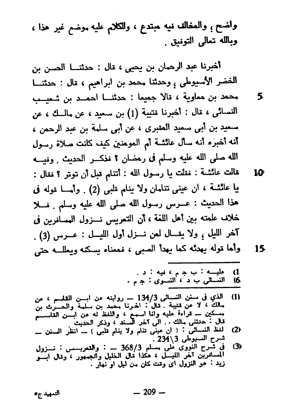 وَاضِحٌ وَالْمُخَالِفُ فِيهِ مُبْتَدَعٌ وَلِلْكَلَامِ عَلَيْهِ مَوْضِعٌ غَيْرُ هَذَا وَبِاللَّهِ تَعَالَى التَّوْفِيقُ أَخْبَرَنَا عَبْدُ الرَّحْمَنِ بْنُ يَحْيَى قَالَ حَدَّثَنَا الْحَسَنُ بن الْخَضِرِ الْأَسْيُوطِيُّ وَحَدَّثَنَا مُحَمَّدُ بْنُ إِبْرَاهِيمَ قَالَ حَدَّثَنَا مُحَمَّدُ بْنُ مُعَاوِيَةَ قَالَا جَمِيعًا حَدَّثَنَا أَحْمَدُ بْنُ شُعَيْبٍ النَّسَائِيُّ قَالَ أَخْبَرَنَا قُتَيْبَةُ بْنُ سَعِيدٍ عَنْ مَالِكٍ عَنْ سَعِيدِ بْنِ أَبِي سَعِيدٍ الْمَقْبُرِيِّ عَنْ أَبِي سَلَمَةَ بْنِ عَبْدِ الرَّحْمَنِ أَنَّهُ أَخْبَرَهُ أَنَّهُ سَأَلَ عَائِشَةَ أُمَّ الْمُؤْمِنِينَ كَيْفَ كَانَتْ صَلَاةُ رَسُولِ اللَّهِ صَلَّى اللَّهُ عَلَيْهِ وَسَلَّمَ فِي رَمَضَانَ فَذَكَرَ الْحَدِيثَ وَفِيهِ قَالَتْ عَائِشَةُ فَقُلْتُ يَا رَسُولَ اللَّهِ أَتَنَامُ قَبْلَ أَنْ تُوتِرَ فَقَالَ يَا عَائِشَةُ إِنَّ عَيْنَيَّ تَنَامَانِ وَلَا يَنَامُ قَلْبِي وَأَمَّا قَوْلُهُ فِي هَذَا الْحَدِيثِ عَرَّسَ رَسُولِ اللَّهِ صَلَّى اللَّهُ عَلَيْهِ وَسَلَّمَ فَلَا خِلَافَ عَلِمْتُهُ بَيْنَ أَهْلِ اللُّغَةِ أَنَّ التَّعْرِيسَ نُزُولُ الْمُسَافِرِينَ فِي آخِرِ اللَّيْلِ وَلَا يُقَالُ لِمَنْ نَزَلَ أَوَّلُ اللَّيْلِ عَرَّسَ وَأَمَّا قَوْلُهُ يُهَدِّئُهُ كَمَا يُهَدَّأُ الصَّبِيُّ فَمَعْنَاهُ يُسَكِّنُهُ وَيُعَلِّلُهُ حَتَّى